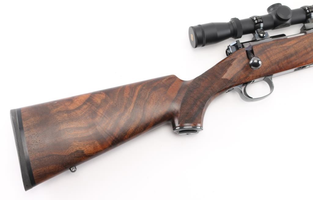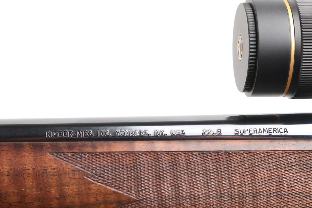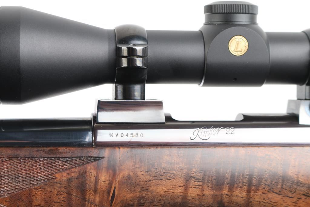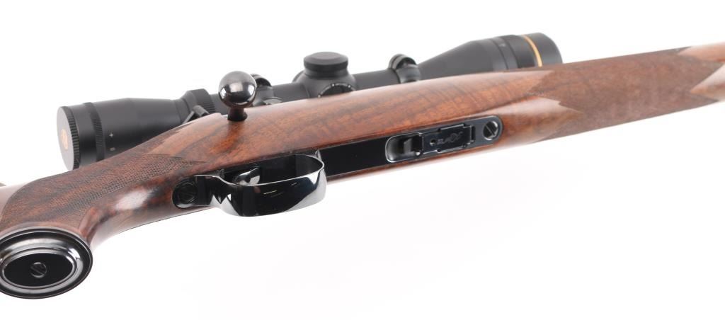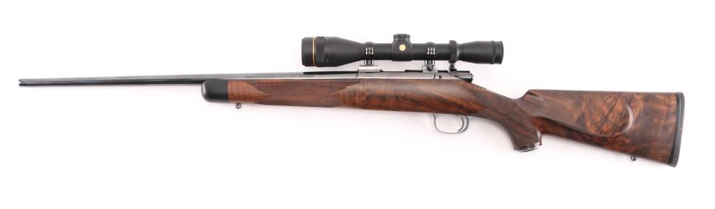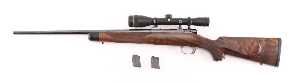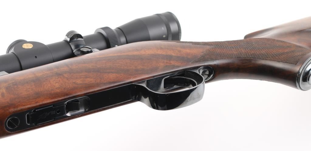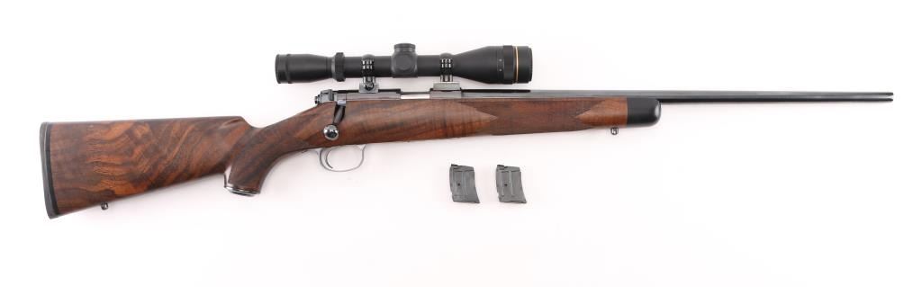 Bolt action rifle. Marked "Kimber Yonkers, NY". Features 22 inch medium-heavy contour barrel, hinged floorplate, manual safety, 2 piece dovetail style rings and bases. Fed from a detachable 5-rd magazine, Stock is highly figured dark walnut with contrasting black forend tip, polyurethane finish, steel grip cap, European style sling swivel studs, solid rubber recoil pad, checkered wrap-around panel at forend, and checkered panels at wrist. Shadow line cheek piece for right-handed shooting. Plum colored receiver. Comes with plastic case with a extra two 5-rd magazines, (3) total. Bore is excellent. Retains 99% dark high polish bluing. Stock is excellent. Mounts a Leupold VX-2 3-9x33 scope with fine crosshairs; view thru scope is clear and bright. Condition is NRA Excellent, Modern Firearm.