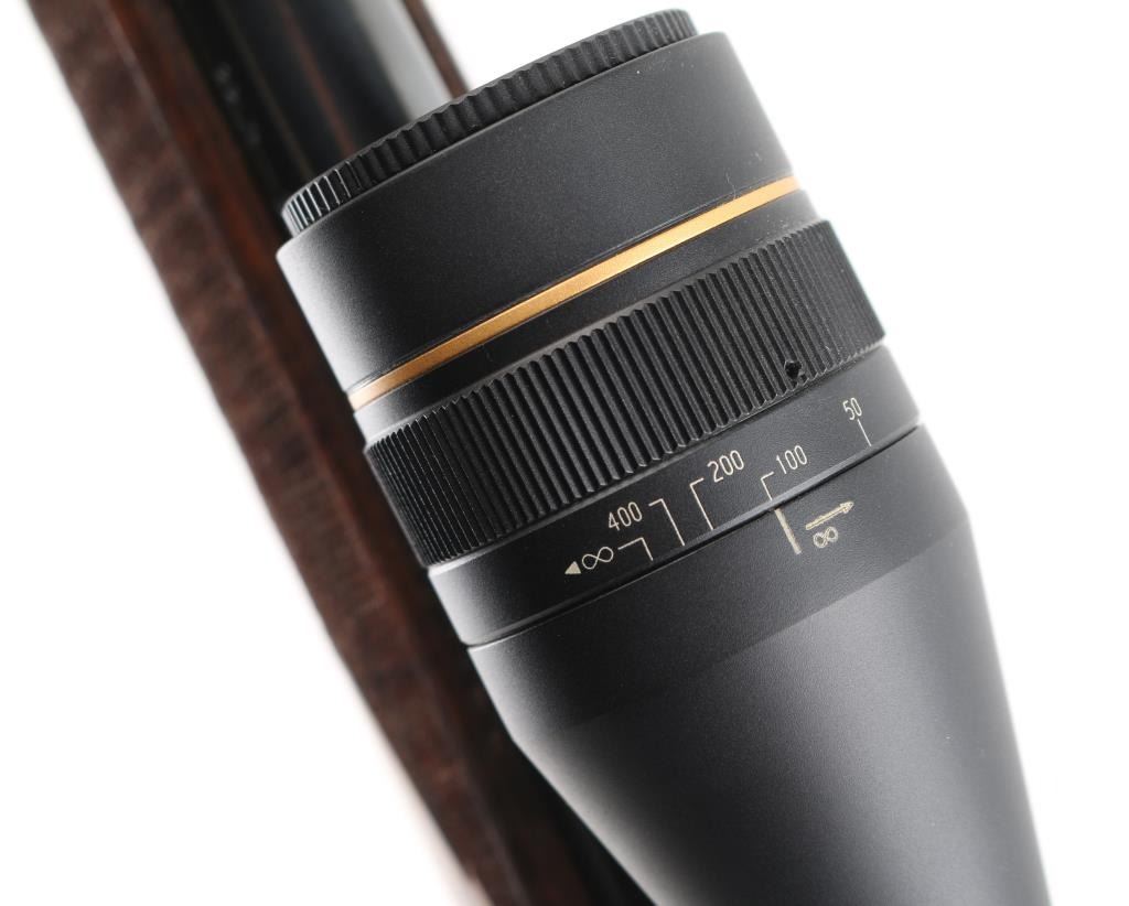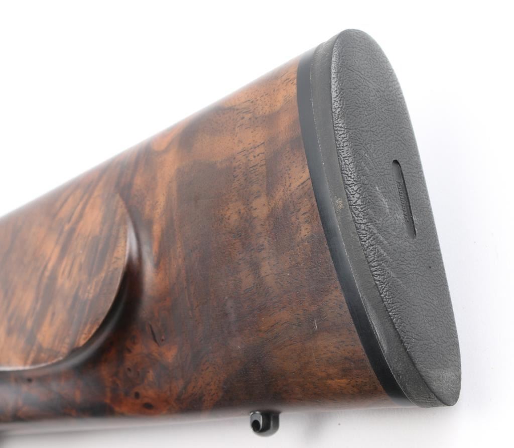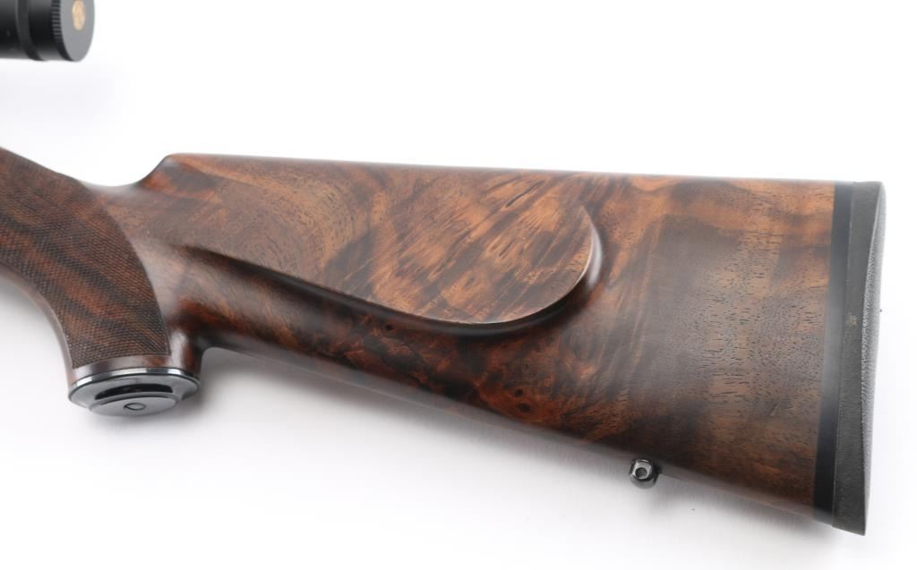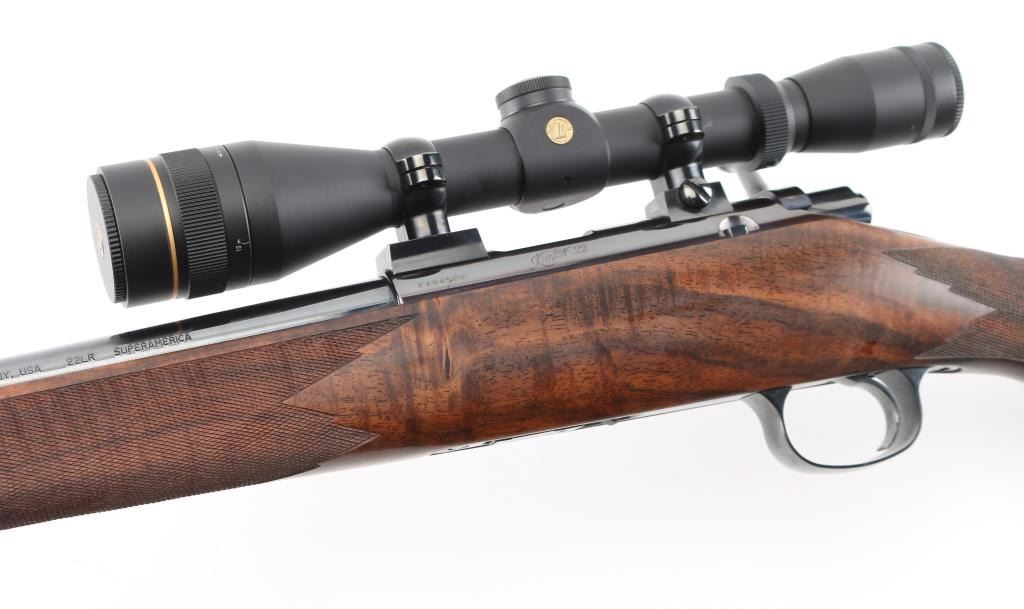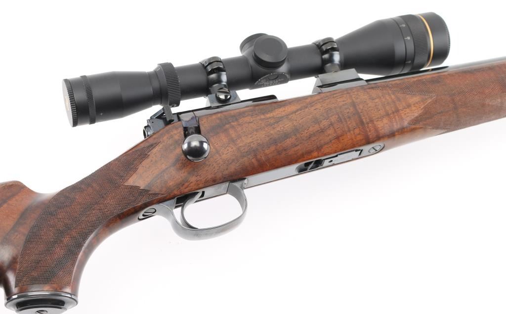 Bolt action rifle. Marked "Kimber Yonkers, NY". Features 22 inch medium-heavy contour barrel, hinged floorplate, manual safety, 2 piece dovetail style rings and bases. Fed from a detachable 5-rd magazine, Stock is highly figured dark walnut with contrasting black forend tip, polyurethane finish, steel grip cap, European style sling swivel studs, solid rubber recoil pad, checkered wrap-around panel at forend, and checkered panels at wrist. Shadow line cheek piece for right-handed shooting. Plum colored receiver. Comes with plastic case with a extra two 5-rd magazines, (3) total. Bore is excellent. Retains 99% dark high polish bluing. Stock is excellent. Mounts a Leupold VX-2 3-9x33 scope with fine crosshairs; view thru scope is clear and bright. Condition is NRA Excellent, Modern Firearm.