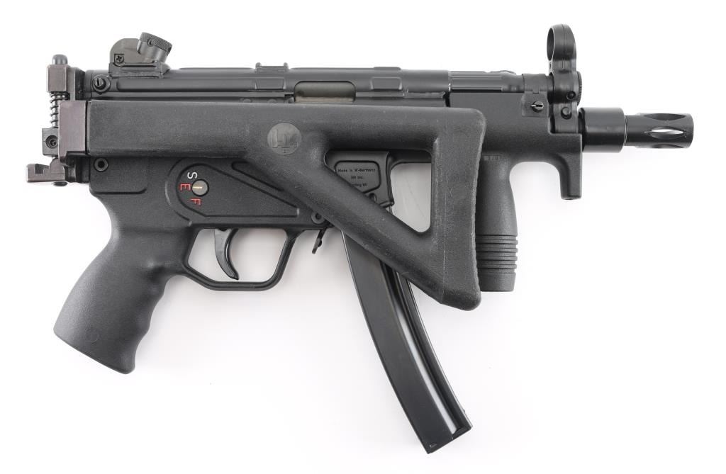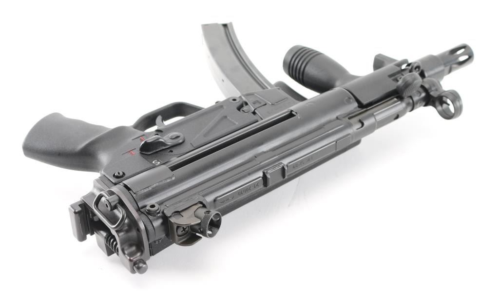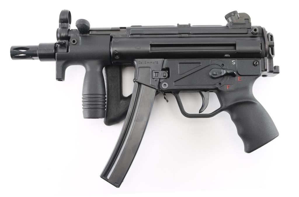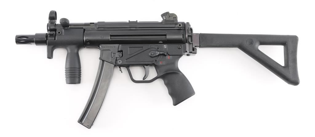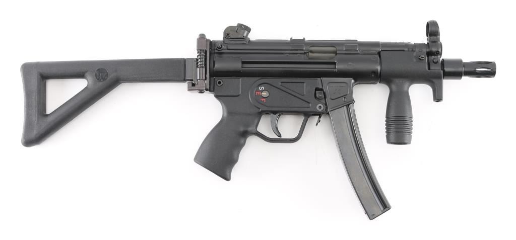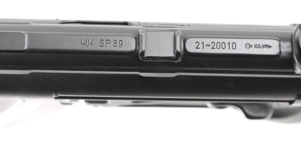 w/ Heckler & Koch SP89 9mm SN: 21-20010 Fully transferable select fire 9x19mm machinegun. US made auto sear installed into the German HK factory made SP89 host results in a perfect example of a desirable high end German made submachinegun. "KA" (1990) date code on receiver. Fires from closed bolt in full and semi. Features approx 5.5" barrel, USCRC marked bird cage flash hider, matte black finish, black polymer furniture (forend with vertical foregrip, side folding shoulder stock, "SEF" trigger housing with pistol grip), forward sling eye, rear sling swivel, adjustable sights (protected post front & turret style rear), manual safety/selector on left side at top of grip, dual mode (flipper, button) mag release. Machine gun is in perfect condition overall, with bright bore and few minor edge losses. Includes one excellent condition steel 30 rd magazine (date code "IJ"). Condition is NRA Perfect ***NFA Firearm*** ***Fully Transferable***