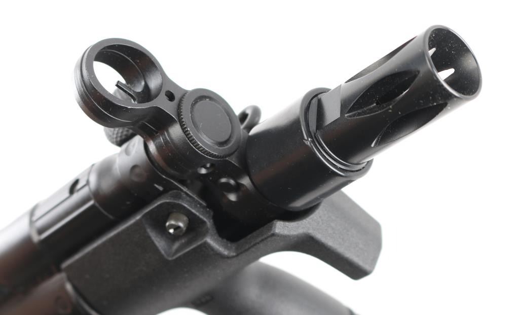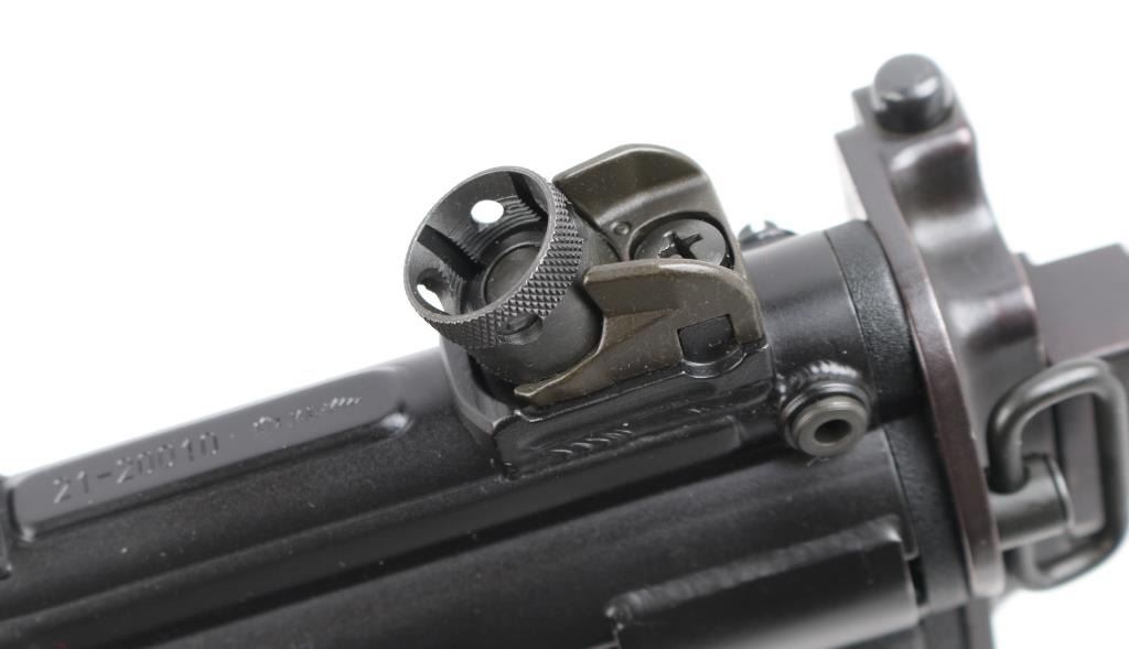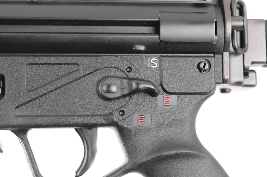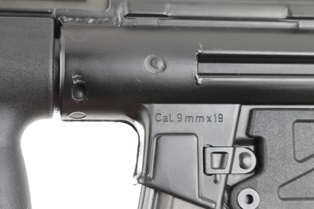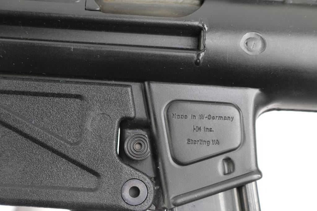 w/ Heckler & Koch SP89 9mm SN: 21-20010 Fully transferable select fire 9x19mm machinegun. US made auto sear installed into the German HK factory made SP89 host results in a perfect example of a desirable high end German made submachinegun. "KA" (1990) date code on receiver. Fires from closed bolt in full and semi. Features approx 5.5" barrel, USCRC marked bird cage flash hider, matte black finish, black polymer furniture (forend with vertical foregrip, side folding shoulder stock, "SEF" trigger housing with pistol grip), forward sling eye, rear sling swivel, adjustable sights (protected post front & turret style rear), manual safety/selector on left side at top of grip, dual mode (flipper, button) mag release. Machine gun is in perfect condition overall, with bright bore and few minor edge losses. Includes one excellent condition steel 30 rd magazine (date code "IJ"). Condition is NRA Perfect ***NFA Firearm*** ***Fully Transferable***