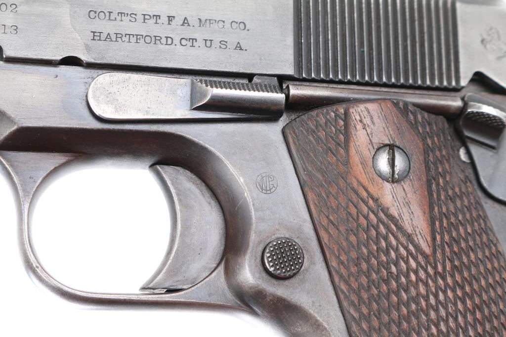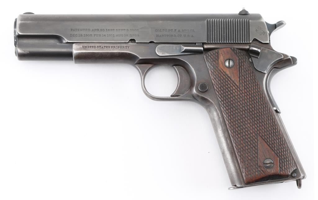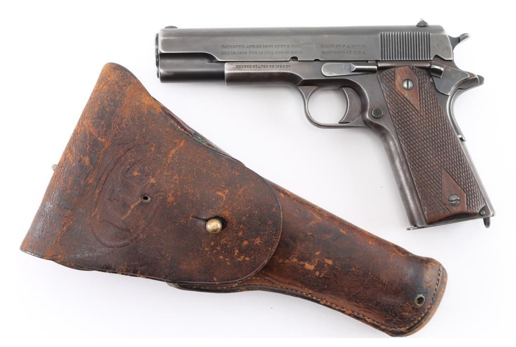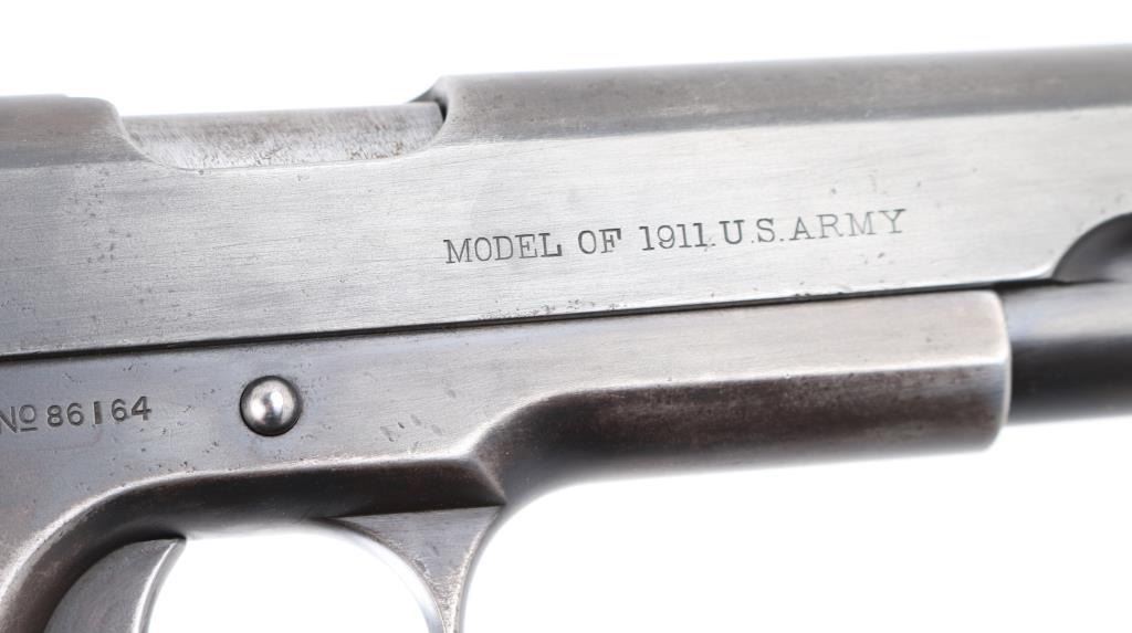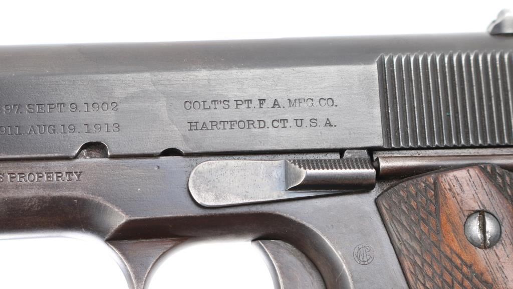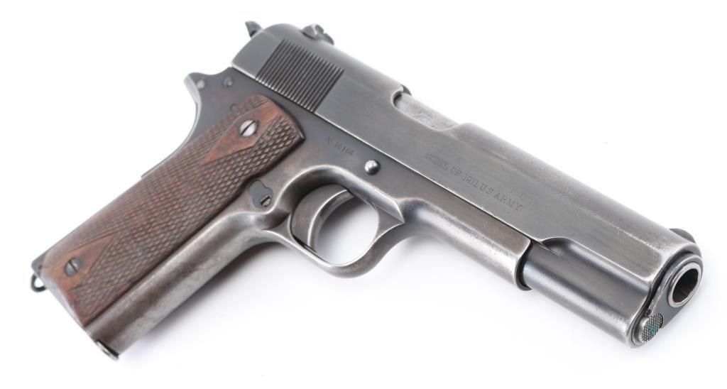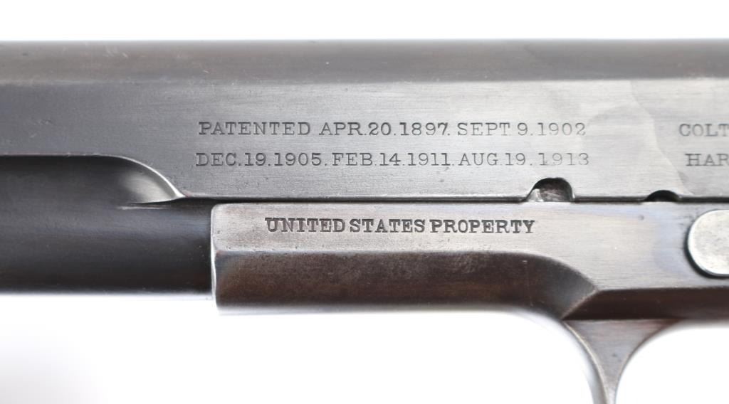 U.S. Military Issued sidearm. Early pre-war pistol manufactured 1914. "WGP" in circle inspectors mark above magazine release. (Major Walther G. Penfield). Right Slide stamped "Model of 1911. U.S. Army" Colt's Patent's and Address in two lines on left slide with "Rampant Colt". "United States property" on left frame. "H" stamped on the rear of the slide above the firing pin stop plate. Smooth, flat mainspring housing. Grip safety. Lanyard ring. Blued finish. Brown checkered wood "Diamond" grips. Bore appears very good bright. Grips are very good. Action is crisp/tight. Blued finish is about 75% with edge wear/minor scratches. Handling loss to the mainspring housing and fore grip. Comes with one 8-rd magazine, unmarked, and a Rare Rock Island Arsenal marked flap holster dated 1916, first year RIA made holsters for the M1911. Arsenal markings are very feint, Inspected by "T.C.C. Flap has small hole in flap. Old Arsenal re-finish, NRA Condition-Good+. C&R Firearm.