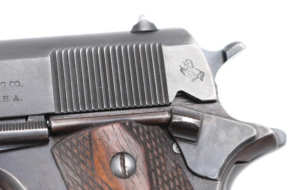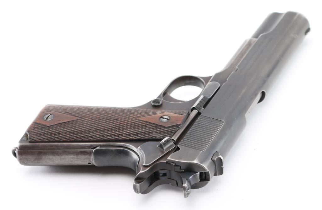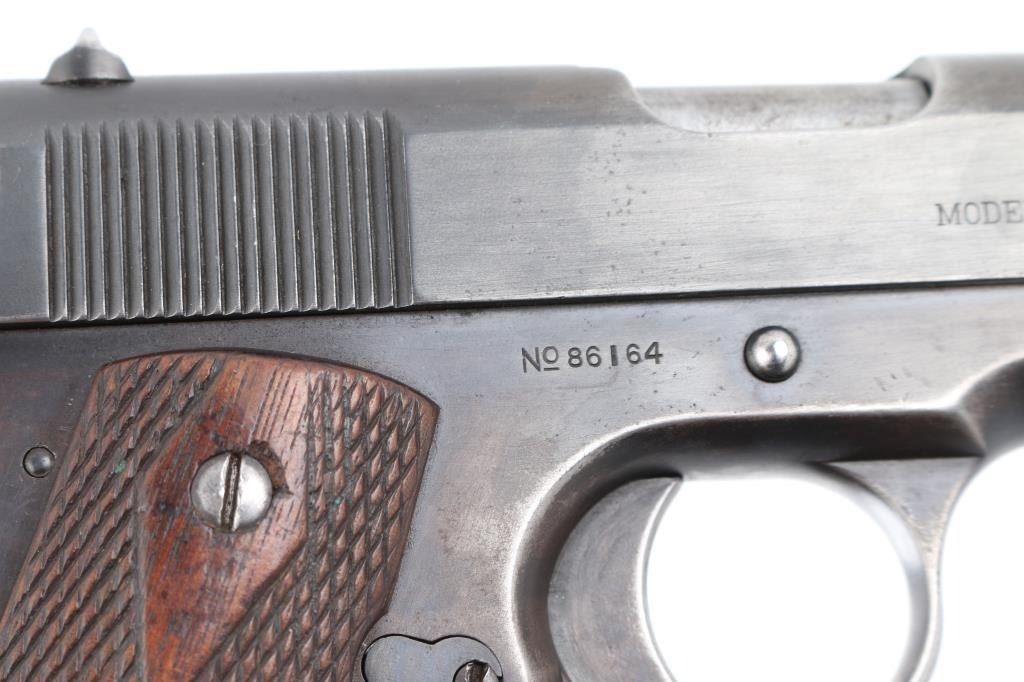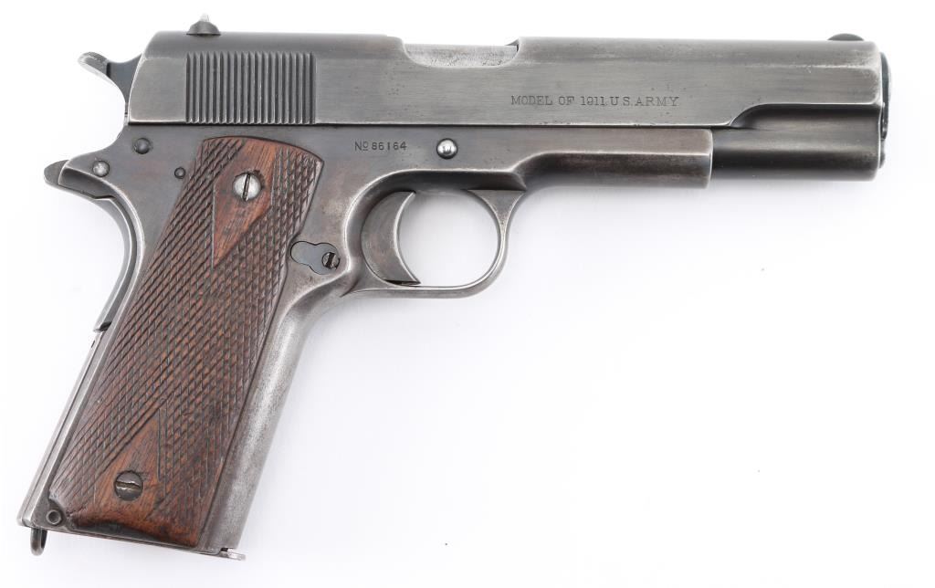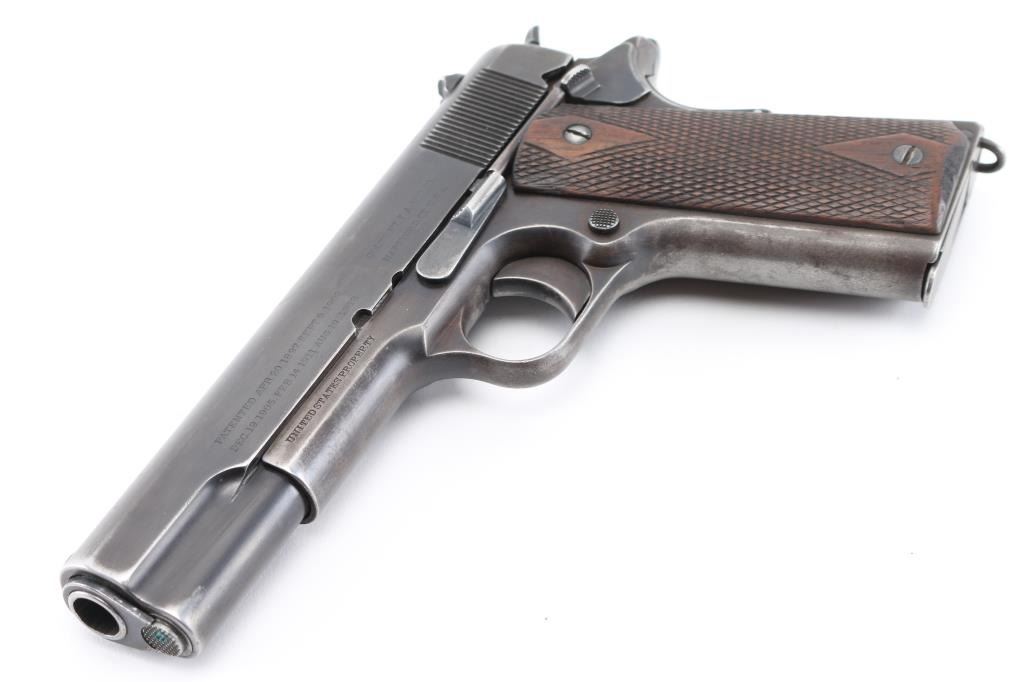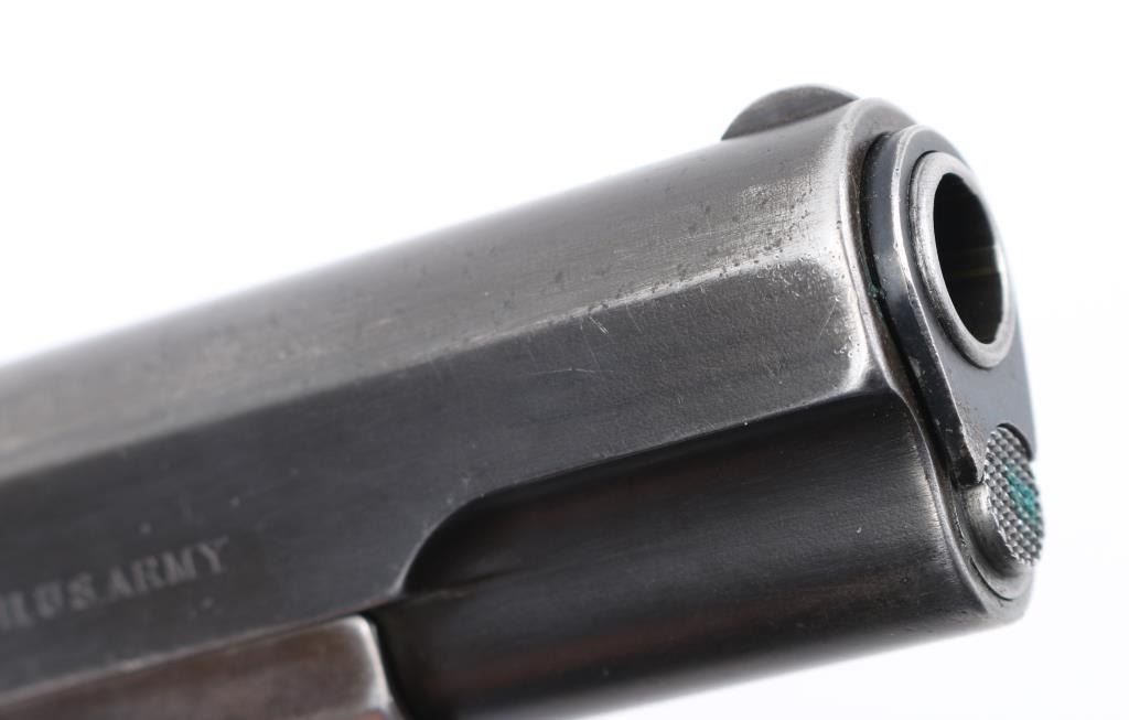 U.S. Military Issued sidearm. Early pre-war pistol manufactured 1914. "WGP" in circle inspectors mark above magazine release. (Major Walther G. Penfield). Right Slide stamped "Model of 1911. U.S. Army" Colt's Patent's and Address in two lines on left slide with "Rampant Colt". "United States property" on left frame. "H" stamped on the rear of the slide above the firing pin stop plate. Smooth, flat mainspring housing. Grip safety. Lanyard ring. Blued finish. Brown checkered wood "Diamond" grips. Bore appears very good bright. Grips are very good. Action is crisp/tight. Blued finish is about 75% with edge wear/minor scratches. Handling loss to the mainspring housing and fore grip. Comes with one 8-rd magazine, unmarked, and a Rare Rock Island Arsenal marked flap holster dated 1916, first year RIA made holsters for the M1911. Arsenal markings are very feint, Inspected by "T.C.C. Flap has small hole in flap. Old Arsenal re-finish, NRA Condition-Good+. C&R Firearm.