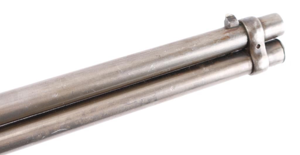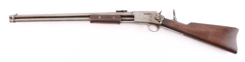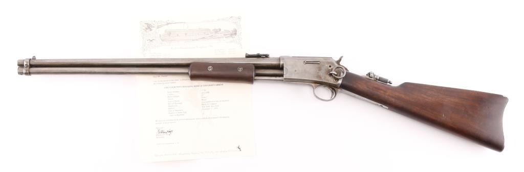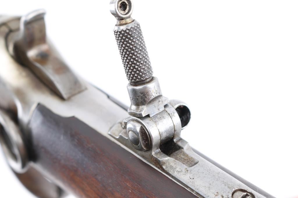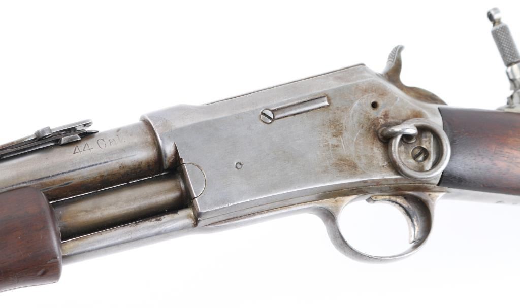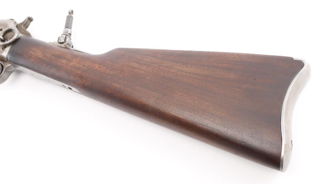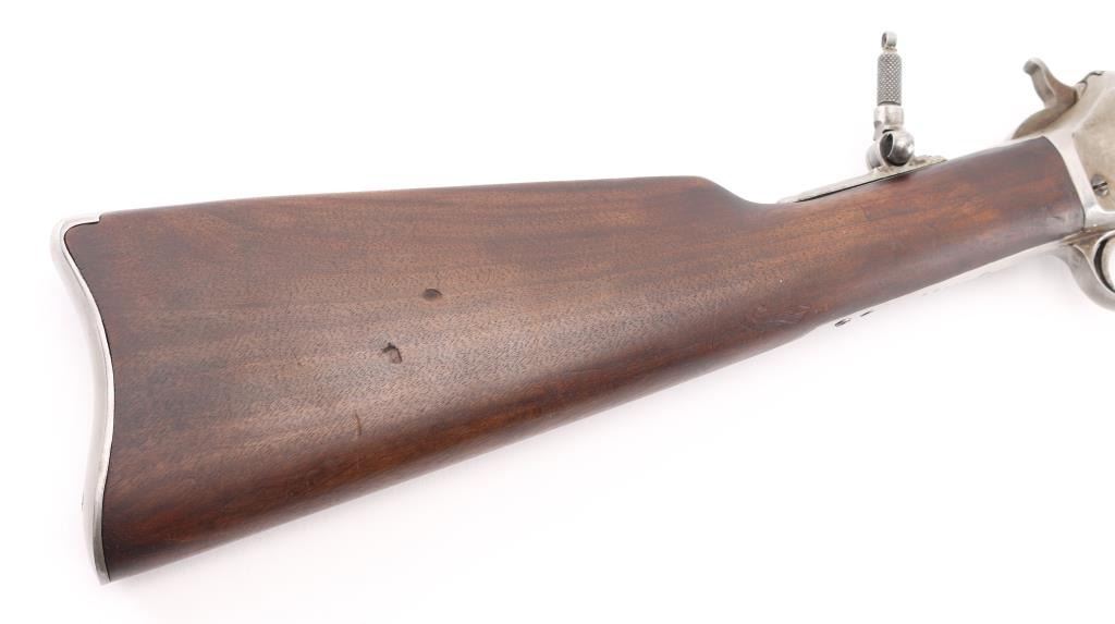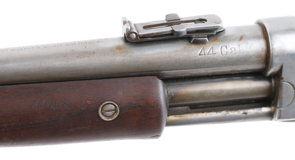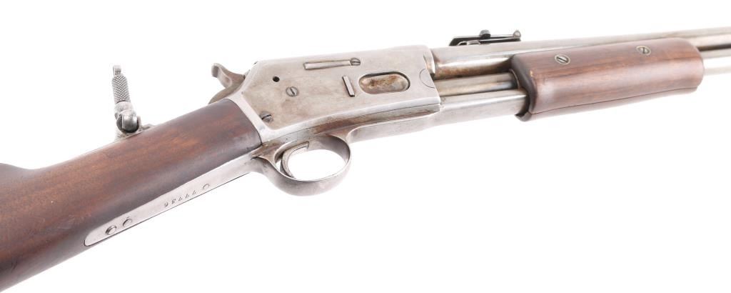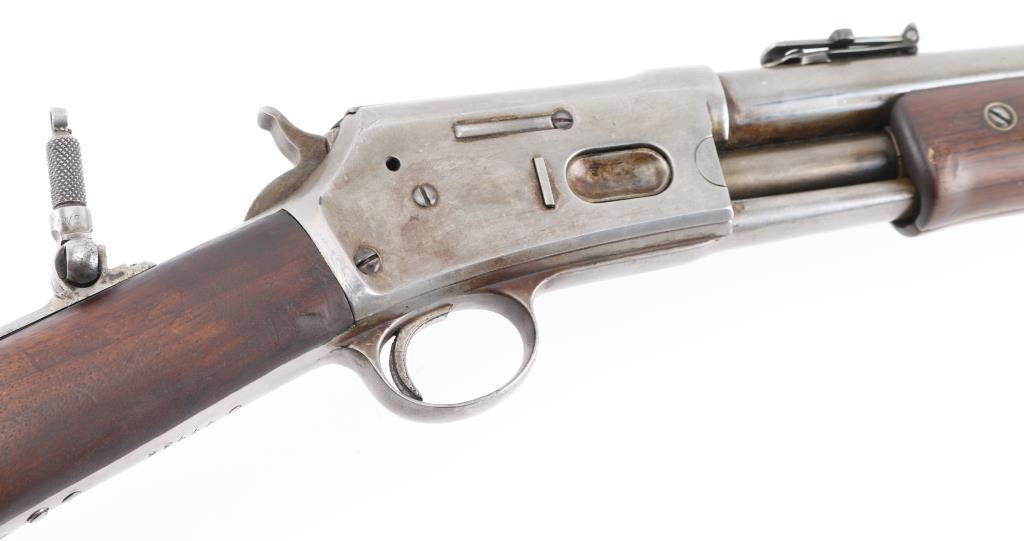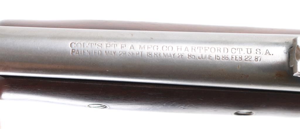 'Medium Frame' Antique American made slide action repeating rifle, manufactured circa 1895 .Rare full nickel finish. Produced 1884-1904. Features 20" round barrel, blade front sight, folding ladder rear sight, folding peep sight mounted on tang, the full length tube magazine, smooth trigger, steel frame with saddle ring, two-piece walnut slide handle and smooth straight grip shoulder stock with carbine style metal buttplate. No Rampant Colt on left side of receiver. Bore is fair with scattered areas of pitting,strong rifling. Carbine displays 85% of the original nickel finish, turning brown in places, some scratches around the saddle ring, wood is very good/sound with minor scratches/dents, action is smooth. Barrel markings are a little worn from handling, but clear/readable. Includes letter from the Colt archives confirming the nickel finish, shipped December 17, 1895 to Markt & Company, New York City. NRA Condition-Very Good. Antique Firearm.