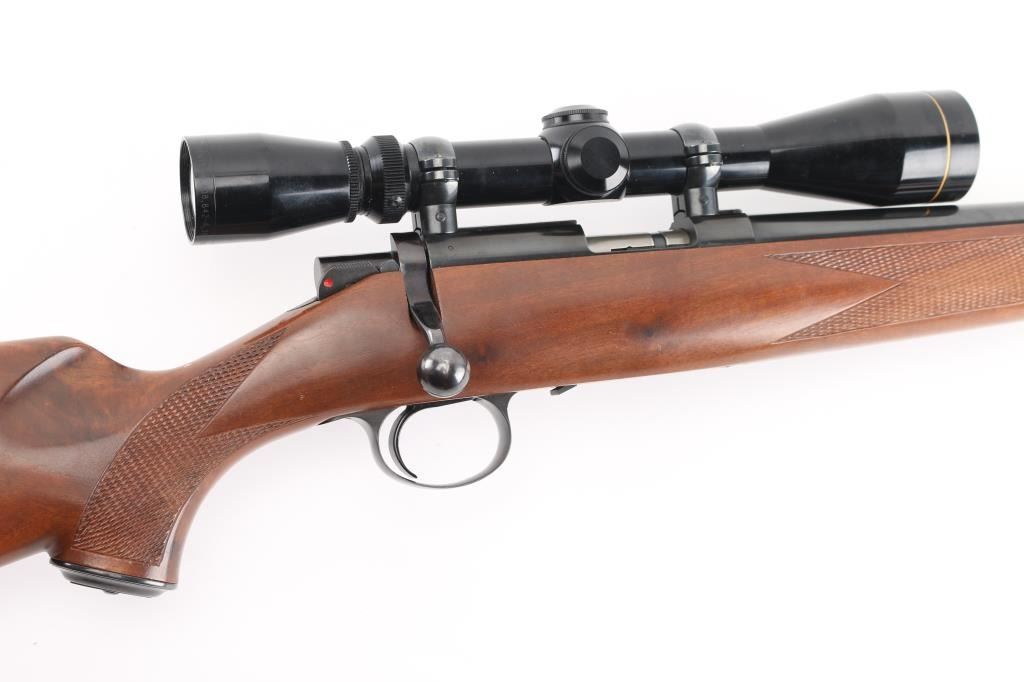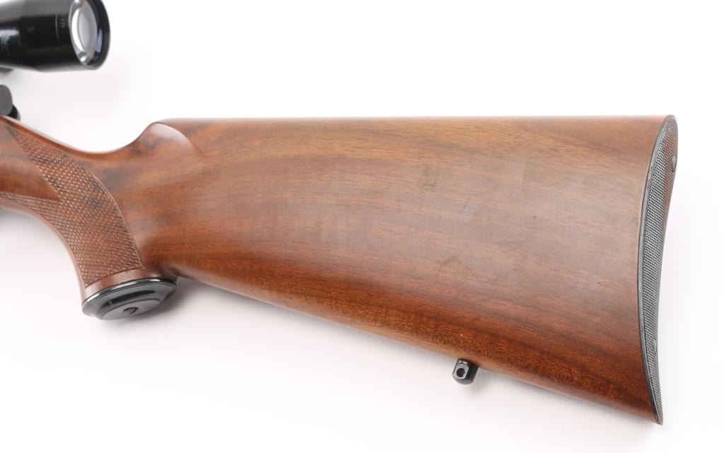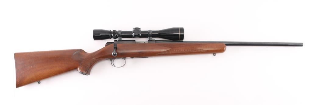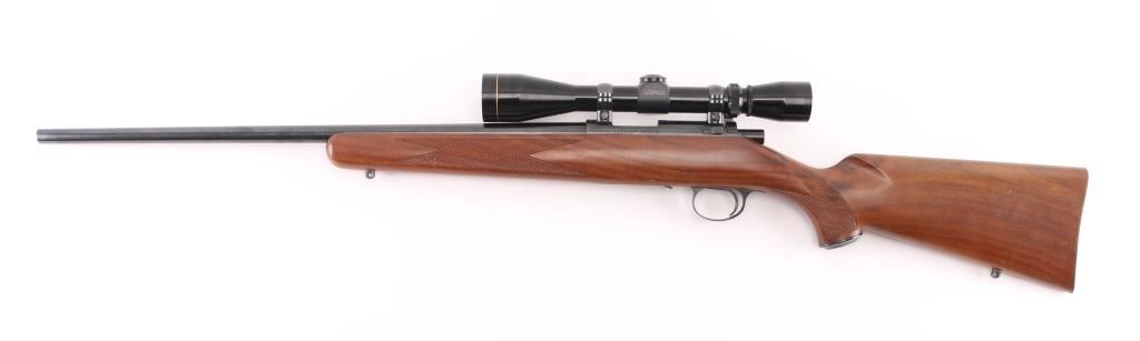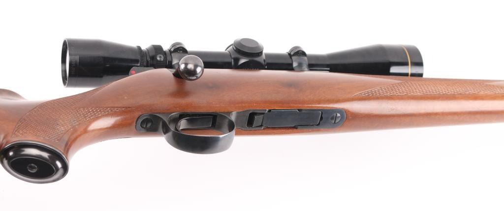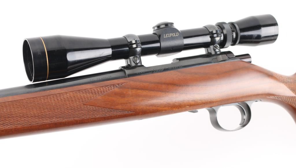 American classic bolt action rimfire rifle. Features blued finish, checkered walnut stock, checkered steel buttplate, contoured steel grip cap, 22" barrel, no sights, dovetail grooved receiver, detachable 5 rd magazine, external bolt stop on left side of receiver, manual safety, sling studs. Mounted with a Leupold 3x98 Vari-X II, clear optics. Bore is excellent/bright Retains 97% finish, few handling marks,a couple of light pin prick pitting spots on barrel, some surface rust on the buttplate, should clean off. Stock is near excellent with few minor blemishes. NRA Condition-Very Good. Modern Firearm.