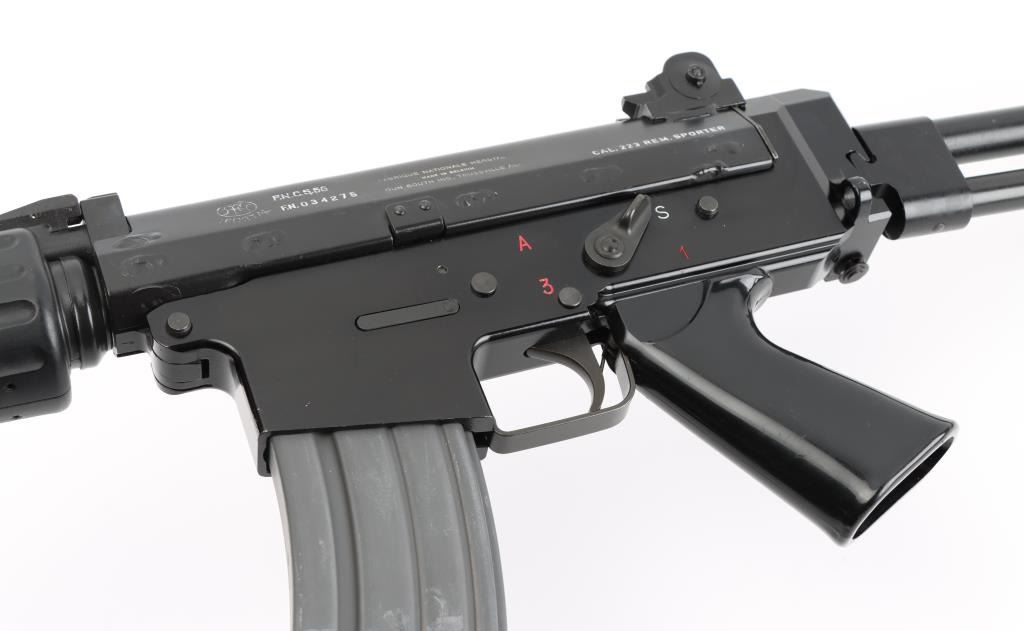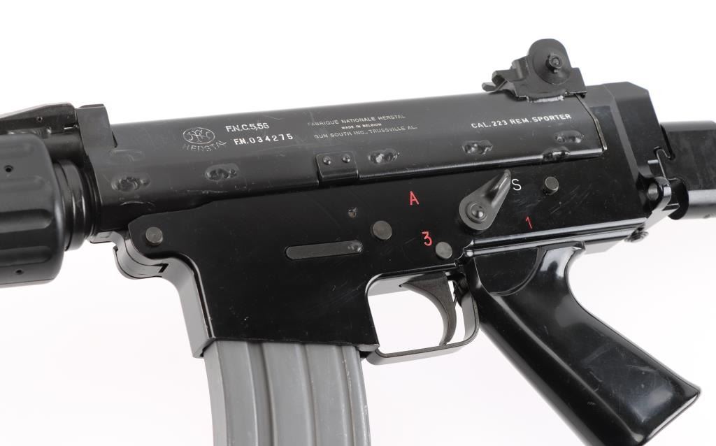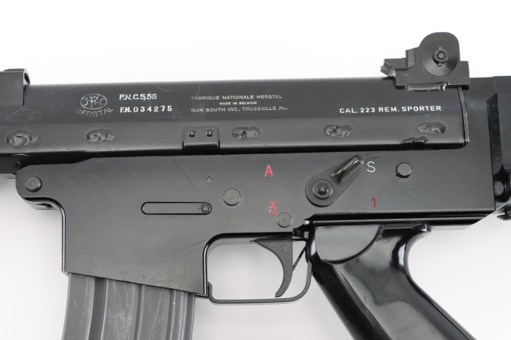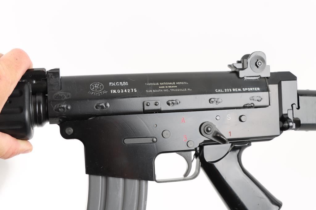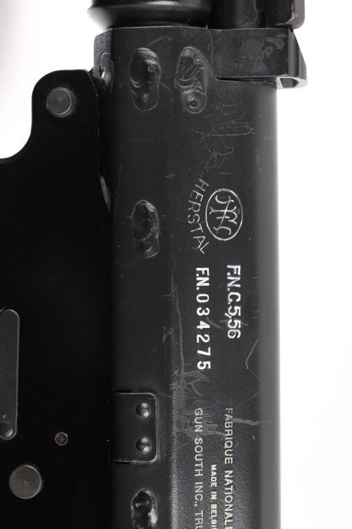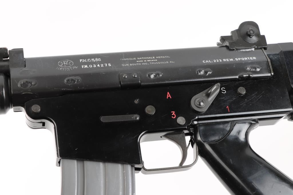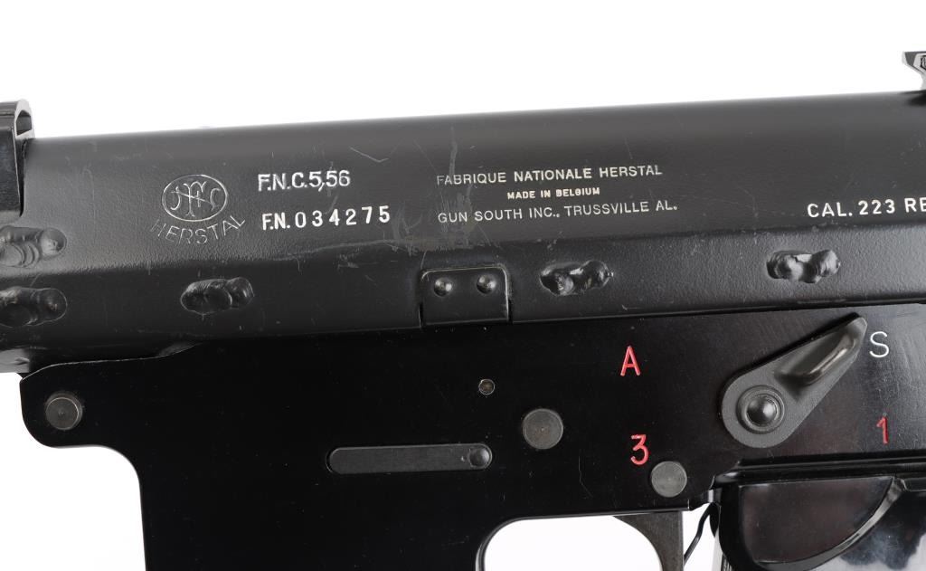 'Fabrique Nationale Carbine' Fully transferable long stroke gas piston operated select fire machine gun chambered in .223 Remington. Built utilizing a S&H Arms registered auto sear (#2689) and Fabrique Nationale host gun (#034275). The rifle was manufactured in Belgium, imported by Gun South Inc. of Birmingham, A.L. with import marks on the left side of the receiver and the sear was manufactured & installed by S&H Arms of Owasso, OK. The FNC was designed in the 1970's for NATO standardization trials and approximately only 3,000 FNC rifles were imported into the United States. Features a black finish, 17.7" barrel with flash hider/grenade launcher attached, shrouded elevation adjustable post front sight, flip up grenade launching sight, windage adjustable dual aperture "L" rear sight marked for 250 & 400 meters, two-position adjustable gas block, smooth trigger, four position selector lever (full-auto, 3 round burst, semi-auto & safe), push button magazine release, 30 round Okay Industries STANAG pattern aluminum magazine, black anodized milled lower receiver with S&H Arms registered auto sear installed, angled & flared cylindrical charging handle, multiple sling provisions, two-piece ventilated metal handguard with grooved black polymer scales, smooth black polymer grip and tubular metal right-side-folding shoulder stock with rubber recoil pad. Host gun retains approximately 95% of its original black finishes showing scattered scratches and small losses. Action is mechanically sound in all four fire modes, the bore is excellent and the synthetic furniture is very good with scratches & dings on the pistol grip. Condition is NRA Very Good to Excellent ***NFA Firearm*** ***Fully Transferable***