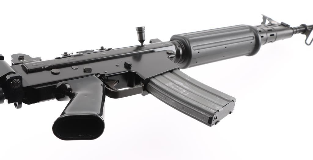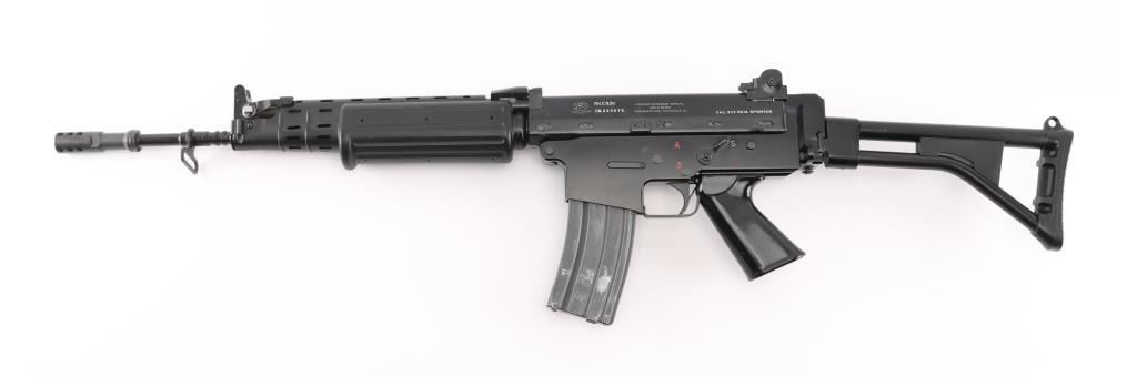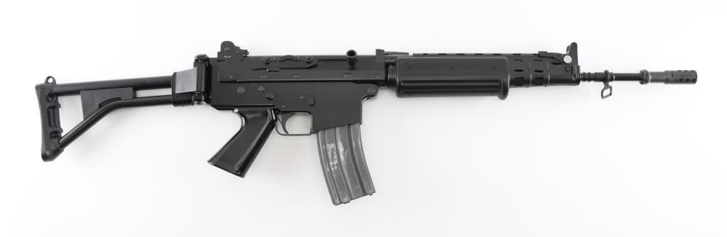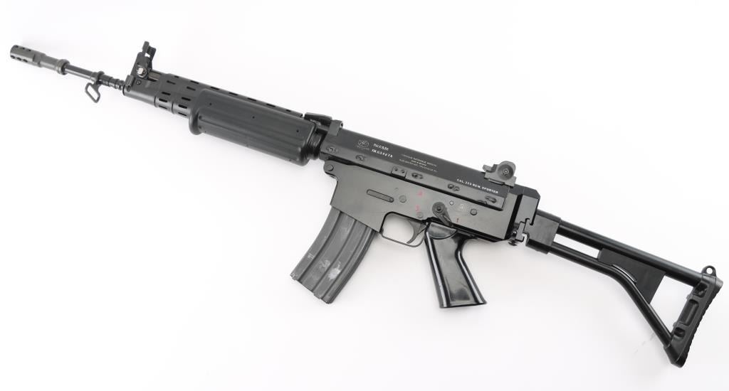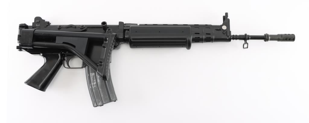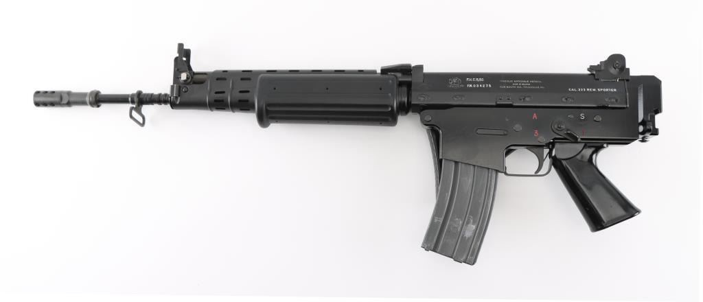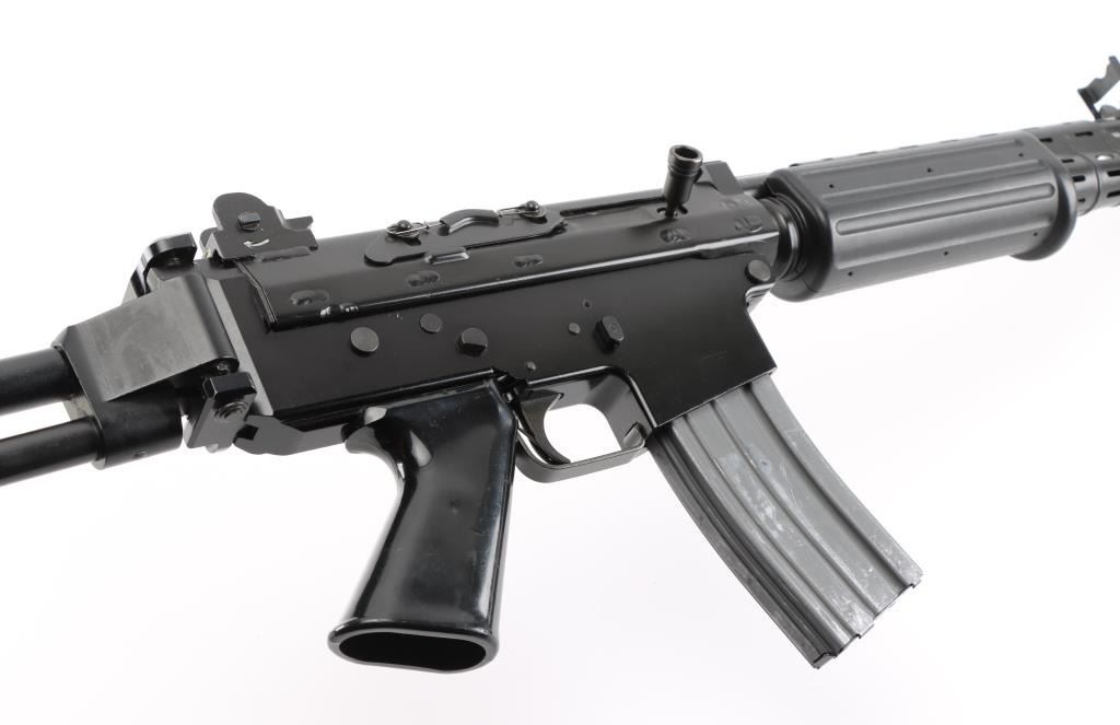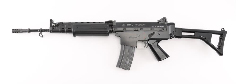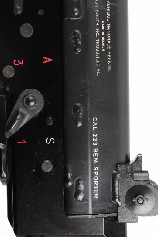 'Fabrique Nationale Carbine' Fully transferable long stroke gas piston operated select fire machine gun chambered in .223 Remington. Built utilizing a S&H Arms registered auto sear (#2689) and Fabrique Nationale host gun (#034275). The rifle was manufactured in Belgium, imported by Gun South Inc. of Birmingham, A.L. with import marks on the left side of the receiver and the sear was manufactured & installed by S&H Arms of Owasso, OK. The FNC was designed in the 1970's for NATO standardization trials and approximately only 3,000 FNC rifles were imported into the United States. Features a black finish, 17.7" barrel with flash hider/grenade launcher attached, shrouded elevation adjustable post front sight, flip up grenade launching sight, windage adjustable dual aperture "L" rear sight marked for 250 & 400 meters, two-position adjustable gas block, smooth trigger, four position selector lever (full-auto, 3 round burst, semi-auto & safe), push button magazine release, 30 round Okay Industries STANAG pattern aluminum magazine, black anodized milled lower receiver with S&H Arms registered auto sear installed, angled & flared cylindrical charging handle, multiple sling provisions, two-piece ventilated metal handguard with grooved black polymer scales, smooth black polymer grip and tubular metal right-side-folding shoulder stock with rubber recoil pad. Host gun retains approximately 95% of its original black finishes showing scattered scratches and small losses. Action is mechanically sound in all four fire modes, the bore is excellent and the synthetic furniture is very good with scratches & dings on the pistol grip. Condition is NRA Very Good to Excellent ***NFA Firearm*** ***Fully Transferable***