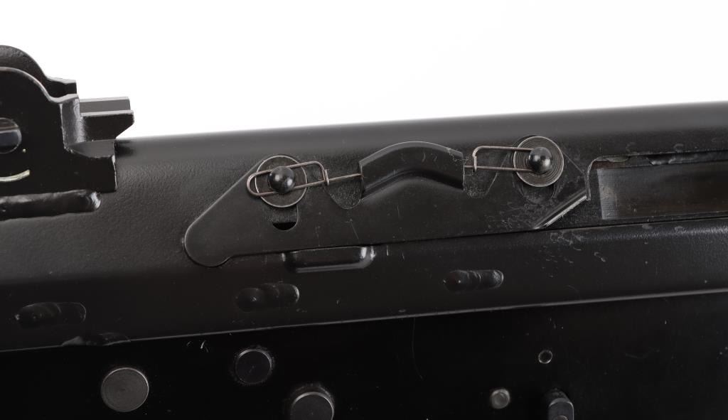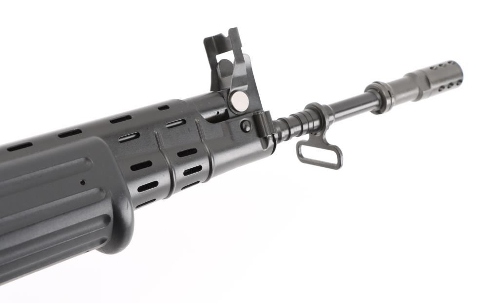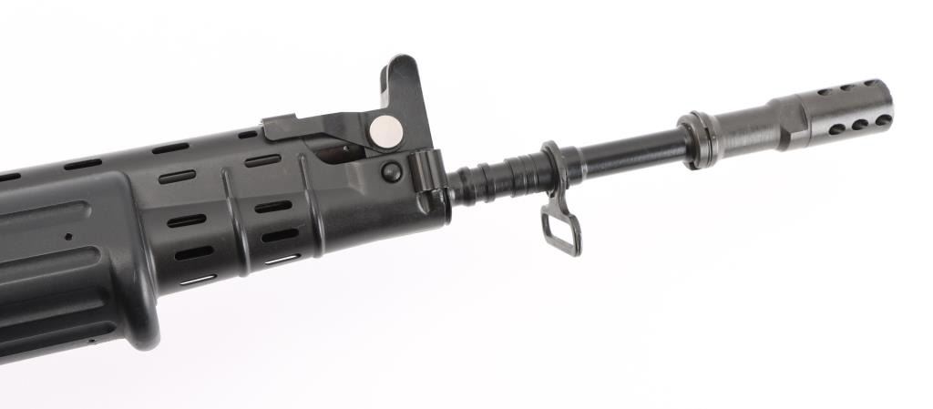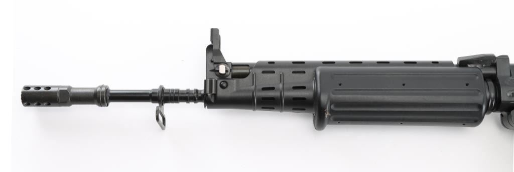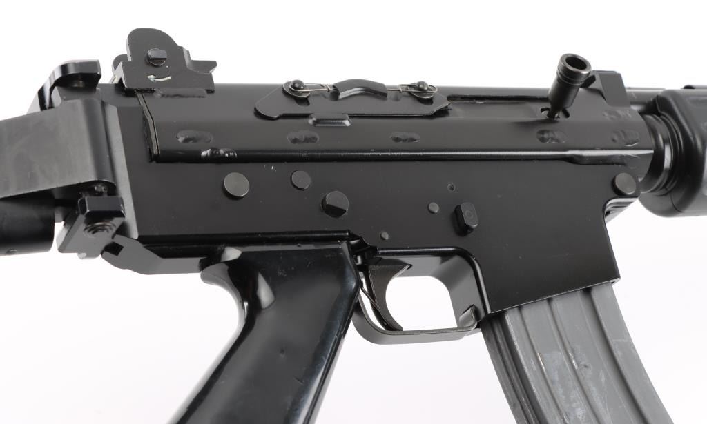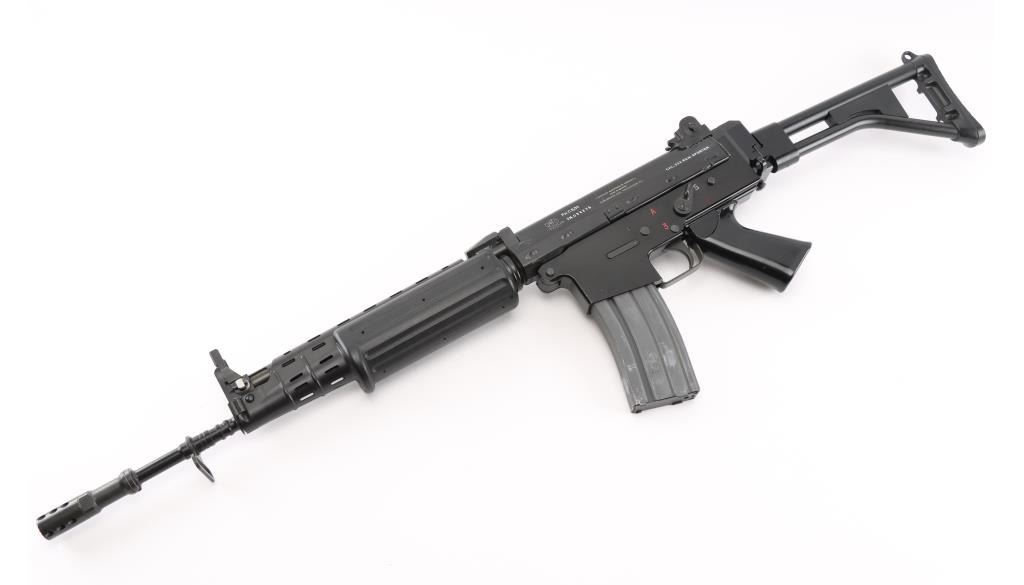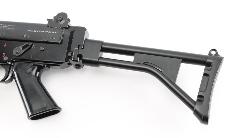 'Fabrique Nationale Carbine' Fully transferable long stroke gas piston operated select fire machine gun chambered in .223 Remington. Built utilizing a S&H Arms registered auto sear (#2689) and Fabrique Nationale host gun (#034275). The rifle was manufactured in Belgium, imported by Gun South Inc. of Birmingham, A.L. with import marks on the left side of the receiver and the sear was manufactured & installed by S&H Arms of Owasso, OK. The FNC was designed in the 1970's for NATO standardization trials and approximately only 3,000 FNC rifles were imported into the United States. Features a black finish, 17.7" barrel with flash hider/grenade launcher attached, shrouded elevation adjustable post front sight, flip up grenade launching sight, windage adjustable dual aperture "L" rear sight marked for 250 & 400 meters, two-position adjustable gas block, smooth trigger, four position selector lever (full-auto, 3 round burst, semi-auto & safe), push button magazine release, 30 round Okay Industries STANAG pattern aluminum magazine, black anodized milled lower receiver with S&H Arms registered auto sear installed, angled & flared cylindrical charging handle, multiple sling provisions, two-piece ventilated metal handguard with grooved black polymer scales, smooth black polymer grip and tubular metal right-side-folding shoulder stock with rubber recoil pad. Host gun retains approximately 95% of its original black finishes showing scattered scratches and small losses. Action is mechanically sound in all four fire modes, the bore is excellent and the synthetic furniture is very good with scratches & dings on the pistol grip. Condition is NRA Very Good to Excellent ***NFA Firearm*** ***Fully Transferable***
