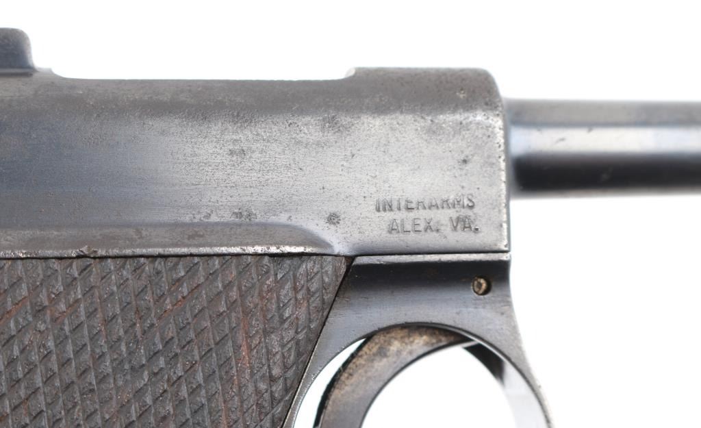 SN: 5522. Imported by Interarms, Alex. VA. marked on right frame. Semi-Automatic. Usage continued through the end of WW2. Produced by Tokyo arsenal with the 4 cannon balls stamp on the chamber. Model markings , "Type Nambu", on the right over the serial number Two "Kanji" stamps on the left side. "Army Type" 4.75" barrel with front triangle font sight, and tangent rear sights, serrated cocking piece. Left mounted guide rod. Grip safety on the fore strap. Fore strap is slotted to drop down the trigger group for disassembly. Lanyard swivel mounted on the rear of the fame. Matching serial numbers on frame, bolt, and backside of cocking knob. Mismatched nickel magazine with aluminum, checkered base, # 268", mag has some light pitting. Checkered, contoured grips. Bore has rifling with light pitting in the grooves. Action is crisp/tight. Smooth trigger has just traces of the straw finish, some spots of rust. Wood grips are sound with minor scratches/dings and a very narrow 2" chip out of the front left panel. There are 3 Japanese symbols painted on the left panel. Blued finish is about 70% with some minor edge wear. There are scattered areas of spots of pin-prick pitting. There is deeper pitting on the back & fore straps with handling loss, around the muzzle, and a spot on the right barrel. NRA Condition-Fair to good. C&R Firearm.
