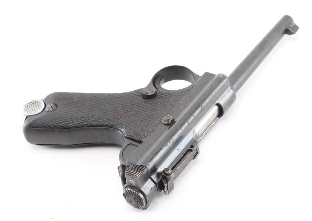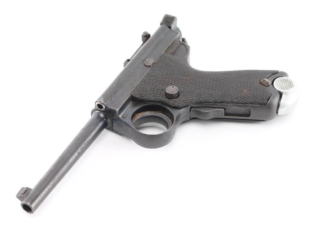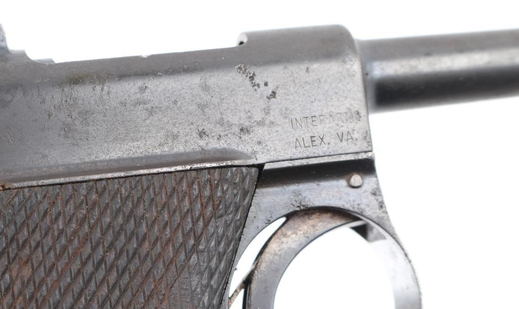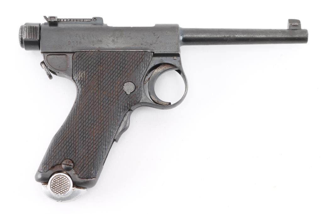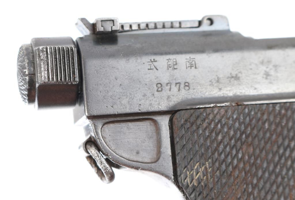 SN: 2778. Imported by Interarms, Alex. VA. marked on right frame. Semi-Automatic. Usage continued through the end of WW2. Produced by Tokyo arsenal with the 4 cannon balls stamp on the chamber. Model markings , "Type Nambu", on the right over the serial number Two "Kanji" stamps on the left side. "Army Type" 4.75" barrel with front triangle font sight, and tangent rear sights, serrated cocking piece. Left mounted guide rod. Grip safety on the fore strap. Fore strap is slotted to drop down the trigger group for disassembly. Lanyard swivel mounted on the rear of the fame. Matching serial numbers on frame, bolt, and backside of cocking knob. Mismatched nickel magazine with aluminum, checkered base, # 375", mag has heavy pitting. Checkered, contoured grips. Bore has worn rifling, needs cleaning. Action is crisp/tight. Smooth trigger has just traces of the straw finish. Wood grips are good with minor scratches/dings. Blued finish is about 70% with some minor edge wear. There are scattered areas of spots of pin-prick pitting. There is deeper pitting on the back & fore straps with handling loss. NRA Condition-Near Good. C&R Firearm.