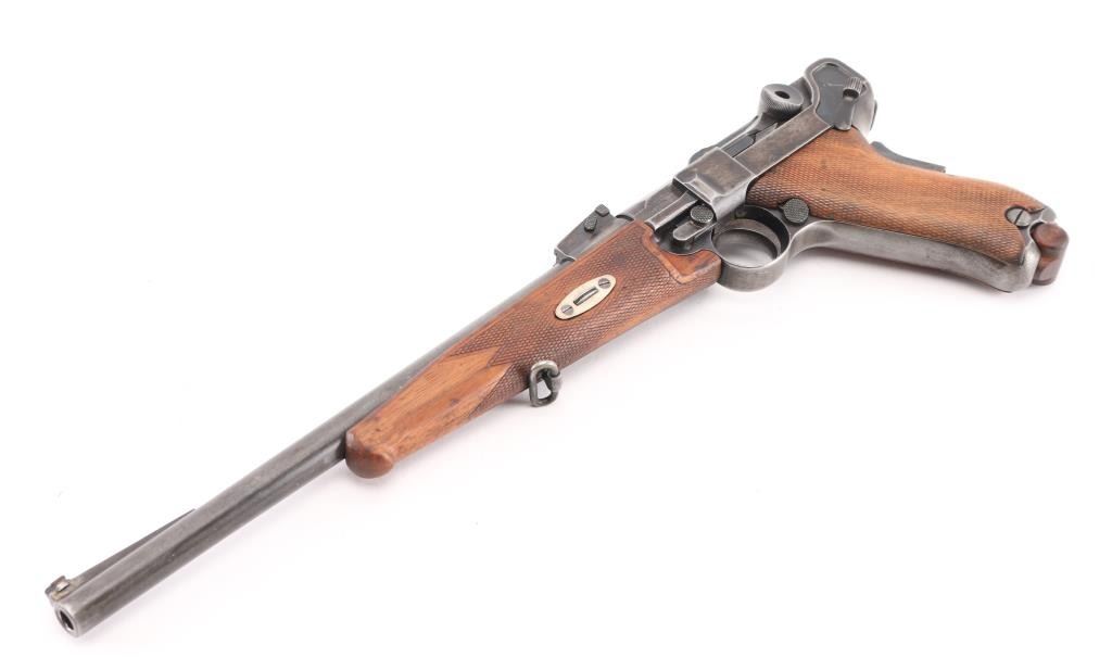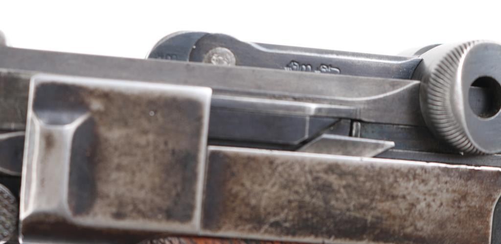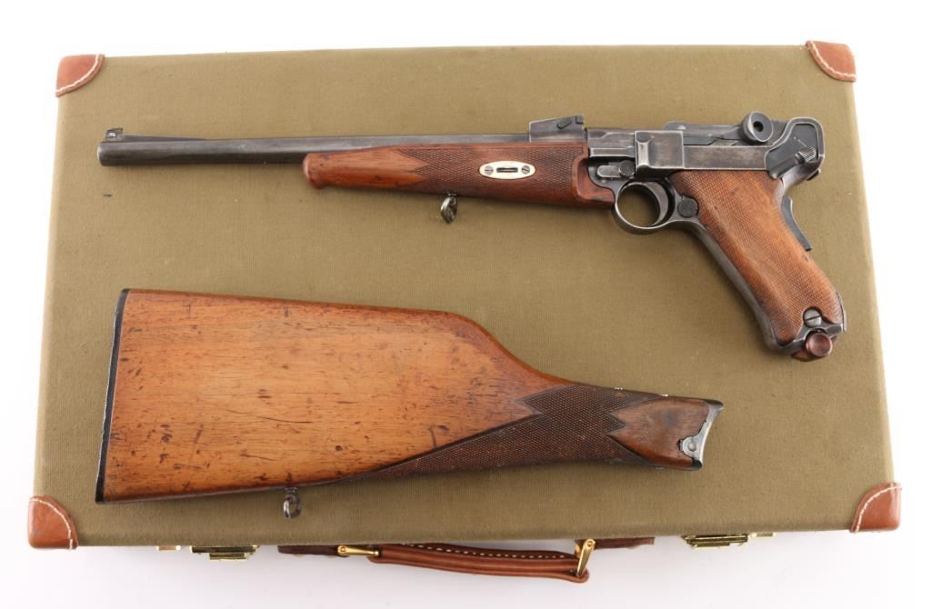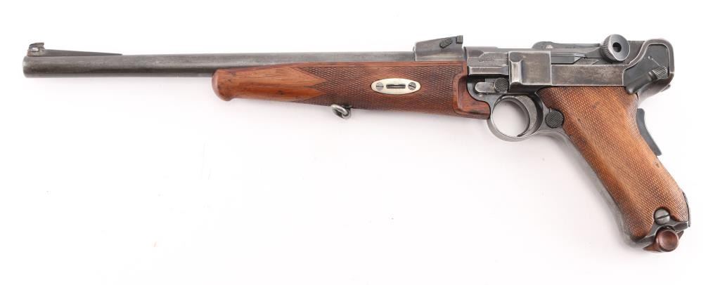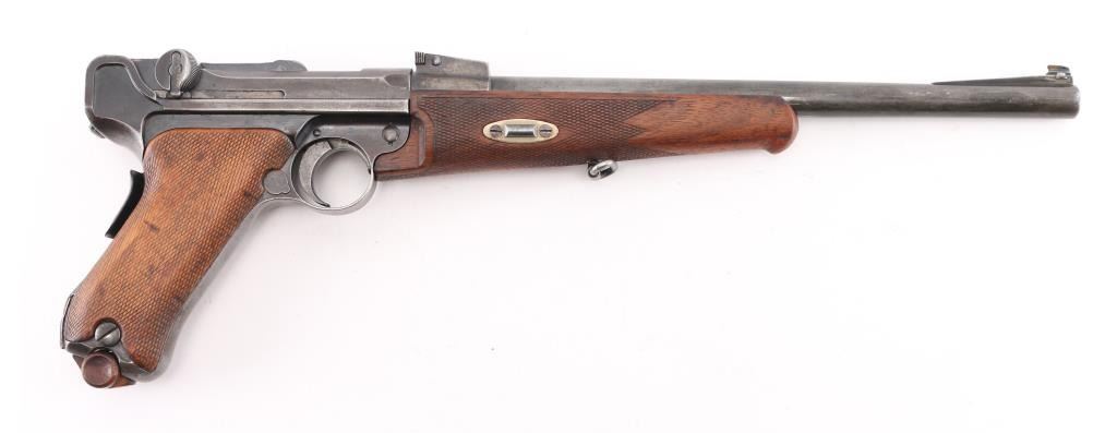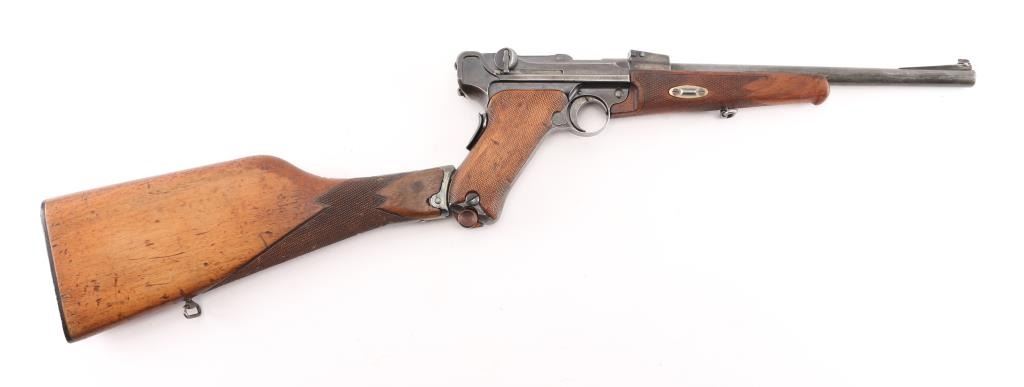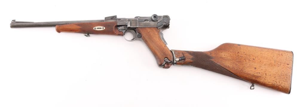 Very desirable 1902 Luger carbine. These carbines were DWM's attempt to a produce a lightweight rifle substitute to compete against the Mauser Broomhandle carbines. There were a total of 2,500 Luger carbines produced in two serial number blocks with this specific pistol being in the second block of which only 1,100 total were made. The unique features of these pistols are: a 11 3/4 inch barrel, short forend which housed a small spring accelerator mechanism, early long frame, grip safety, dished toggles, and recessed/flat breech bolt. These were also fitted with the early style three position rear sight (adjustable from 100-300 meters) mounted on top of the barrel in front of the receiver and a bead front sight mounted on a ramp on top of the barrel. The top of the chamber is blank, and the front toggle has the DWM logo for "Deutsche Waffen und Munitions Fabriken". The full serial number (2200) is correctly marked on the frame extension and the underside of the barrel, with the last two (or three) digits of the serial number are marked on the takedown lever. The pistol stock is completely original and is fitted with a black horn buttplate, lower sling swivel, and an original matching numbered (00) attaching iron. The magazine has a nickel plated body with the correct unnumbered, wood plug. This fine pistol is complete with a cleaning rod, two take-down tools, housed in a custom maroon felt lined luggage style case. The case has eight compartments that hold the carbine, the detachable buttstock, magazine, wood block that holds 16 rounds. Bore is bright with strong rifling, some scattered areas of very light pitting, wood is sound, with the checkering worn smooth on the pistol, stock has good checkering with numerous minor scratches/dings, horn butt plate has a small chip on the top left. Action is smooth/tight. Blue finish is about 50% with handling/edge wear, minor scratches. NRA Condition-Good. C&R Firearm.