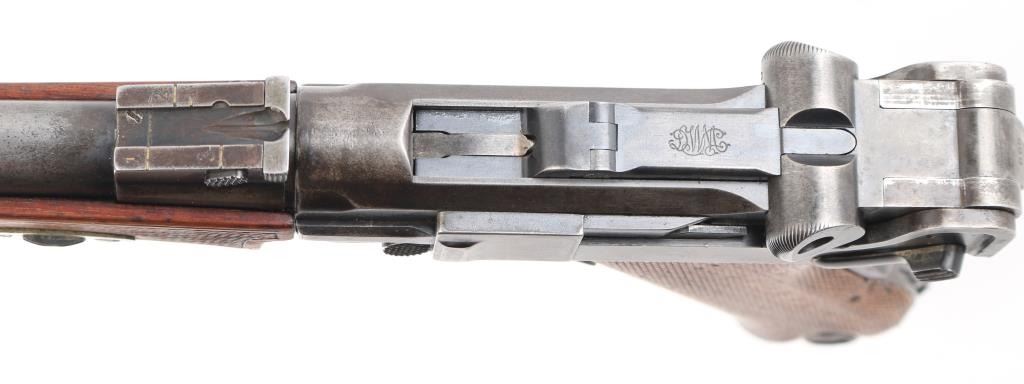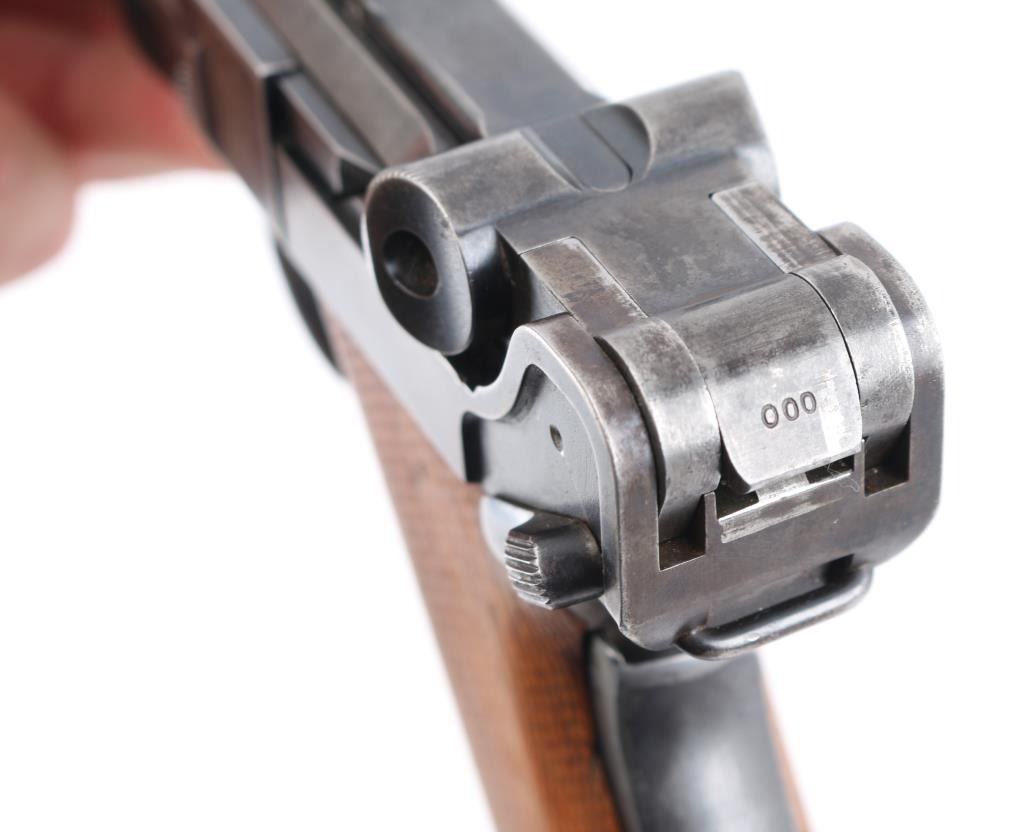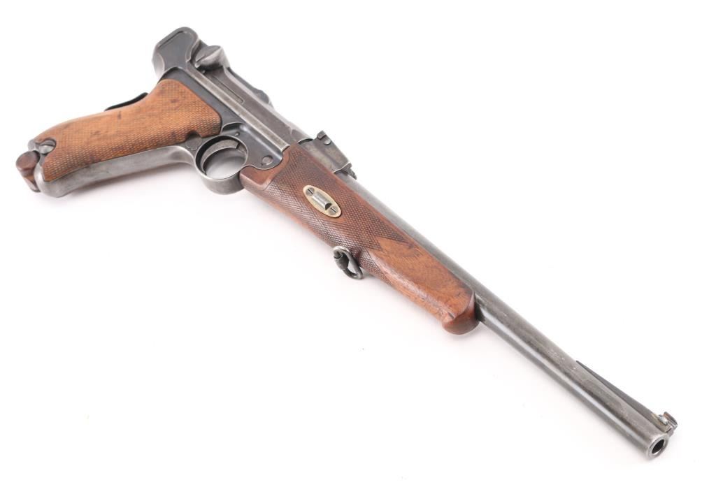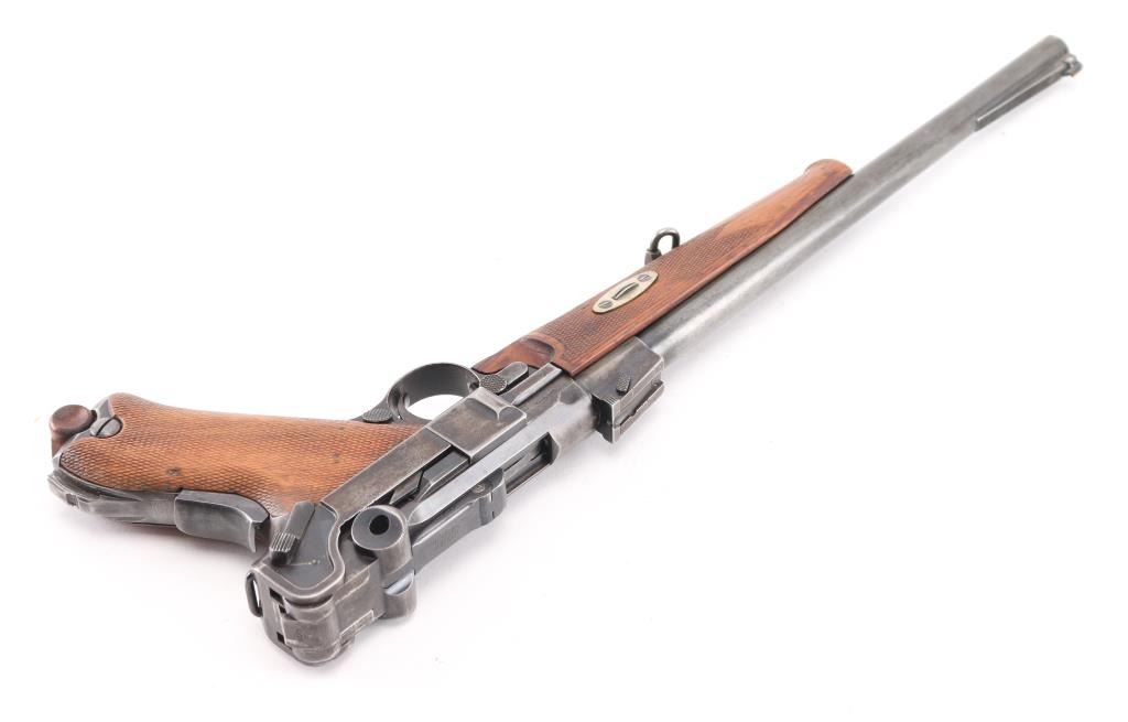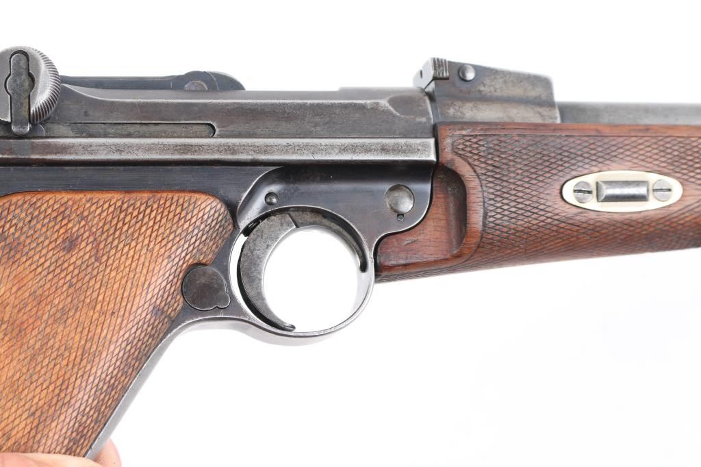 Very desirable 1902 Luger carbine. These carbines were DWM's attempt to a produce a lightweight rifle substitute to compete against the Mauser Broomhandle carbines. There were a total of 2,500 Luger carbines produced in two serial number blocks with this specific pistol being in the second block of which only 1,100 total were made. The unique features of these pistols are: a 11 3/4 inch barrel, short forend which housed a small spring accelerator mechanism, early long frame, grip safety, dished toggles, and recessed/flat breech bolt. These were also fitted with the early style three position rear sight (adjustable from 100-300 meters) mounted on top of the barrel in front of the receiver and a bead front sight mounted on a ramp on top of the barrel. The top of the chamber is blank, and the front toggle has the DWM logo for "Deutsche Waffen und Munitions Fabriken". The full serial number (2200) is correctly marked on the frame extension and the underside of the barrel, with the last two (or three) digits of the serial number are marked on the takedown lever. The pistol stock is completely original and is fitted with a black horn buttplate, lower sling swivel, and an original matching numbered (00) attaching iron. The magazine has a nickel plated body with the correct unnumbered, wood plug. This fine pistol is complete with a cleaning rod, two take-down tools, housed in a custom maroon felt lined luggage style case. The case has eight compartments that hold the carbine, the detachable buttstock, magazine, wood block that holds 16 rounds. Bore is bright with strong rifling, some scattered areas of very light pitting, wood is sound, with the checkering worn smooth on the pistol, stock has good checkering with numerous minor scratches/dings, horn butt plate has a small chip on the top left. Action is smooth/tight. Blue finish is about 50% with handling/edge wear, minor scratches. NRA Condition-Good. C&R Firearm.
