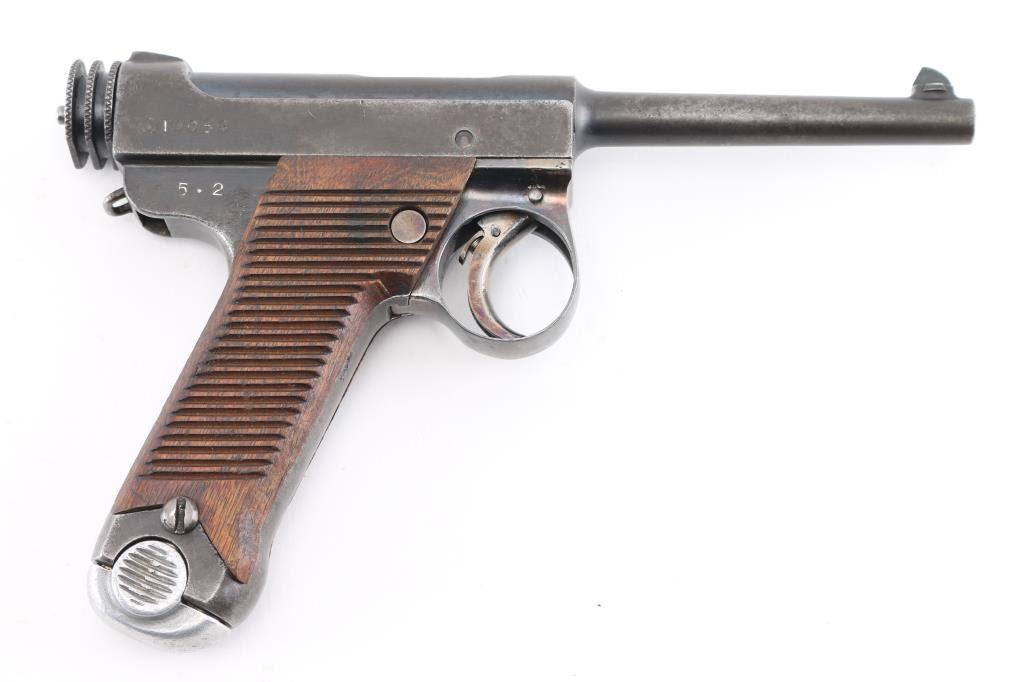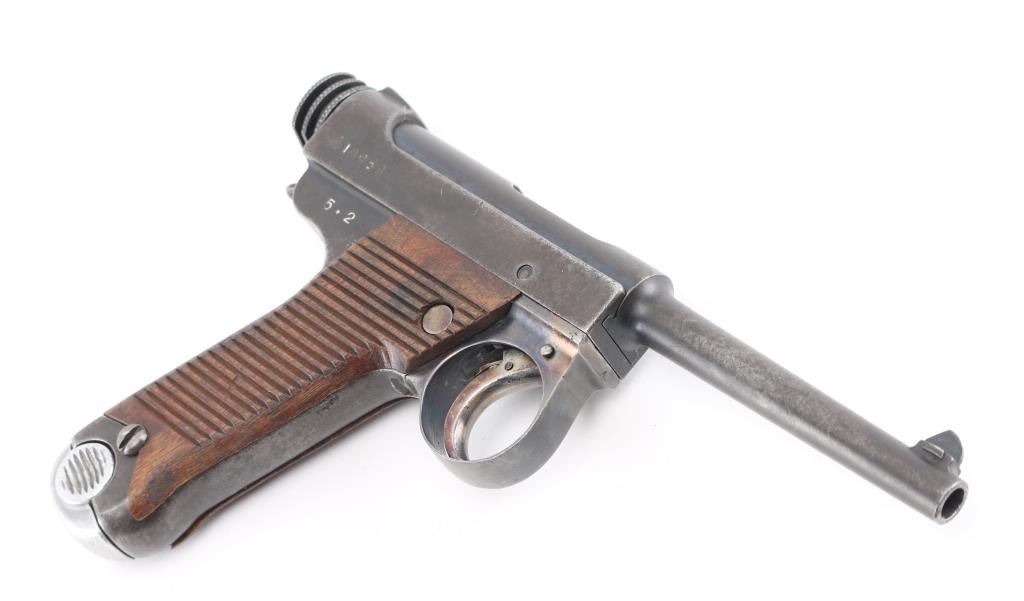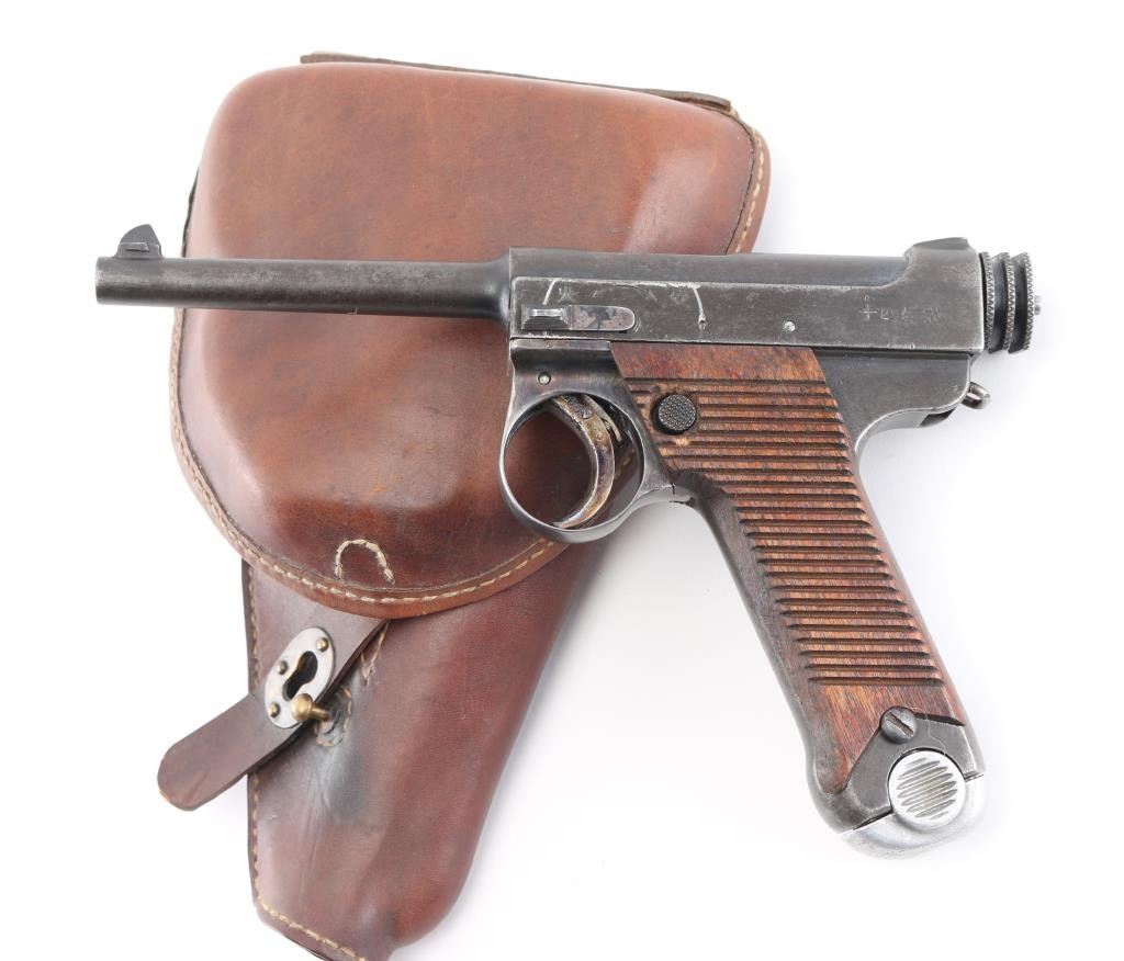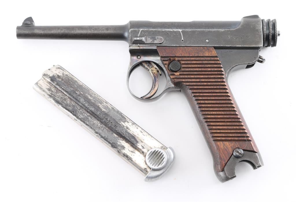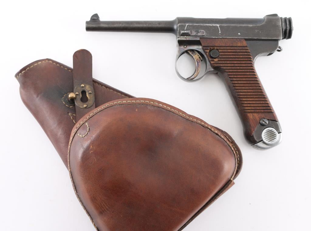 WWII era Japanese military striker fired semi-automatic service pistol chambered in 8mm Nambu. Dated 5.2 (February 1930) Features a blued finish, 4.6" barrel, dovetailed inverted 'v' front sight, fixed square notch rear sight, rounded trigger, small trigger guard, knurled grooved cocking piece, manual safety on the left side of the frame, magazine disconnect safety, push button magazine release, 8 round magazine with aluminum base plug, steel frame with lanyard loop on the rear and grooved wood grips Matching serial number on trigger. There is some very feint letters on the left frame, unreadable, which may be import marks. Bore is very good condition. Retains 80% finish showing edge losses, bright drag line on the frame from the safety lever, scattered areas of light pin-prick pitting. Grooved grips are very good condition with scratches. Markings are clear and readable. Magazine is pitted, numbered "433". Comes in a very good condition Type I (A) brown leather Type 14 holster with pocket for spare striker to the right of the ammo pouch. 3 Japanese characters are stamped on the inside of the flap. Condition is NRA Good. C&R Firearm.