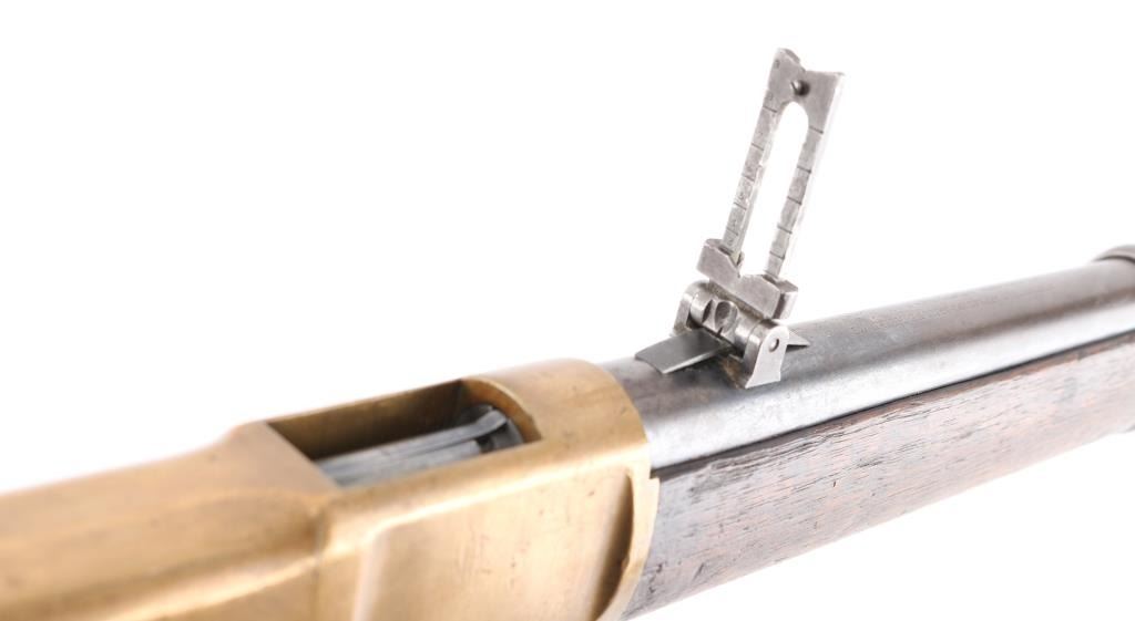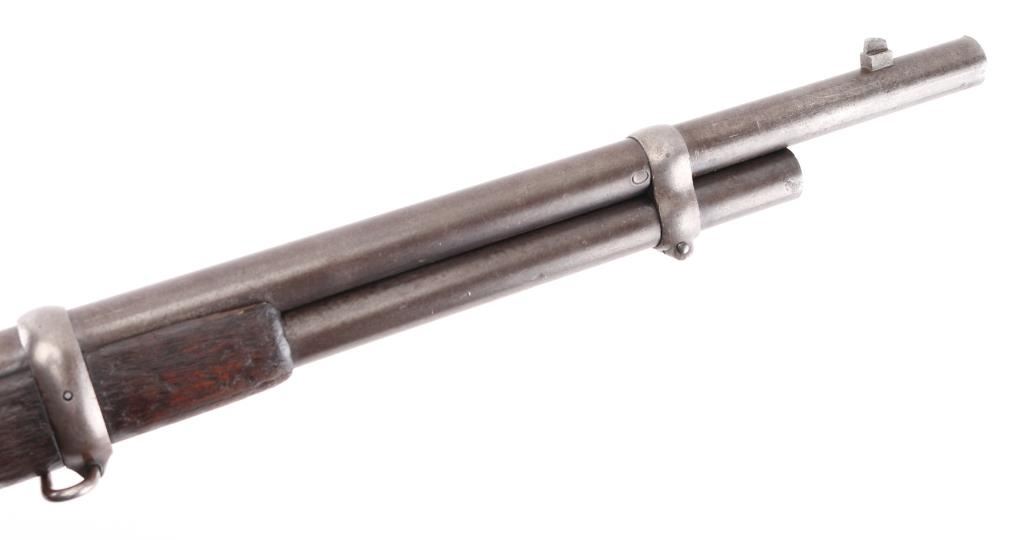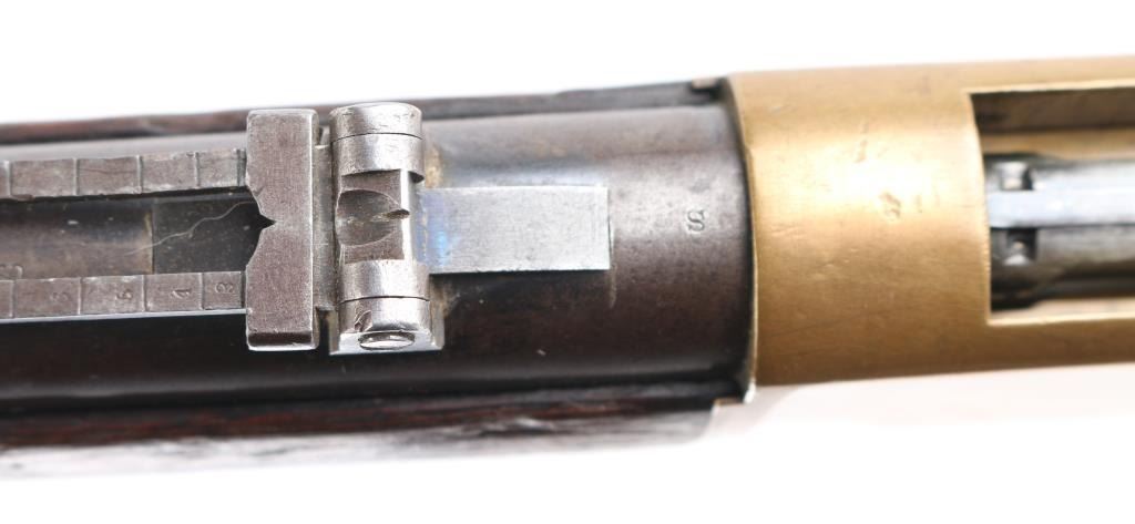 Small B.D. stamp behind number appears factory or period. NRA good to very good condition showing a smooth patina on the barrel and mag tube drifting to brown with traces of blue mixed with in. Good address and fairly crisp metal. Proper rear sight, bands and small parts. A few replacement screws and one tang screw missing. Fram is lightly cleaned but still good edges with most of the blue remaining on loading gat. Stocks are good with numerious dings, mars, and dents consistant with military use and storage. Minor shrinkage and small wood loss with normal imperfections. Action is good bore good. NRA good Antique Firearm