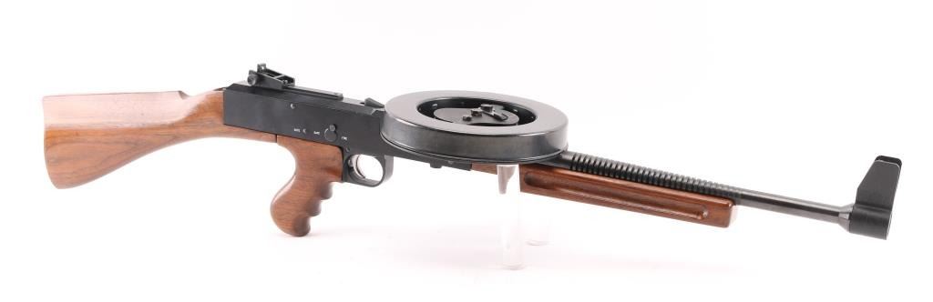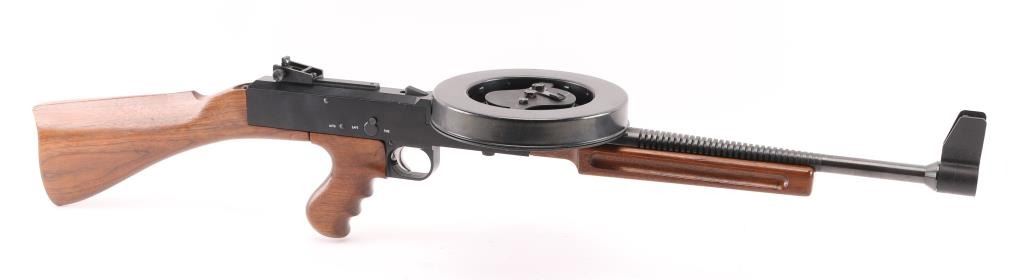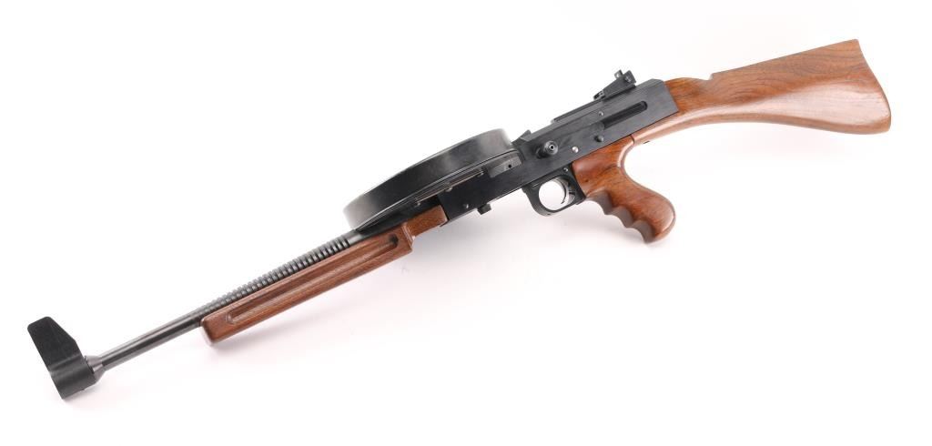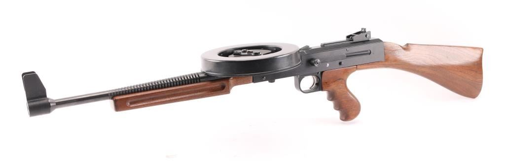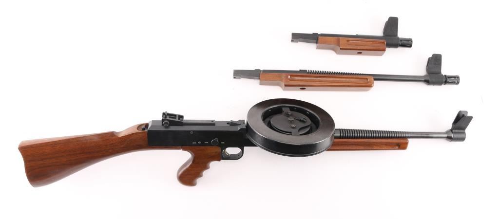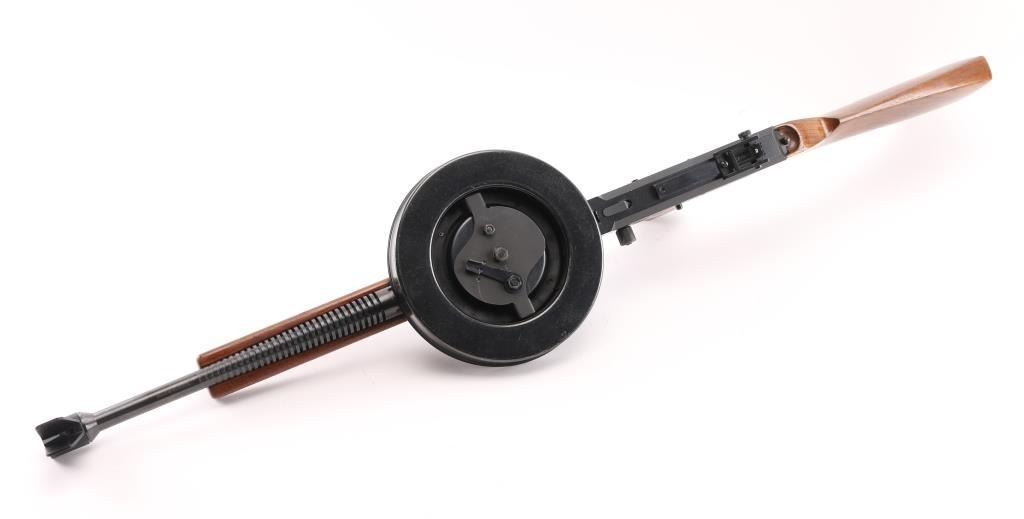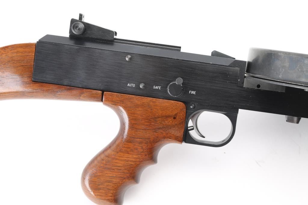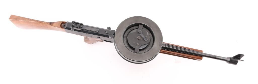 SN: B02060 Desirable and interesting select fire transferable machinegun, using very high capacity pan drums (typically 177 rds), fires inexpensive and readily available ammunition, and with easily interchangeable barrels. Features blued finish, 16.5" finned barrel, manual safety, cross bolt selector for semi or auto fire, adjustable sights. Furniture is walnut, with horizontal grasping groove forend, finger grooved pistol grip, shoulder stock removable by pressing a button. Bore is pristine. Metal retains 98% finish with minor handling marks. Metal drum is in excellent condition. Includes two additional barrels, 9" and 18", both with pristine bores, complete with front sights and forends, and bird cage flash hiders. Condition is near NRA Perfect ***NFA Firearm*** ***Fully Transferable***