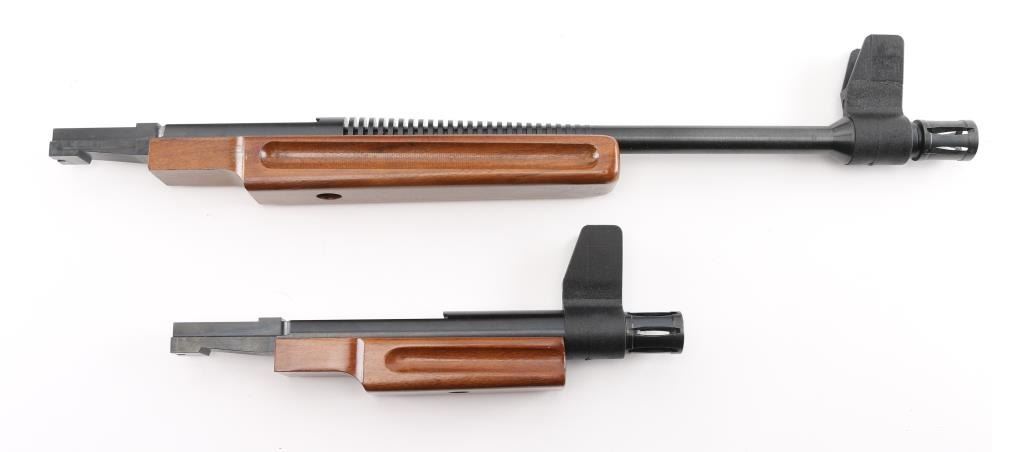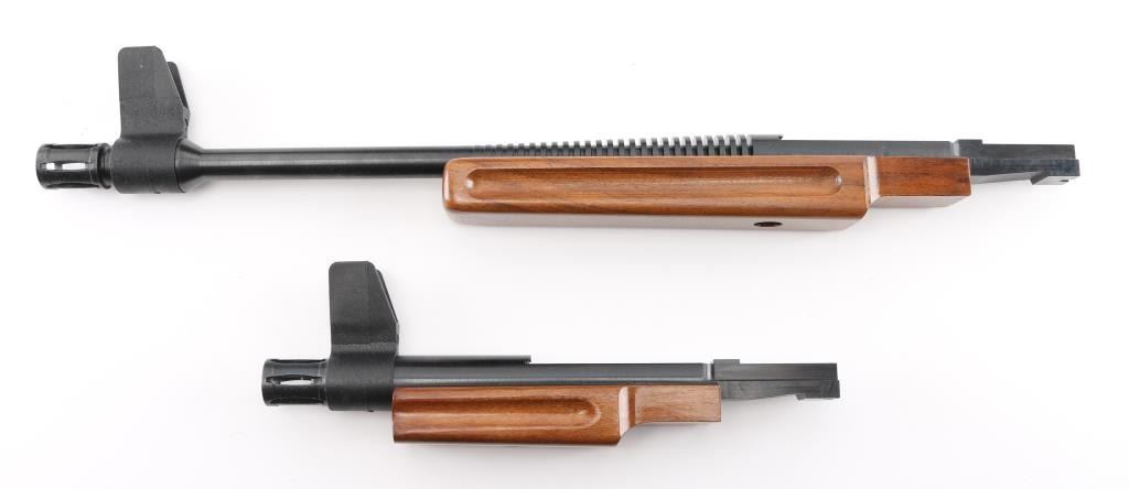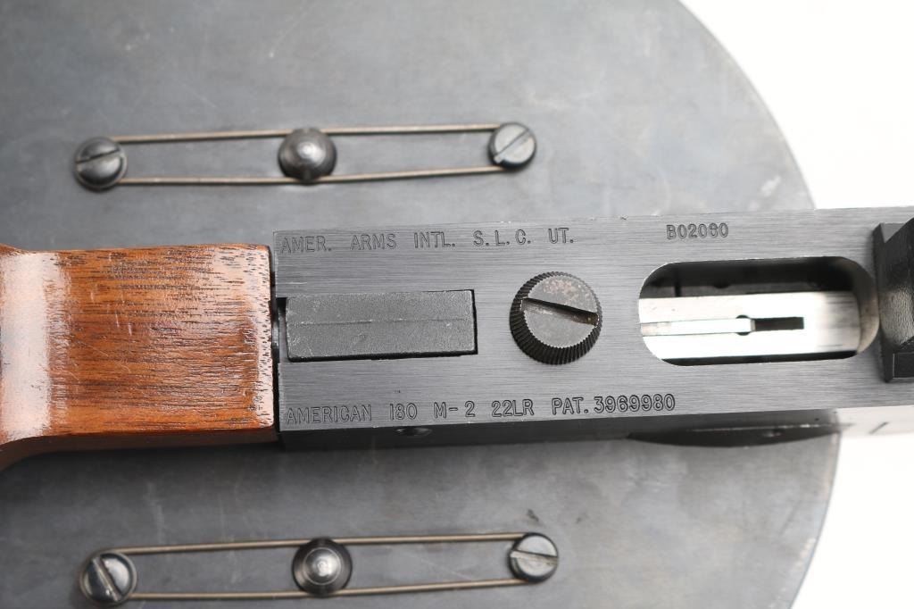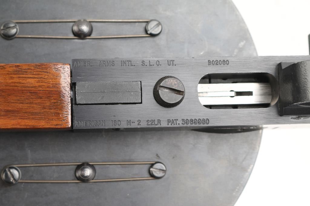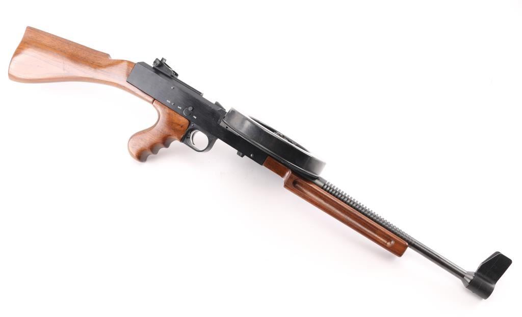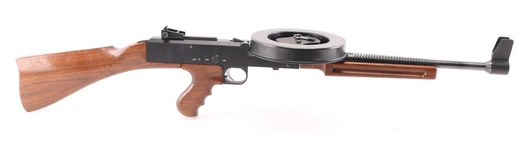 SN: B02060 Desirable and interesting select fire transferable machinegun, using very high capacity pan drums (typically 177 rds), fires inexpensive and readily available ammunition, and with easily interchangeable barrels. Features blued finish, 16.5" finned barrel, manual safety, cross bolt selector for semi or auto fire, adjustable sights. Furniture is walnut, with horizontal grasping groove forend, finger grooved pistol grip, shoulder stock removable by pressing a button. Bore is pristine. Metal retains 98% finish with minor handling marks. Metal drum is in excellent condition. Includes two additional barrels, 9" and 18", both with pristine bores, complete with front sights and forends, and bird cage flash hiders. Condition is near NRA Perfect ***NFA Firearm*** ***Fully Transferable***