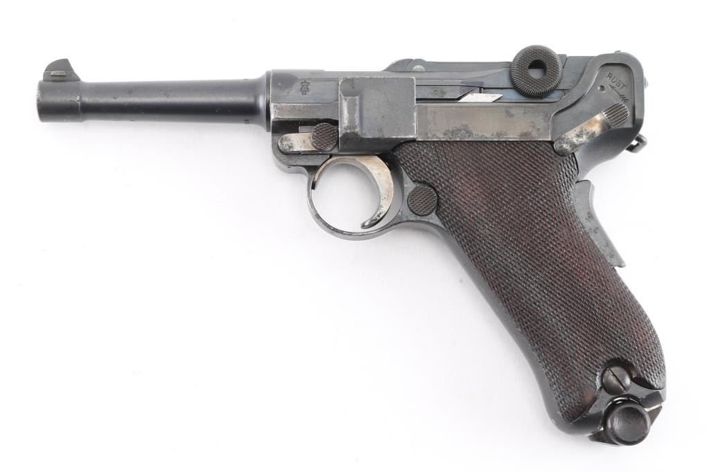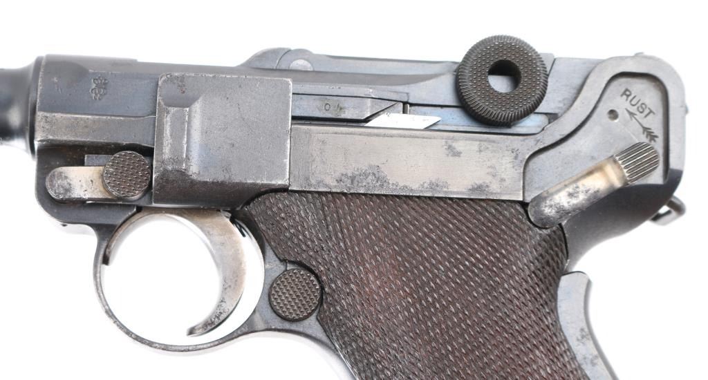 Manufactured on contract for the Netherlands, many of these pistols would be used to arm the Dutch Navy and colonial forces between the World Wars. Fixed sights with small "1916" stamped on the barrel,(Correct) a Dutch proof on the left side of the chamber, and the DWM monogram on the front toggle link. the Safety marked "RUST". All visible numbers are matching including the trigger. Fitted with straw finished small parts, checkered grips,grip safety, and an unmarked wood magazine base with a metal reinforcing clip in the rear. Bore is good with strong rifling, very light pitting, grips are very good, straw is about 50%, blue finish is about 80% with handling/edge wear, scattered areas of pin-prick pitting. NRA Condition-Good. C&R Firearm
