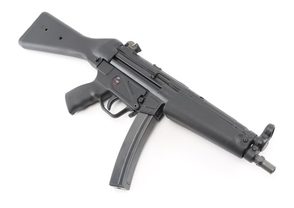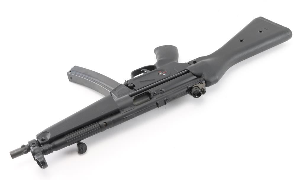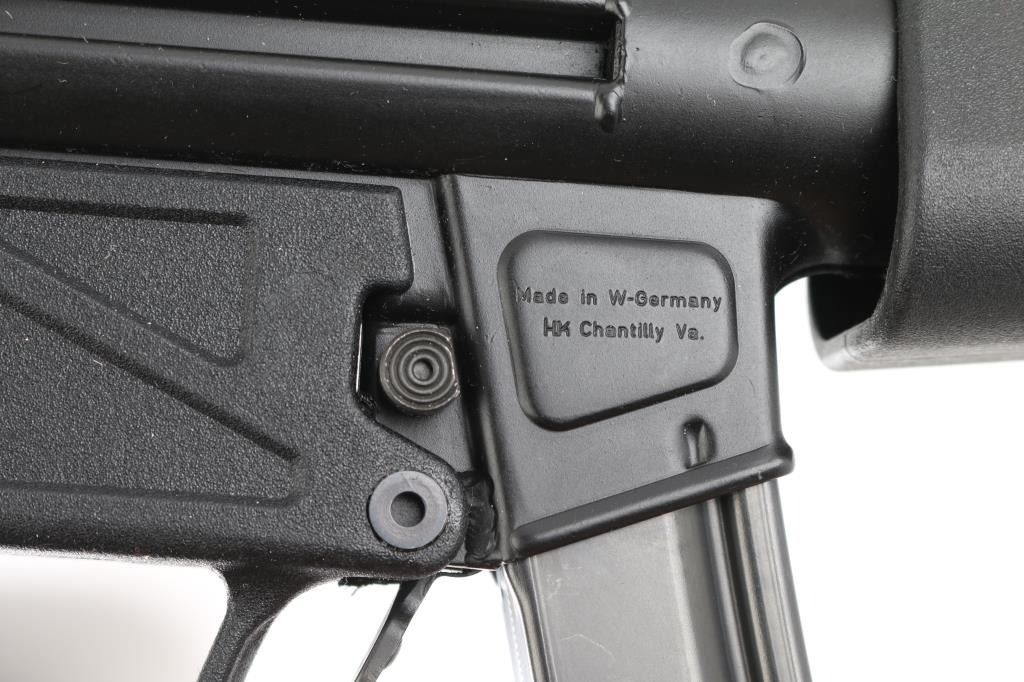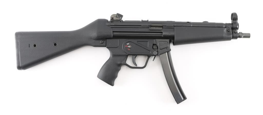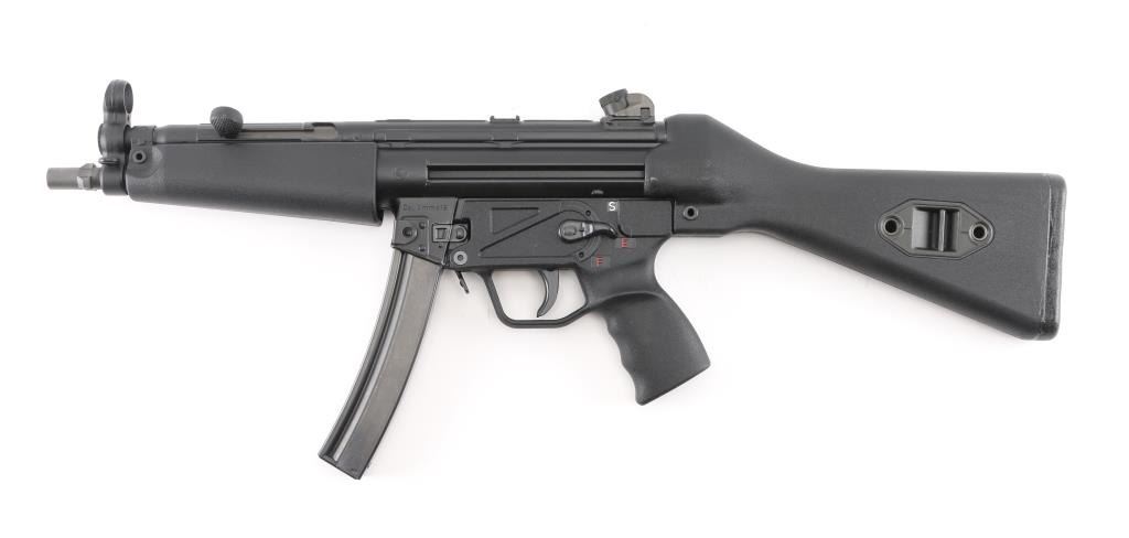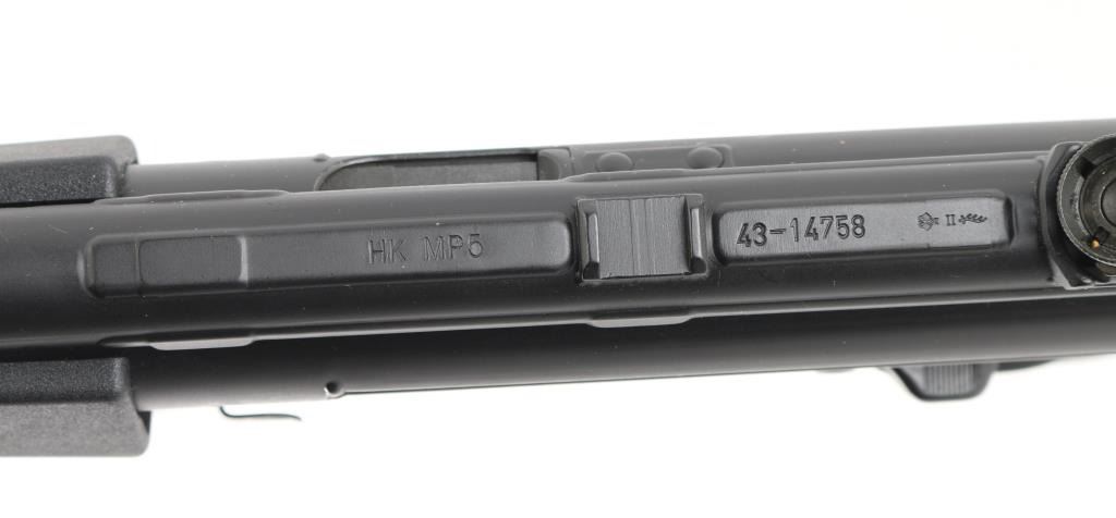 w/ Heckler & Koch MP5 (A2) 9mm SN: 43-14758 Fully transferable select fire 9x19mm machinegun. US made auto sear installed into the German HK factory made MP5 host results in a perfect example of a desirable high end German made submachinegun. "II" (1988) date code on receiver. Fires from closed bolt in full and semi. Features 9" three lug barrel, matte black finish, black polymer furniture (forend, shoulder stock, "SEF" trigger housing with pistol grip), forward sling eye, rear sling bar, adjustable sights (protected post front & turret style rear), manual safety/selector on left side at top of grip, dual mode (flipper, button) mag release. Machine gun is in perfect condition overall, with bright bore and few minor edge losses. Includes one excellent condition steel 30 rd magazine (date code "IJ"). Condition is NRA Perfect ***NFA Firearm*** ***Fully Transferable***