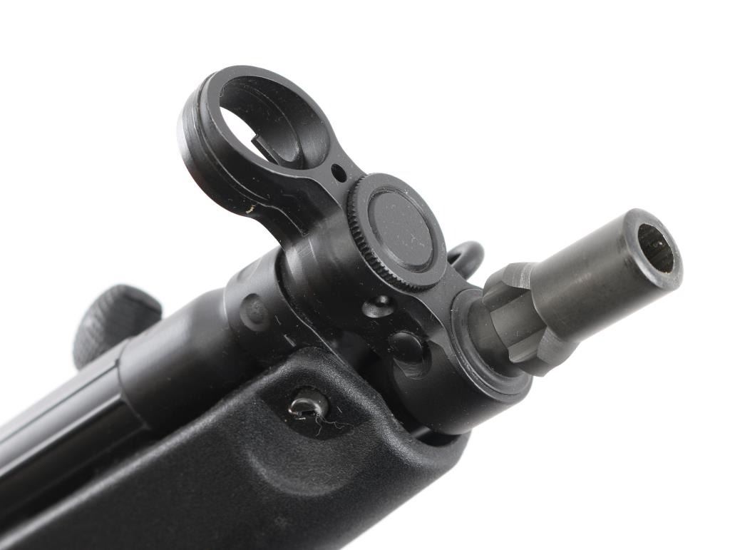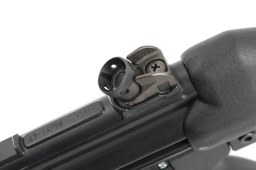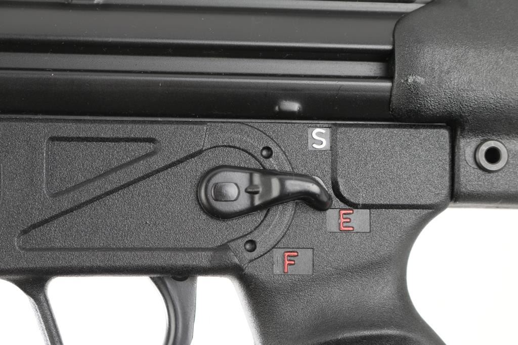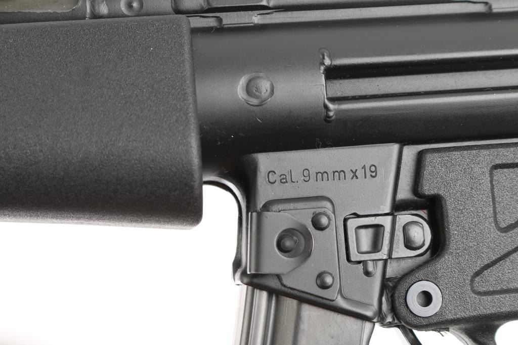 w/ Heckler & Koch MP5 (A2) 9mm SN: 43-14758 Fully transferable select fire 9x19mm machinegun. US made auto sear installed into the German HK factory made MP5 host results in a perfect example of a desirable high end German made submachinegun. "II" (1988) date code on receiver. Fires from closed bolt in full and semi. Features 9" three lug barrel, matte black finish, black polymer furniture (forend, shoulder stock, "SEF" trigger housing with pistol grip), forward sling eye, rear sling bar, adjustable sights (protected post front & turret style rear), manual safety/selector on left side at top of grip, dual mode (flipper, button) mag release. Machine gun is in perfect condition overall, with bright bore and few minor edge losses. Includes one excellent condition steel 30 rd magazine (date code "IJ"). Condition is NRA Perfect ***NFA Firearm*** ***Fully Transferable***