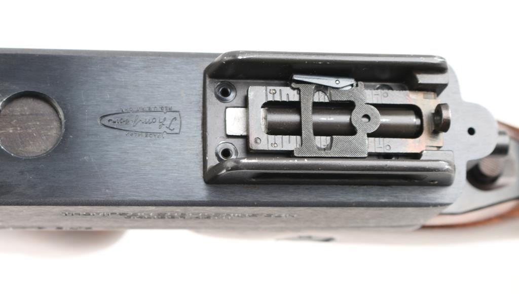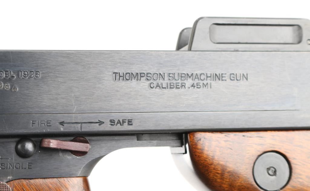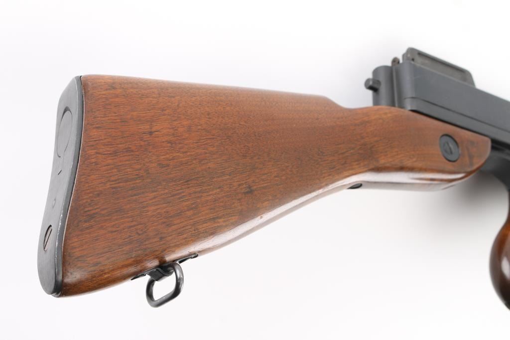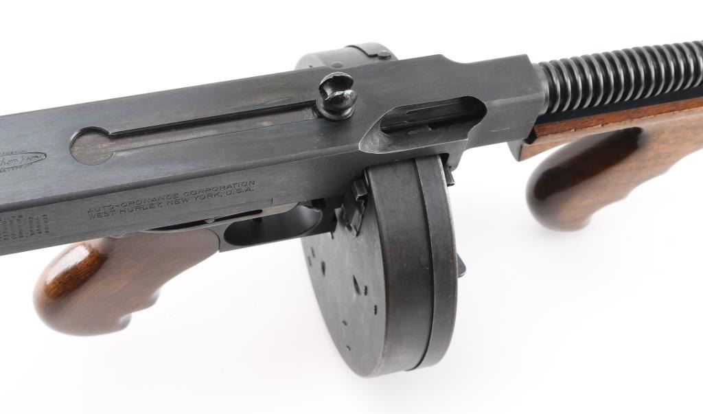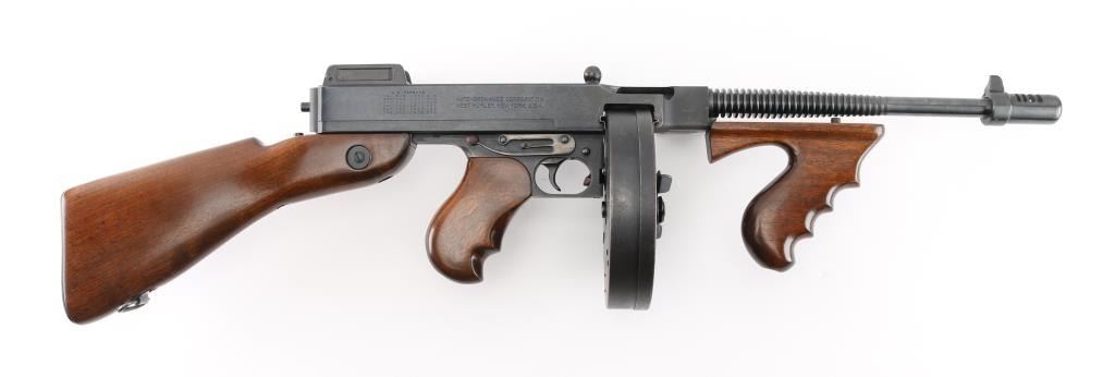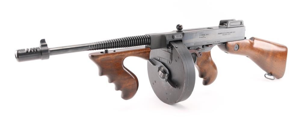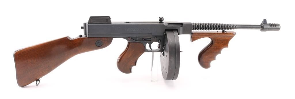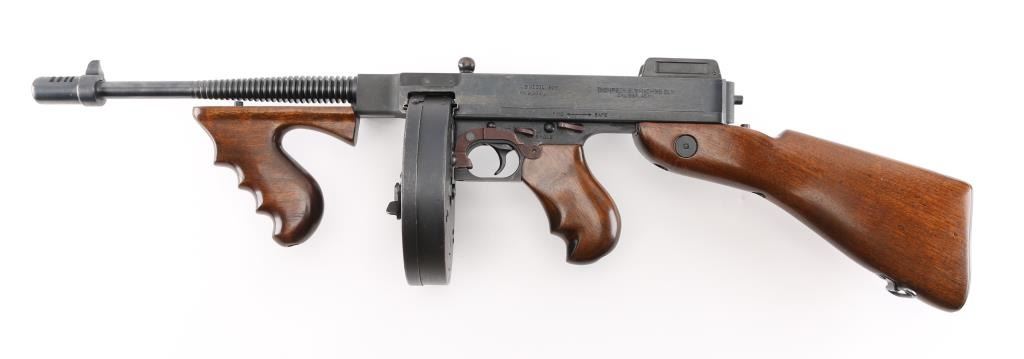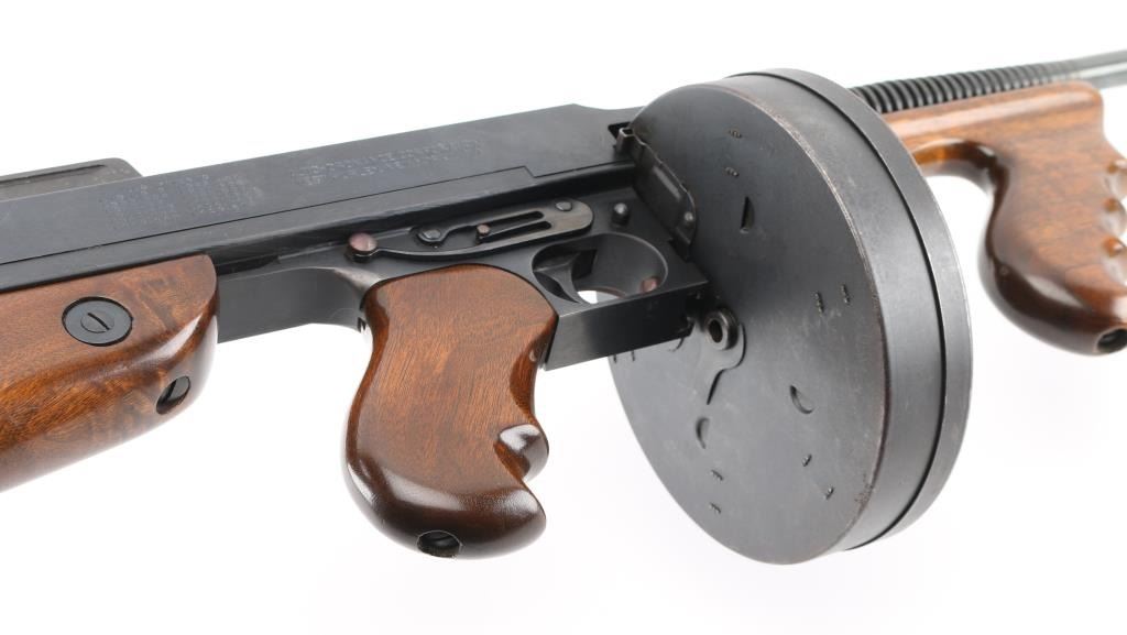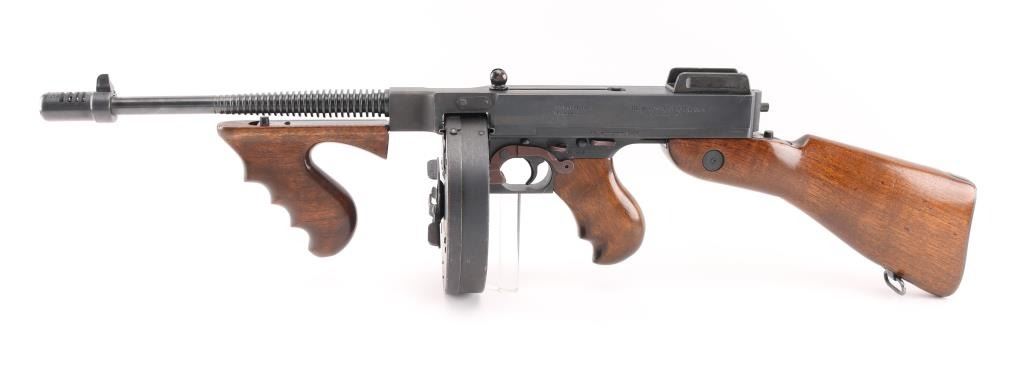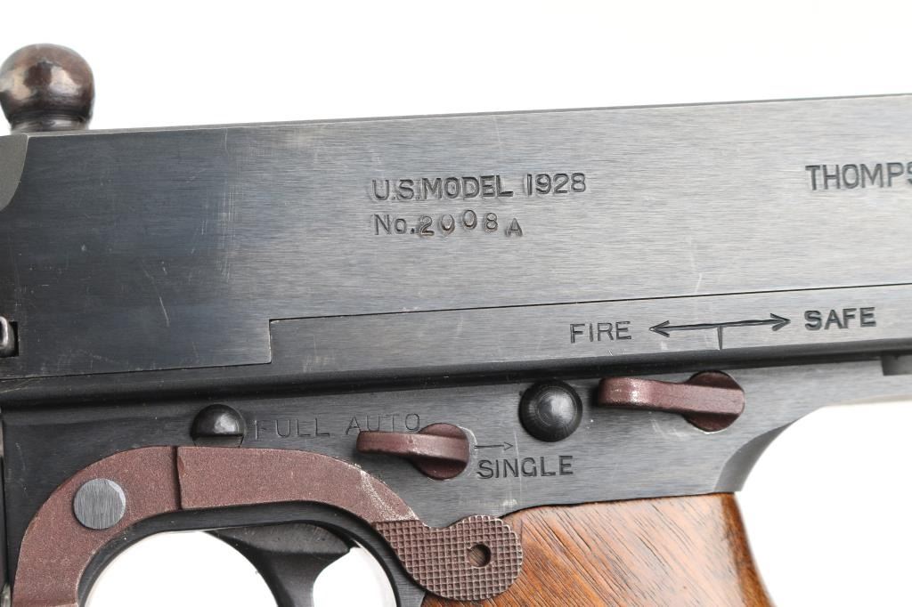 SN: 2008A Fully-Transferable commercial production Thompson sub machine gun chambered in .45 Automatic. Manufactured in the Auto-Ordnance West Hurley, NY facility circa 1975-1986. The model 1928 is the second iteration of the Thompson with a slower cyclic rate than the 1921 (600rpm vs 800rpm) as requested by the U.S.N. when Auto-Ordnance received a contract in 1928. Features a blued finish, 10.5" barrel with cooling fins, Thompson marked Cutt's style compensator with fixed blade front sight, adjustable Lyman style ladder rear sight graduated to 600 yards, smooth trigger, manual safety & fire selectors on the lower receiver/trigger housing, smooth actuator/cocking knob, Auto-Ordnance (Bridgeport, CT) Type “L” 50 round drum magazine, straight grain walnut vertical foregrip with finger grooves, pistol grip with lower finger grooves and detachable shoulder stock with trapdoor metal buttplate. Machine gun retains approximately 90% of its original blued finish showing high point edge wear, scattered scratches, & slide wear on the top of the receiver from the reciprocating cocking knob (some of that loss appears touched up with cold blue). The action is mechanically sound, the upper/lower receiver fit is extremely tight, the bore is bright and the refinished walnut stocks are good with numerous blemishes. Condition is Very Good++. ***NFA Firearm***
