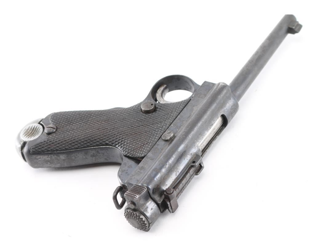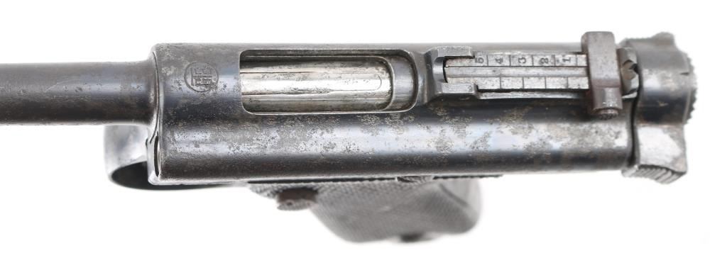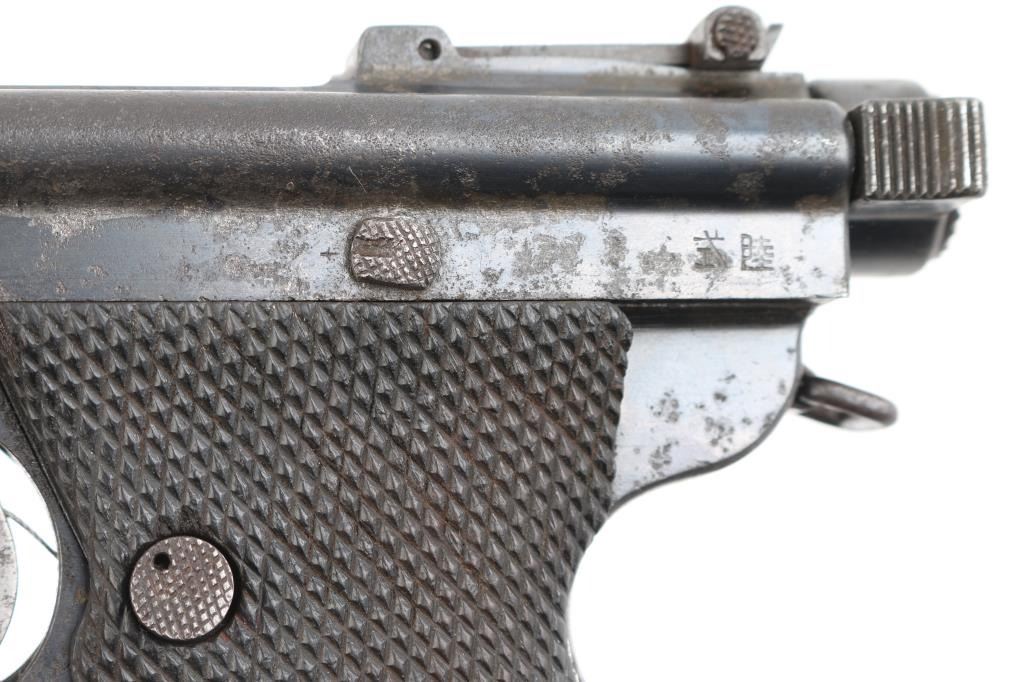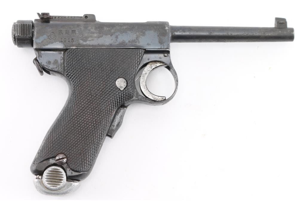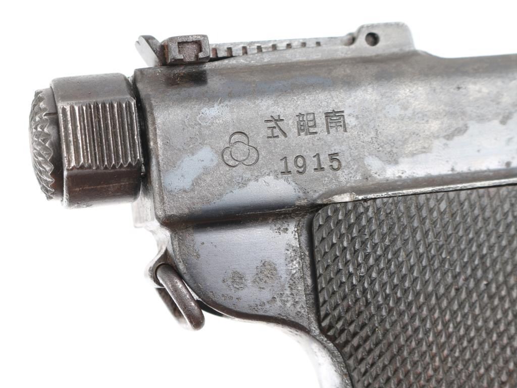 SN: 1915. Rare variant GTE pistol with Tokyo arsenal symbol on the left frame. Early production Tokyo Gas & Electric Japanese Papa Nambu Semi-Automatic Pistol Produced by the Tokyo Gas and Electric Company under Military contract with the "GTE" marking on the chamber, one piece frame with model markings and serial number, and a pair of Kanji markings on the left side. Fixed front and tangent rear sights, serrated cocking knob, grip safety on the front strap, lanyard swivel, and checkered contoured grips. 4 3/4" round barrel. Matching serial numbers on frame & backside of cocking piece,under back sides of the grip panels, and bolt. Magazine numbered '692", mag has light pitting. Bore has worn rifling with scattered light pitting, grips are very good, blue finish has faded to dull, about 70% with scattered pin-prick pitting throughout. Someone has etched some Japanese symbols on the right frame (?), there are some feint Japanese symbols painted on the left grip panels. This obscure variant has been the subject of some mystery for many years among collectors but has since been categorized and described by Derby & Brown as the “First Variation Tokyo Arsenal Contract”. It is noted as a rare variant with frame without rear milled side panels, stock slot either present or filled (Present on this example), Tokyo Arsenal symbol, and serial number range 700-2816. An interesting example for the dedicated Nambu collector. NRA Condition-Good. C&R Firearm.