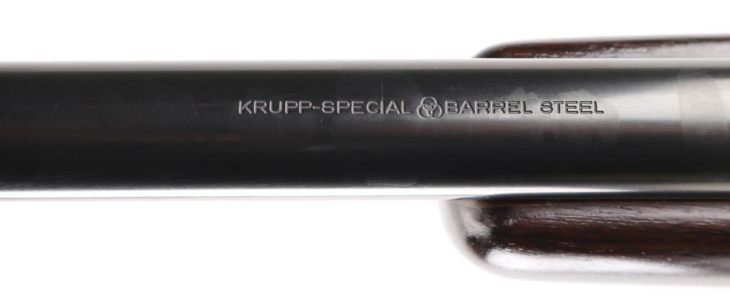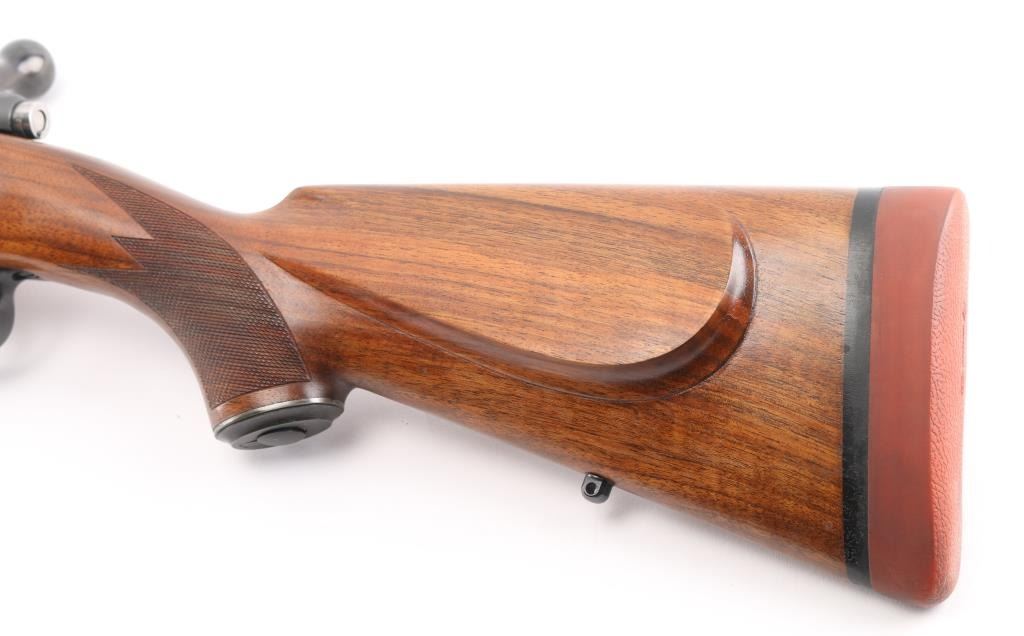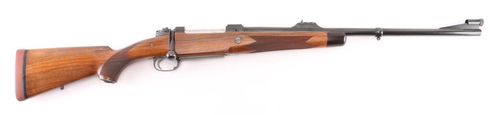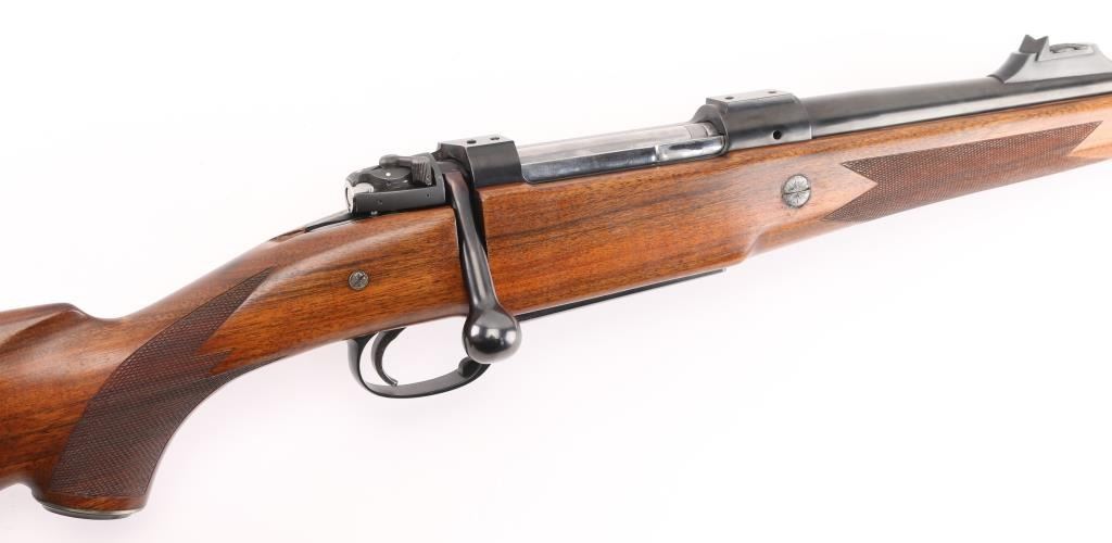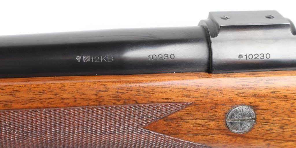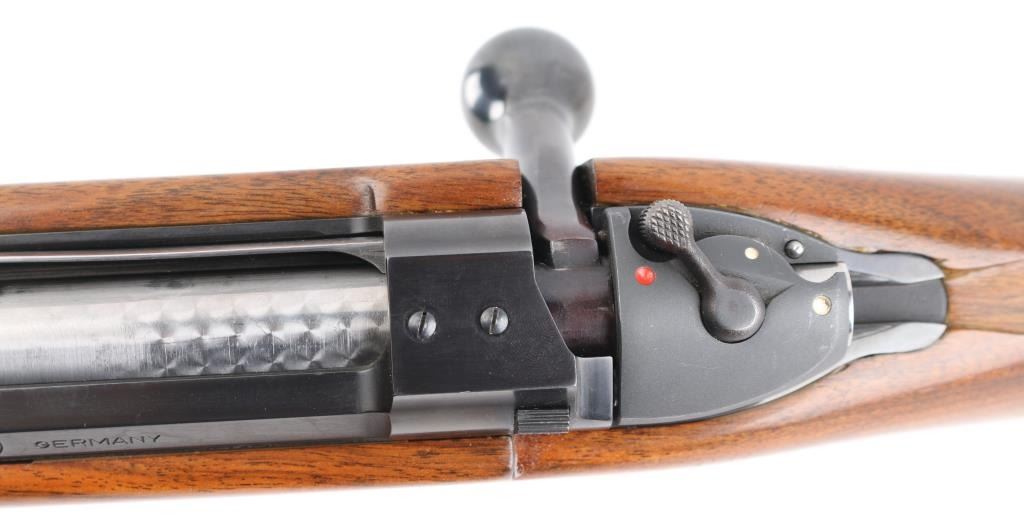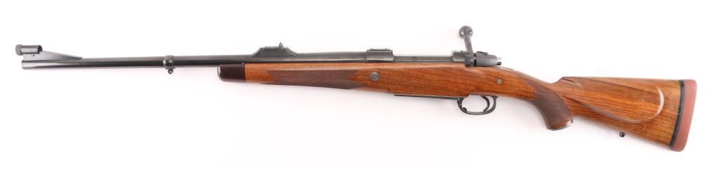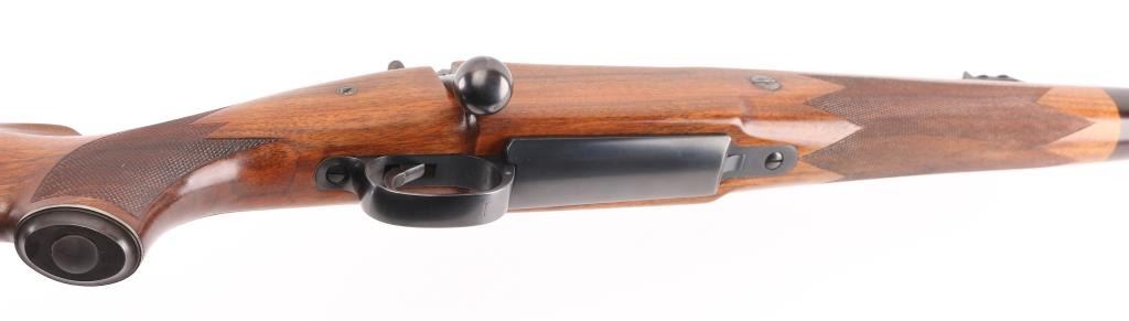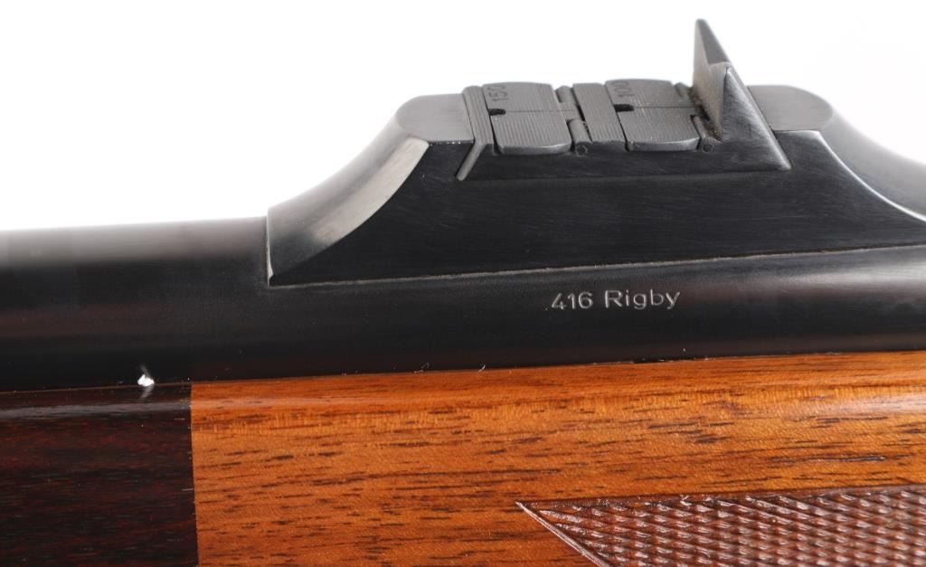 German made, imported by Heckler & Koch, Sterling VA. Heym Express .416 Rigby caliber rifle. World class bolt action safari rifle, built on Heym’s proprietary double square bridge controlled feed action. 24" Krupps special steel barrel, Griffin & Howe ramped front sight base with hooded post/bead front sight, 2-leaf express rear sight, barrel band sling swivel stud, hinged steel floorplate,oversized bolt handle & knob, jeweled bolt, and steel pistol grip cap. The stock is of beautiful Deluxe figured walnut with Rosewood forend tip, shadow line check piece, checkered panels on forearm & wrist. LOP is 14” over a recoil pad. Bore is excellent/bright , wood and finish are excellent. An outstanding rifle. NRA Condition-Excellent. Modern Firearm.