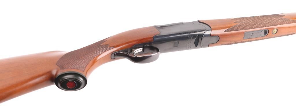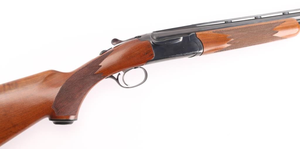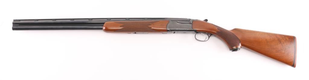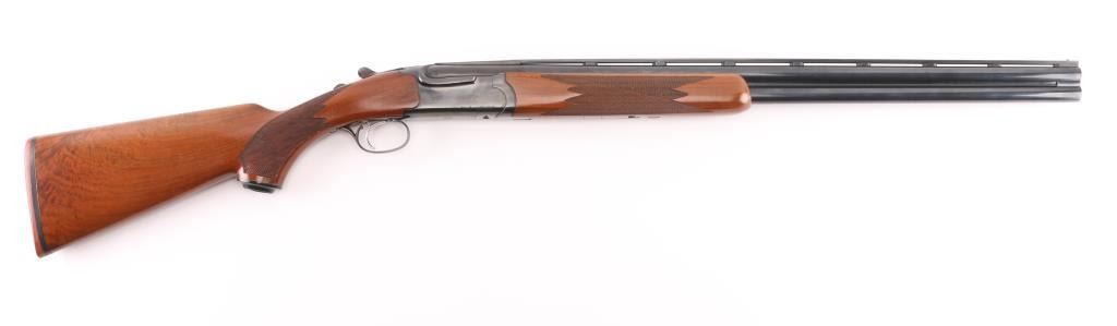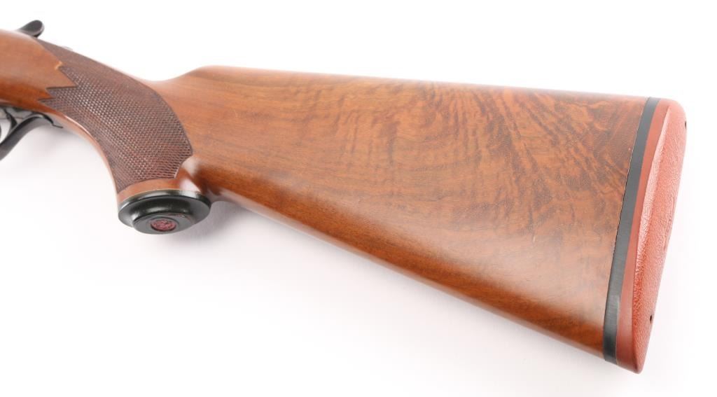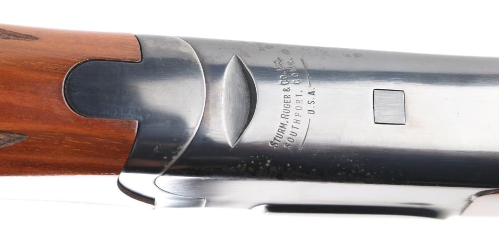 Over-under shotgun with 26" vent rib barrels, integral skeet chokes, bores are bright, bead front sight, chambered for 3" shells, serrated barrel release lever and tang-mounted safety, smooth trigger, checkered forend, wrist and grip, stocks are in very good condition with slight wear, barrel finish is excellent, receiver finish shows considerable wear on the bottom, rubber Ruger recoil pad, LOP 14". Includes one box of 2 1/2" #8 shells. **NRA Very Good** Modern Firearm