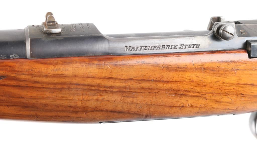 Austrian made bolt action rifle, blued finish, approximately 25" barrel, bore is bright, blade front sight mounted on a ramp, open notch rear sight, the safety is located at the rear of the bolt, wood 2/3-length stock, the stock is checkered at the forearm and the pistol grip, metal sling swivels, the metal is in excellent condition, the stock has scratches and dents, the double set triggers are functional. This rifle comes with a flat "butter knife" bolt handle that is located well forward of the trigger guard. This is due to the design of the short stroke action, which has a split rear receiver ring through which the bolt handle passed as it was drawn back. Cartridges were fed from a 5-round Schoenauer spool magazine (hence the name Mannlicher-Schoenauer). **NRA Very Good** C&R Firearm