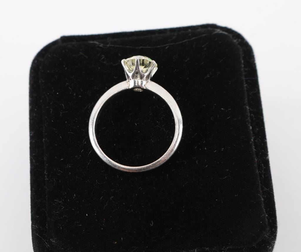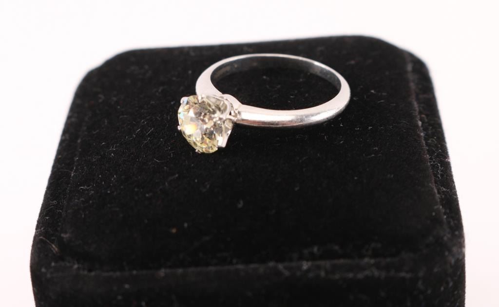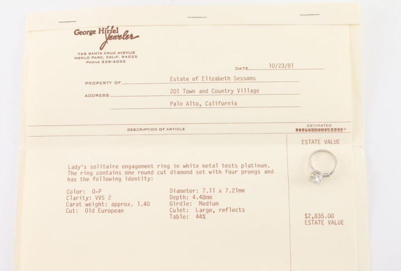 7.11mmx7.21mmx4.48, 1.40ct. Total weight 4.3grams set in platinum band. Size 6. Includes appraisal from George Hirzel Jewelers confirming size of stone. Color O-P Clarity VVS 2 1.40 carat