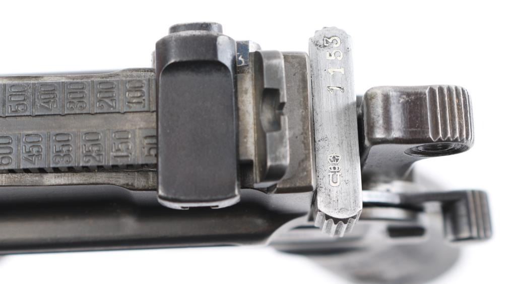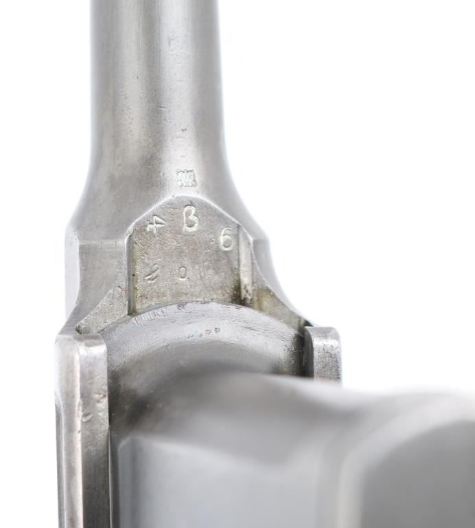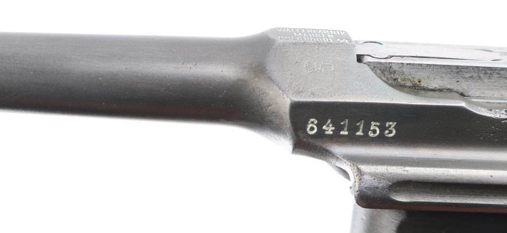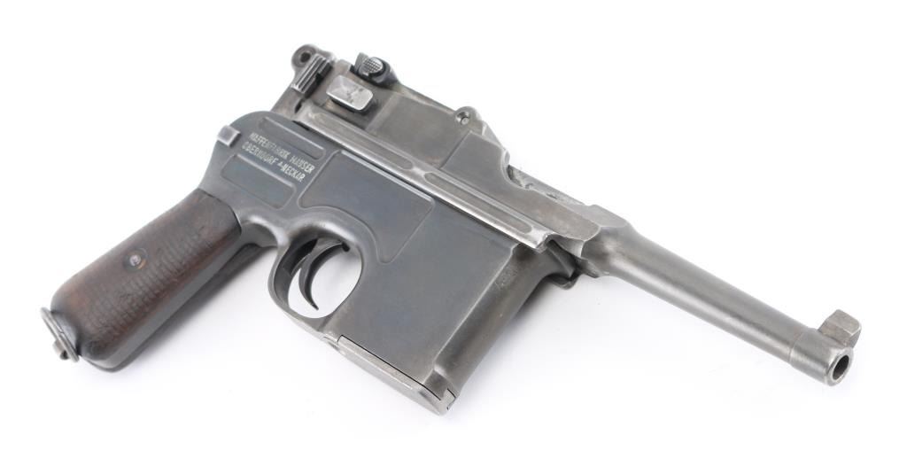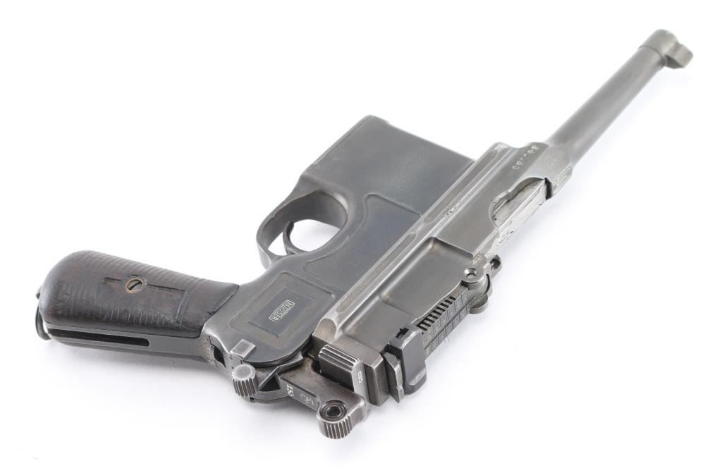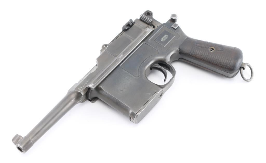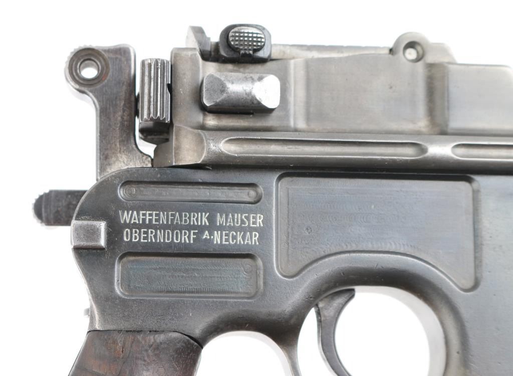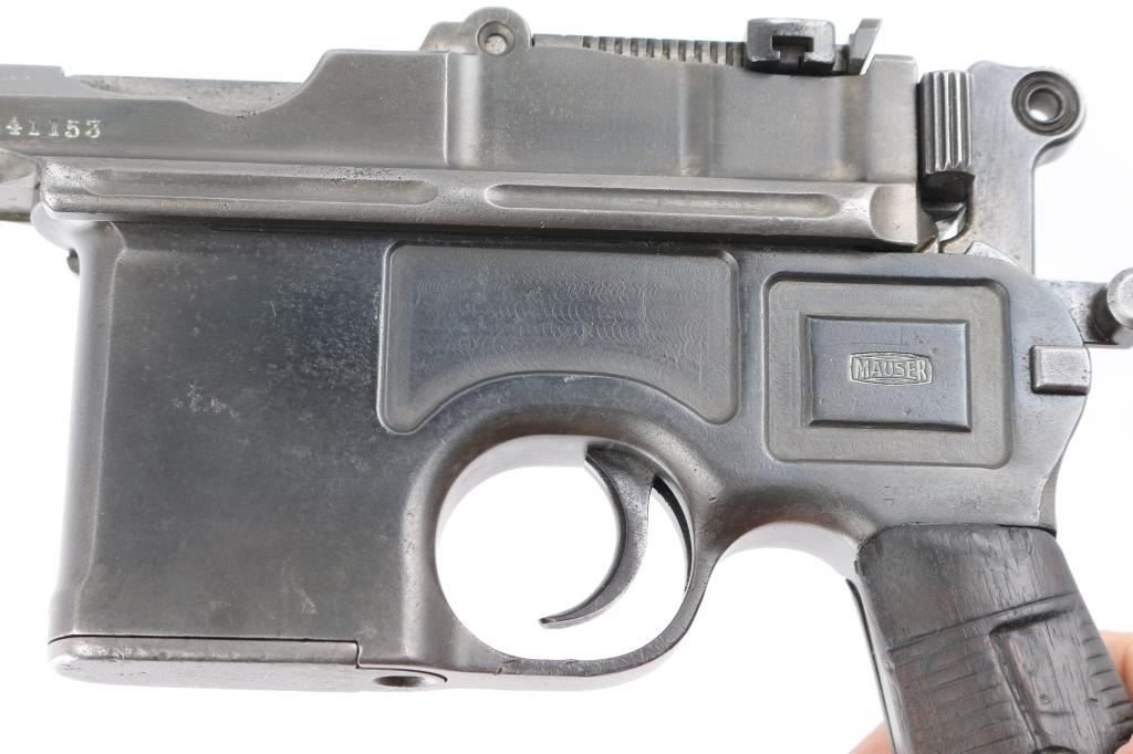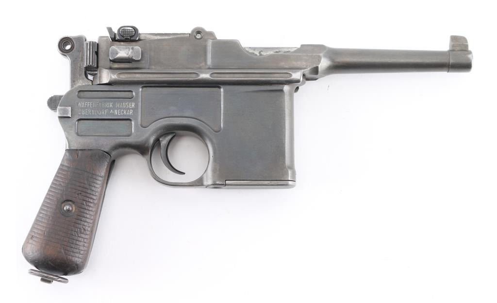 'Broomhandle' German semiautomatic pistol, features blued finish, grooved wood grips, 4" barrel, blade front & tangent rear sights, fixed 10 round magazine, manual safety, lanyard ring at butt. Bore is fair condition, strong rifling with light pitting in the groves. Old reblued finish has dulled, edge/handling wear, areas of scattered light pitting under the finish. Markings are crisp, highlighted in white. including Waffenfabrik Mauser Oberndorf a Neckar " on right side of frame. crown U proofs. All matching serial numbers. Mauser banner on left frame, and Mauser address on barrel. Grips fair condition with heavy wear. NRA Condition- Near Good. C&R Firearm.