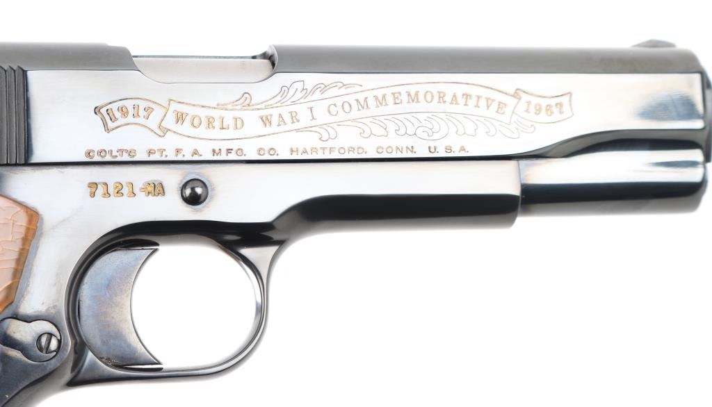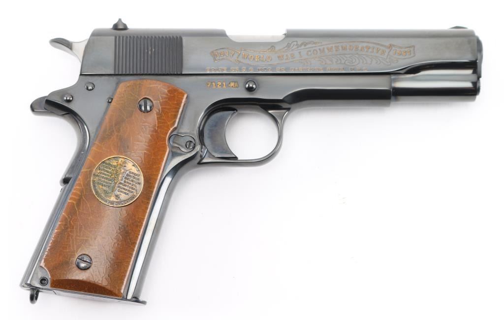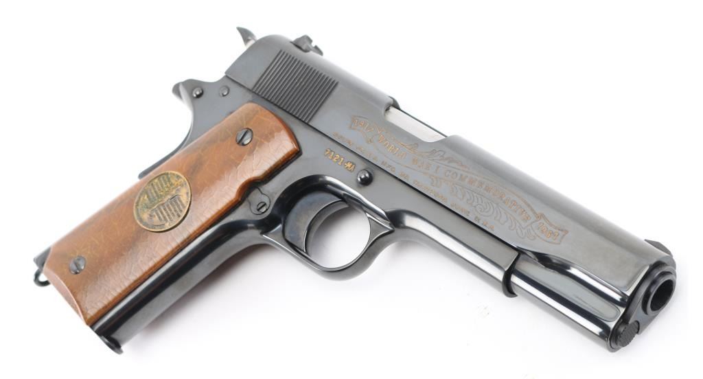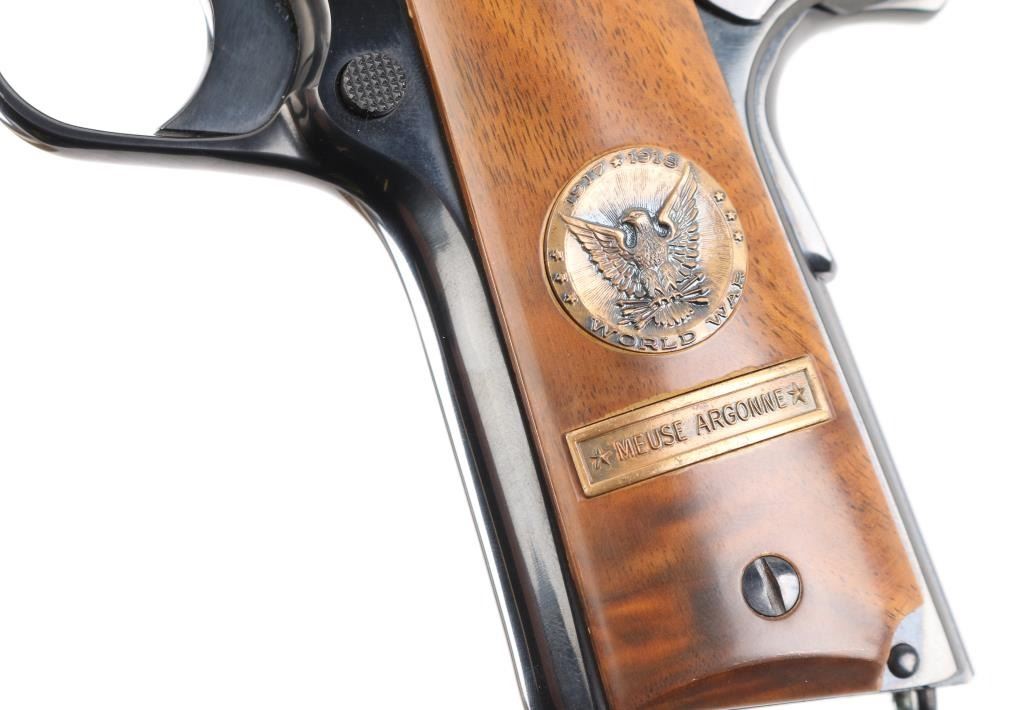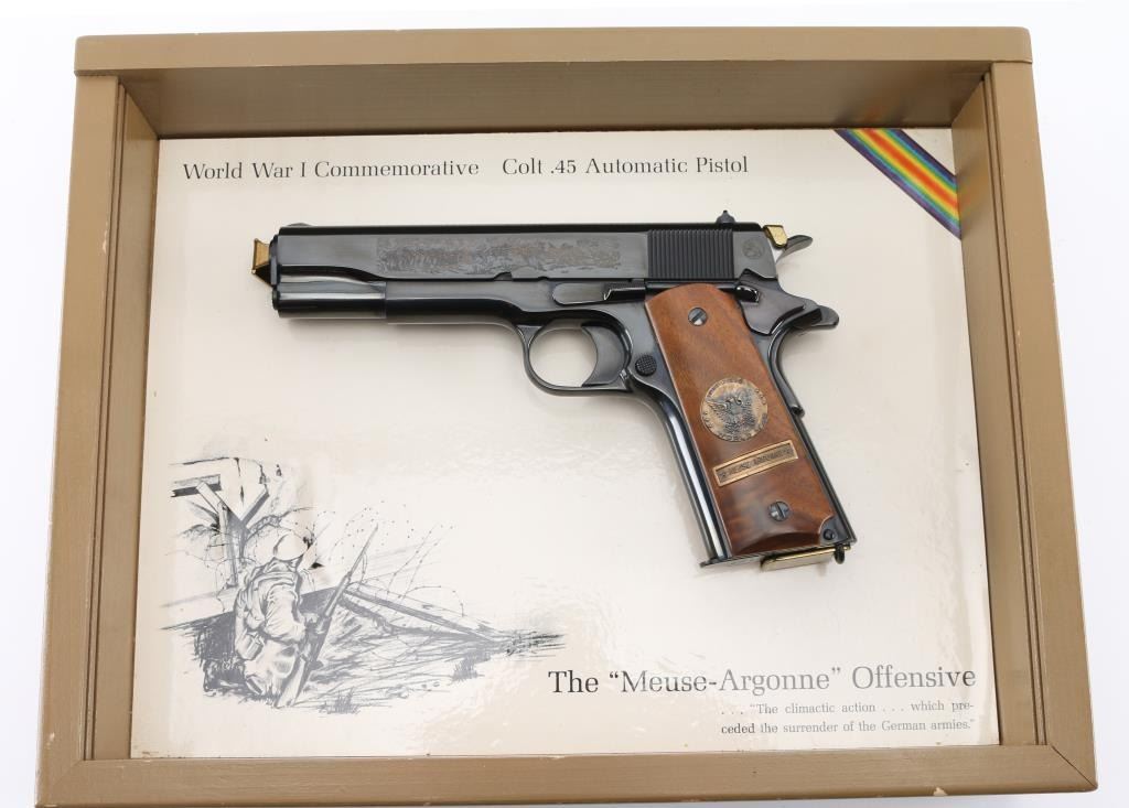 SN: 7121-MA Pistol. Semi-Automatic. 7+1 capacity. In 1968 Colt wanted to commemorate WW1 by producing a Model 1911 in remembrance of the 4 most noted battles of WW1. This pistol is for the battle of the Meuse Argonne. Production for each model was 7400. All were Pre-series model 70's with flat mainspring housings, long triggers, checkered slide stop and safety. Checkered wide hammer spur, and type 2 beveled proper rear sight. High polish blue finish with smooth wood grips.. The left slide has a roll engraved battle scene, and the right has the WW! banner with "1917-1967, the 50th anniversary of entering the war. All gold toned. Left grip has Eagle medallion with "1917 1918, World War" with "Meuse Argonne" under it. Right grip was Doughboy medallion listed the Countries that fought in WW1. Lanyard ring in place. Bore is excellent/bright. Slide action is smooth/tight. Blued finish is about 99%. Grips are good with the right panel showing evidence of the tape used in the shadow box with finish loss. Comes with original Colt magazine, and original display shadow box, with battle scenes, and history of the battle. Note* There are the three other battle guns with the same serial number, with different initials of the battle. Would make a great set. NRA Condition-Excellent. C&R Firearm.