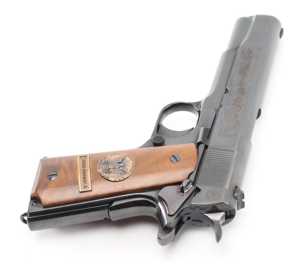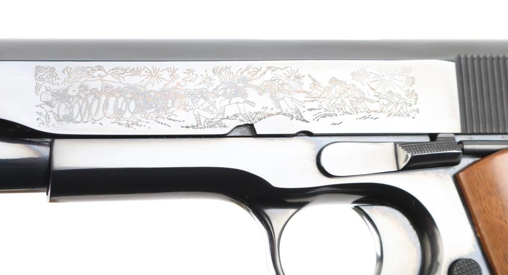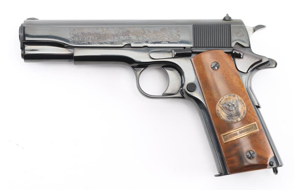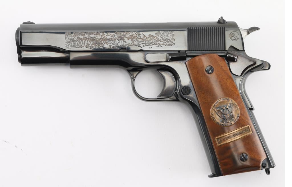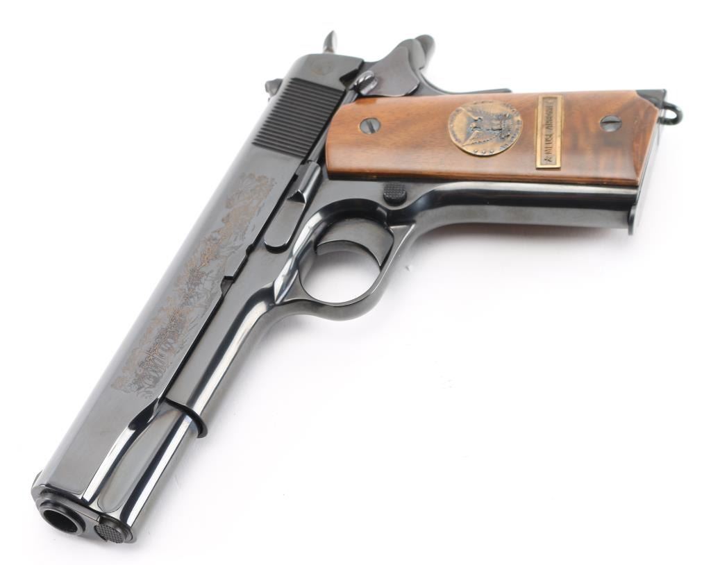 SN: 7121-MA Pistol. Semi-Automatic. 7+1 capacity. In 1968 Colt wanted to commemorate WW1 by producing a Model 1911 in remembrance of the 4 most noted battles of WW1. This pistol is for the battle of the Meuse Argonne. Production for each model was 7400. All were Pre-series model 70's with flat mainspring housings, long triggers, checkered slide stop and safety. Checkered wide hammer spur, and type 2 beveled proper rear sight. High polish blue finish with smooth wood grips.. The left slide has a roll engraved battle scene, and the right has the WW! banner with "1917-1967, the 50th anniversary of entering the war. All gold toned. Left grip has Eagle medallion with "1917 1918, World War" with "Meuse Argonne" under it. Right grip was Doughboy medallion listed the Countries that fought in WW1. Lanyard ring in place. Bore is excellent/bright. Slide action is smooth/tight. Blued finish is about 99%. Grips are good with the right panel showing evidence of the tape used in the shadow box with finish loss. Comes with original Colt magazine, and original display shadow box, with battle scenes, and history of the battle. Note* There are the three other battle guns with the same serial number, with different initials of the battle. Would make a great set. NRA Condition-Excellent. C&R Firearm.