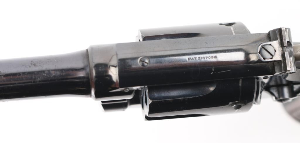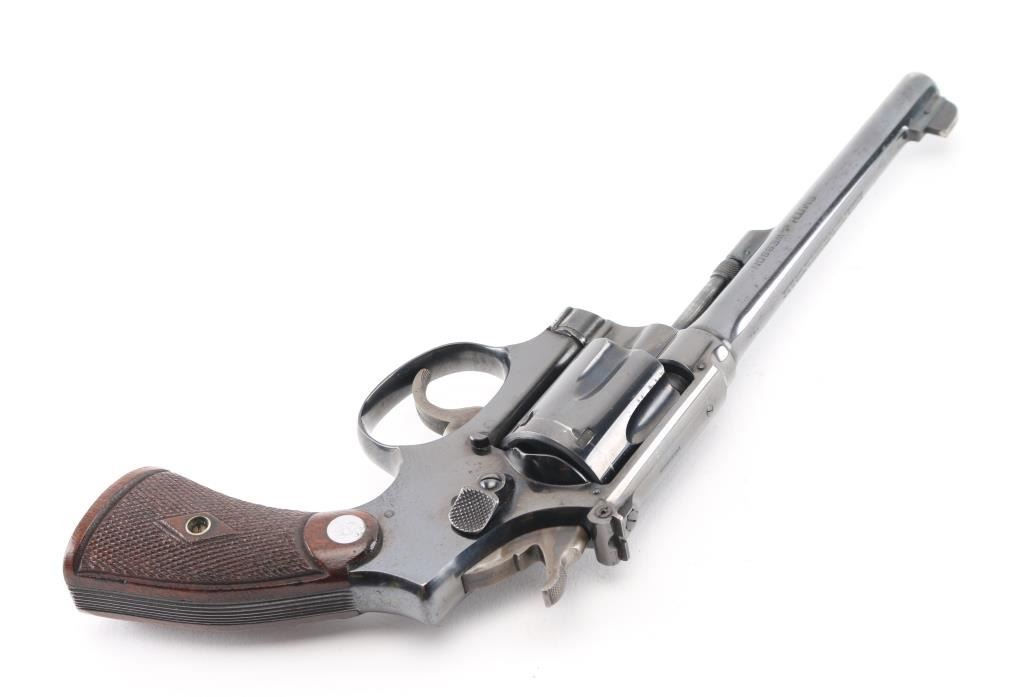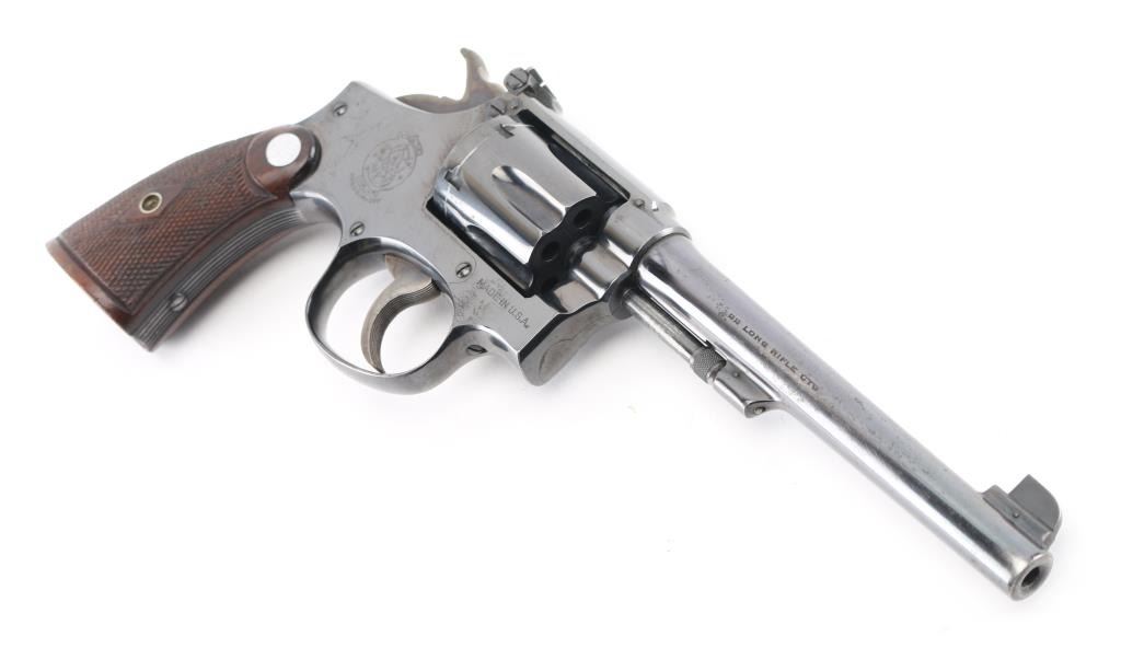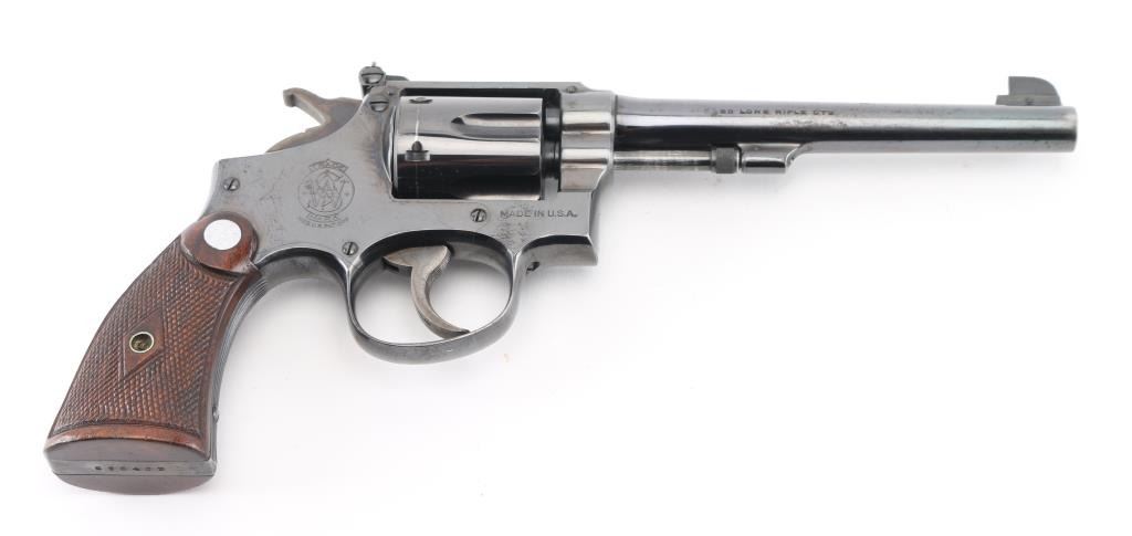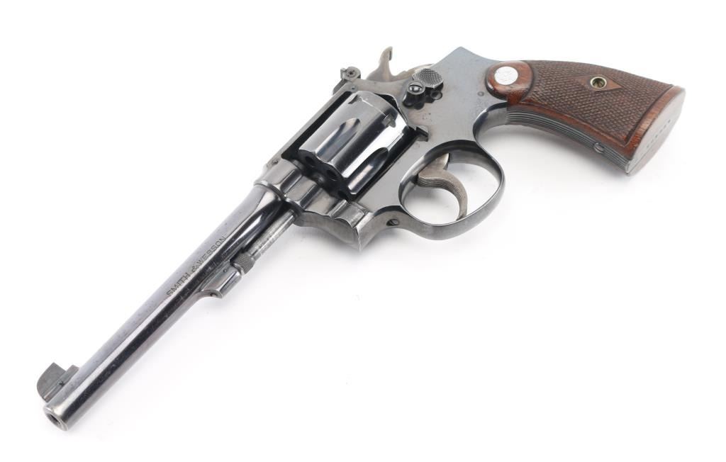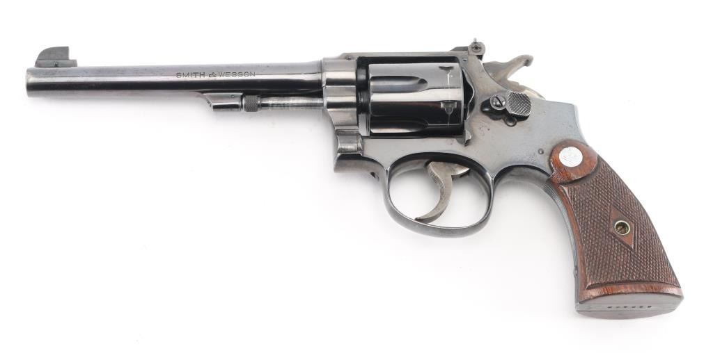 Early K frame circa 1941. Double action "four screw" 6 shot target revolver. Polished blue finish, Pinned 6" barrel, blade front sight with dot and rear adjustable target sights, diamond center checkered walnut wood grips with Smith and Wesson medallions, stamped matching serial number inside right grip panel. Revolver retains approximately 95% of it's original bright blued finish showing edge wear, a drag line on the cylinder. Action is smooth with tight lock-up. Condition is near NRA Very Good. ***C&R Firearm***