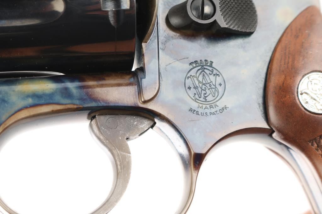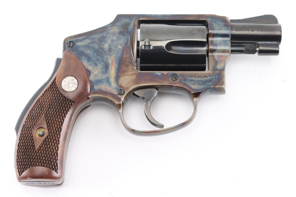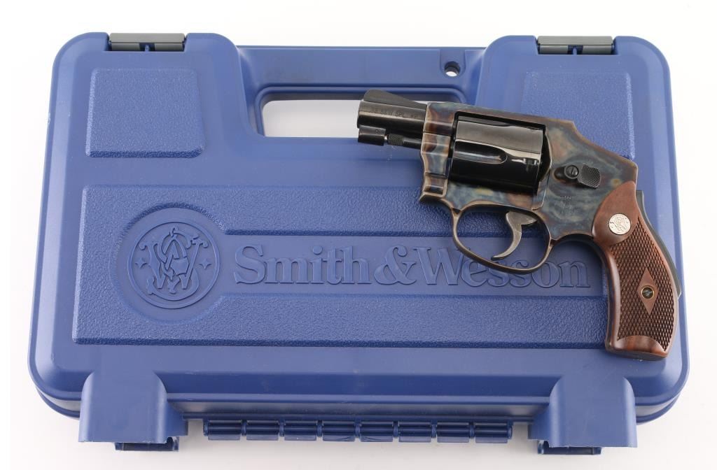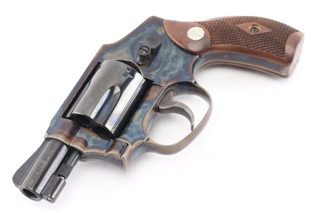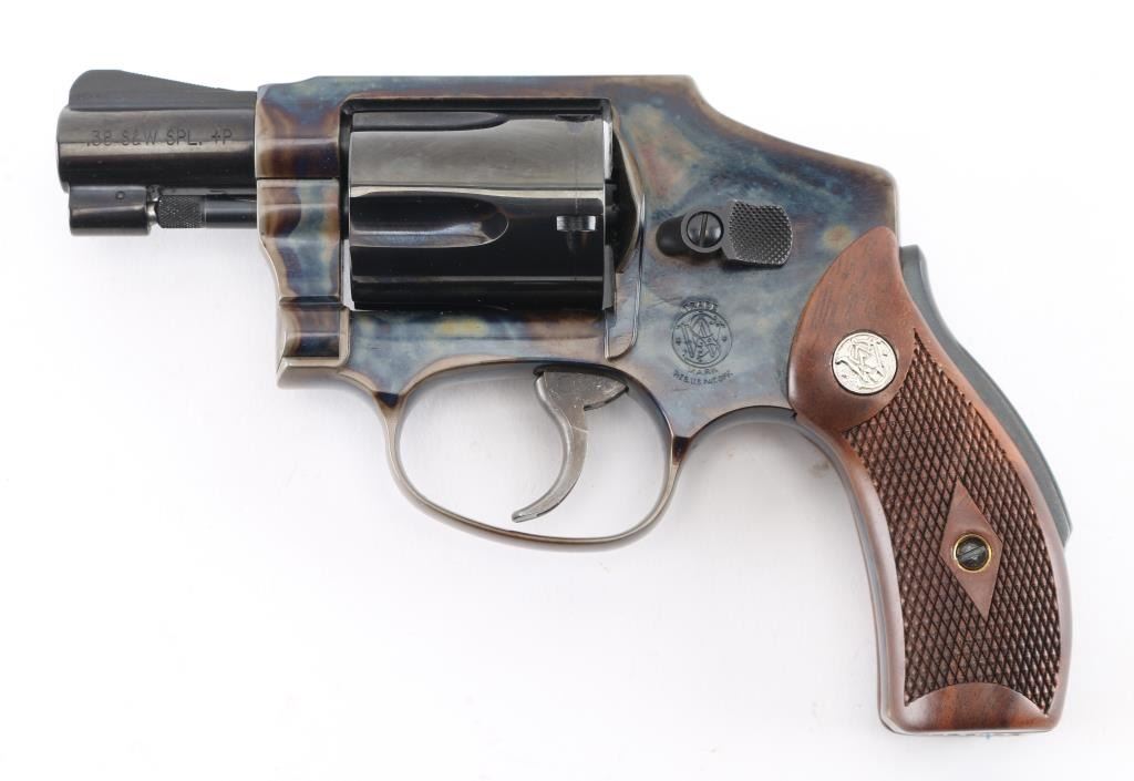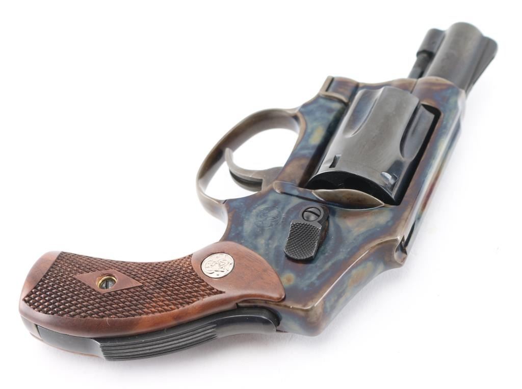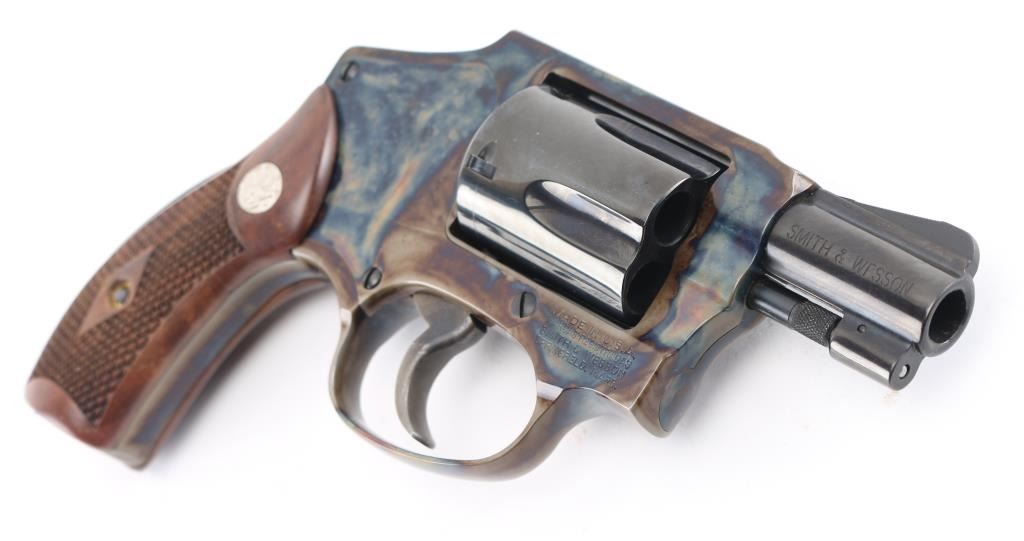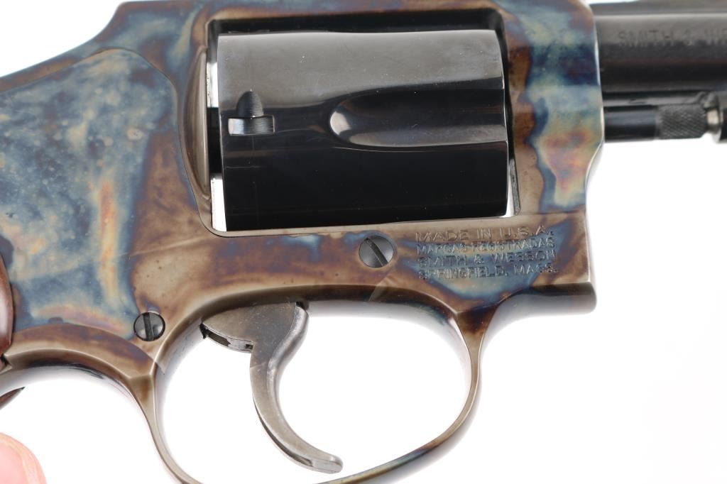 Out of production five shot revolver in.38 special. It has a 2" barrel, fluted cylinder, fixed ramp front sight, notch rear, hidden hammer, smooth trigger, blued barrel and cylinder, color case hardened frame, grip safety and diamond checkered wood grips with gold tone S&W medallions. Revolver retains approx 99% of its original finish showing a slight drag line on the cylinder and a few superficial scratches on the frame. Action is sound with tight lock up, the bore is pristine and the wood grips are excellent. Includes the original factory hard case. Condition is NRA Excellent *Modern Firearm*