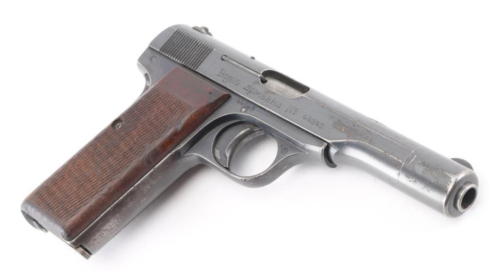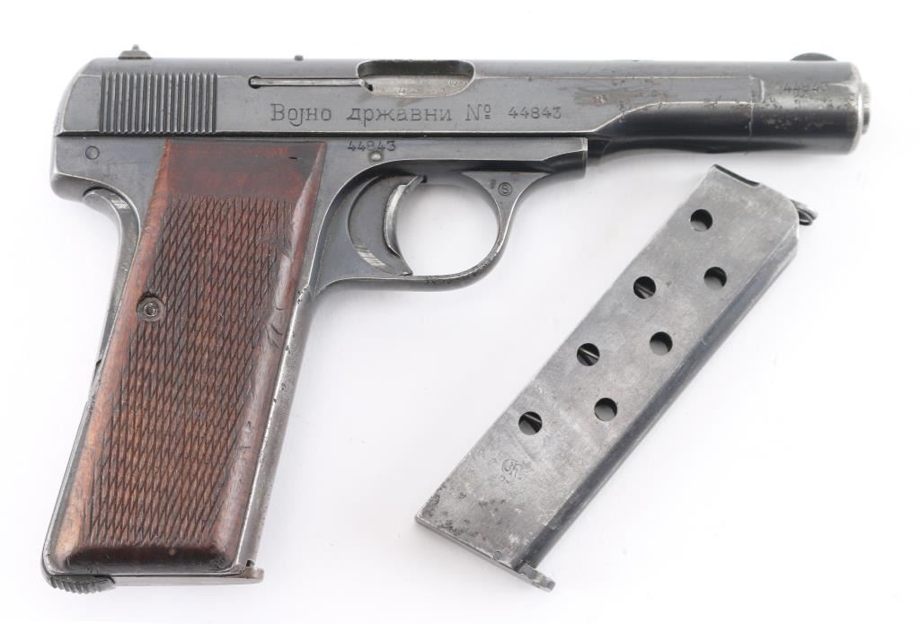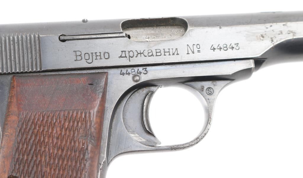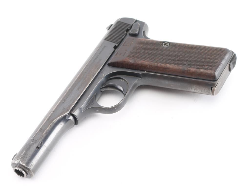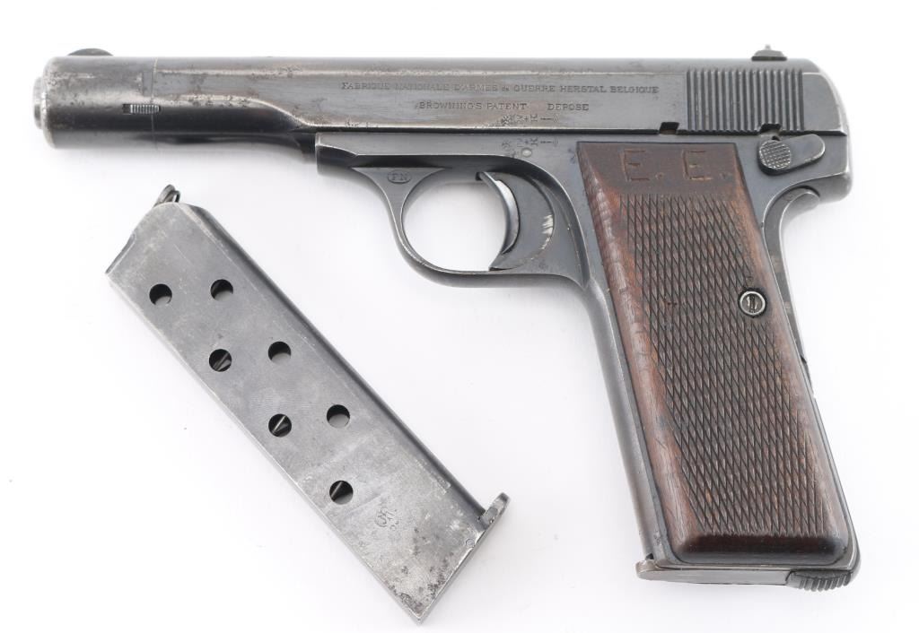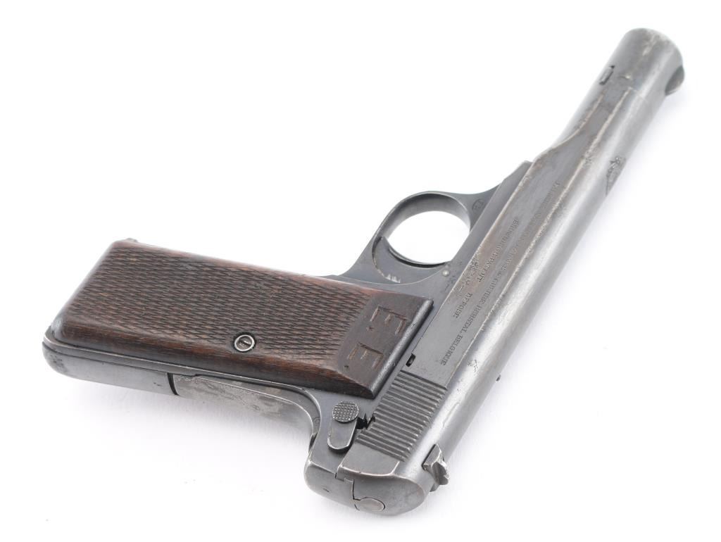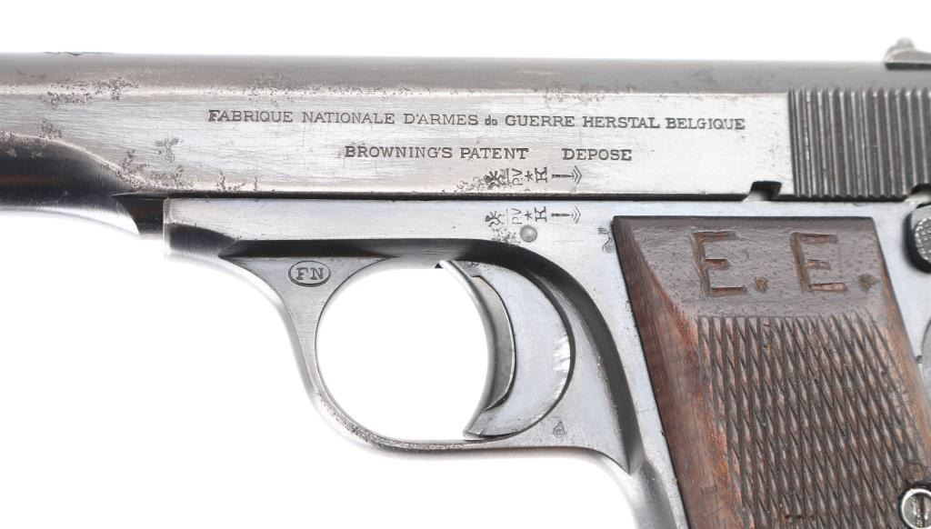 This is a scarce FN Model 1922 that was part of a Yugoslavian military contract order. The right side of the slide features an inscription indicating Yugoslavian Army State issue, and the top of the slide features the Yugoslav crest as applied to all Army State and Officers' pistols. There are two Third Reich era Eagle/Swastika acceptance stamps on the left slide & frame. The gun is all matching and original but shows thinning finish in several areas and some light scattered pin-prick pitting mostly on the left slide. Original grips show some smoothing and handling wear but no cracks or chips. Someone has carved 'E.E.' in the left panel. Bore is very good/bright. Action is crisp/tight, blue is about 60%. Comes with two FN marked magazines. NRA Condition-Good. C&R Firearm