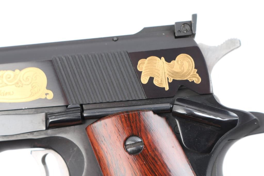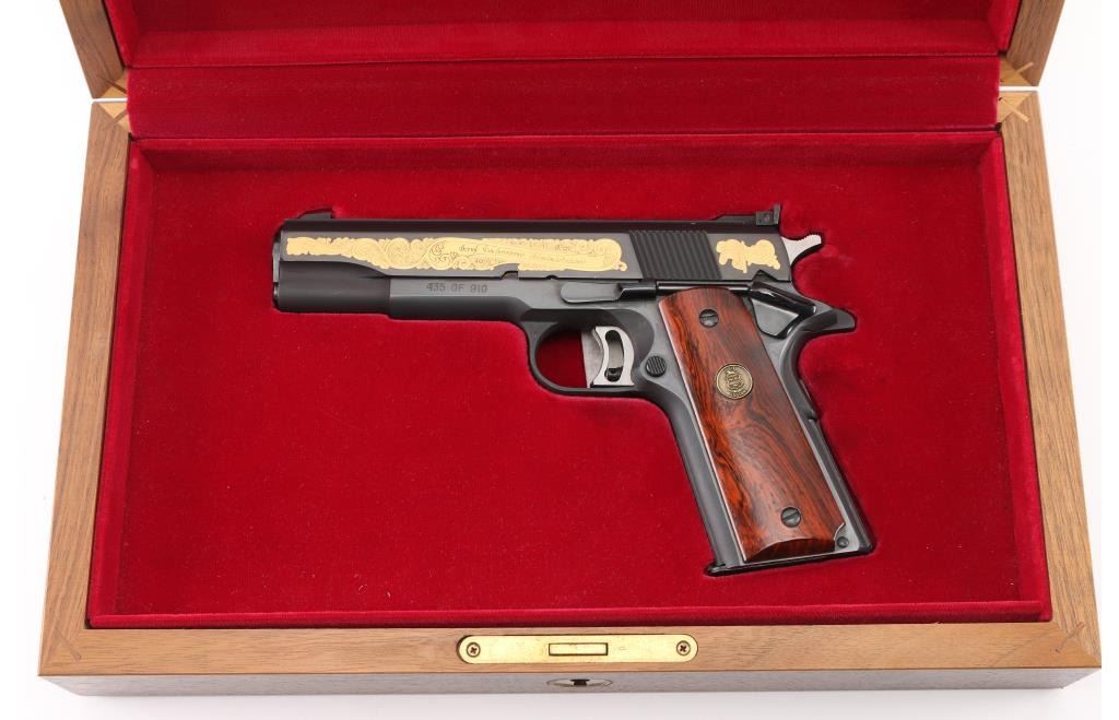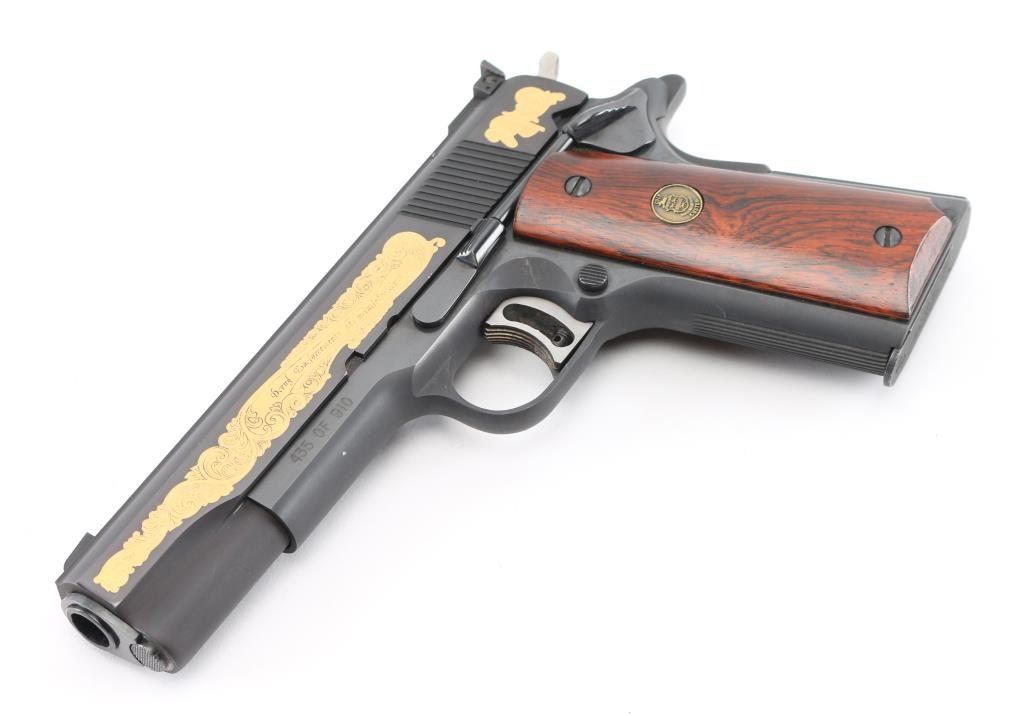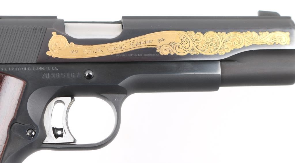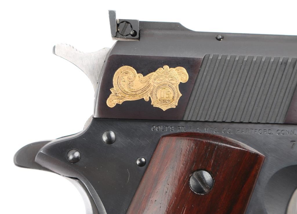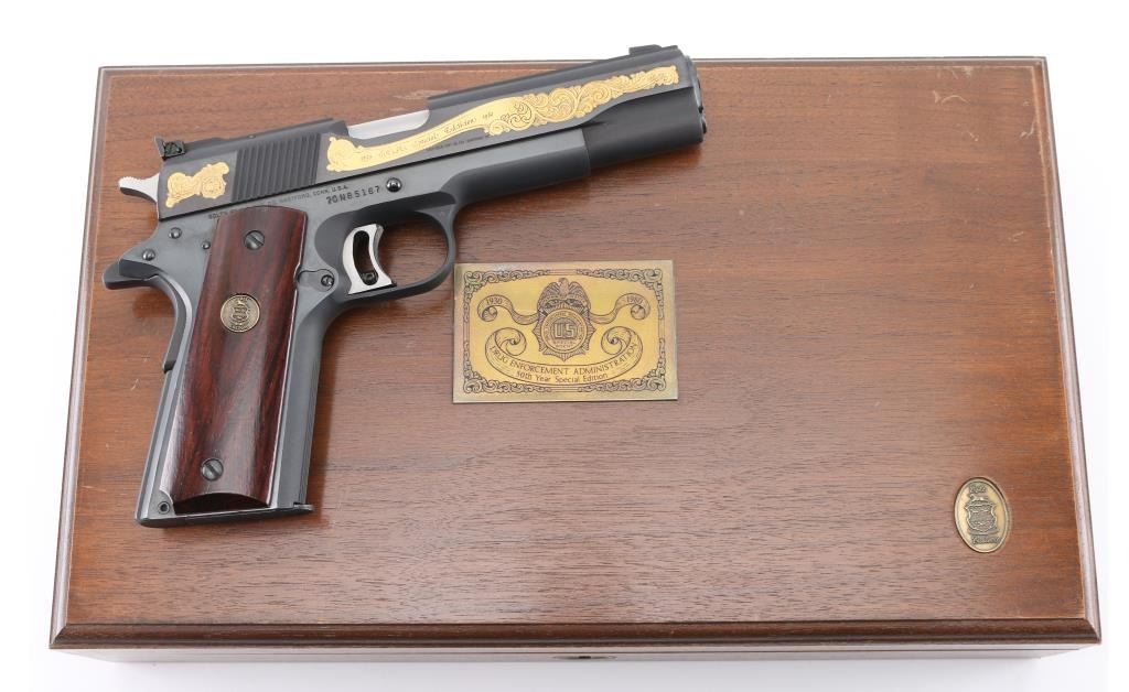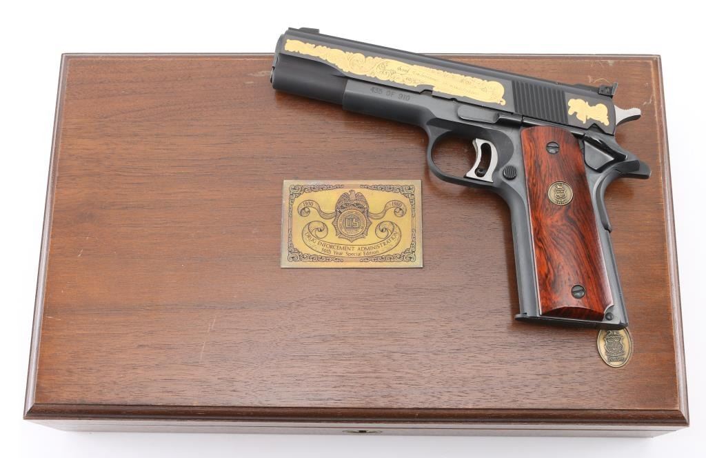 Sn: 70N85167 American made 1911A1 pattern single action semi-automatic pistol manufactured circa 1980. Features matte blued finish with polished sides. Printed on left side of frame 435 of 910. Left side of slide Gold Floral engraving states 50th Year Drug Enforcement Administration with a gold flag by the hammer. Right side 1930 D.E.A. Special Edition 1980 in Floral scroll engraving. It has a 5" barrel, fixed blade front sight, Elliason adjustable rear sight, serrated adjustable trigger, serrated hammer spur, thumb safety on the left side of the frame, extended beavertail grip safety, push button magazine release, steel frame, serrated mainspring housing with serrated front strap and smooth wood grips with gold color Colt Custom medallions. Bore is excellent condition. Metal finish looks good with no signs of use, wear or handling. Wood grips look good. Gun comes in special wooden presentation box with red felt lining. Box lid has metal plaque reading 1930-1980 Drug Enforcement Administration 50th Year Special Edition. Condition is NRA Near Perfect *** Modern Firearm ***