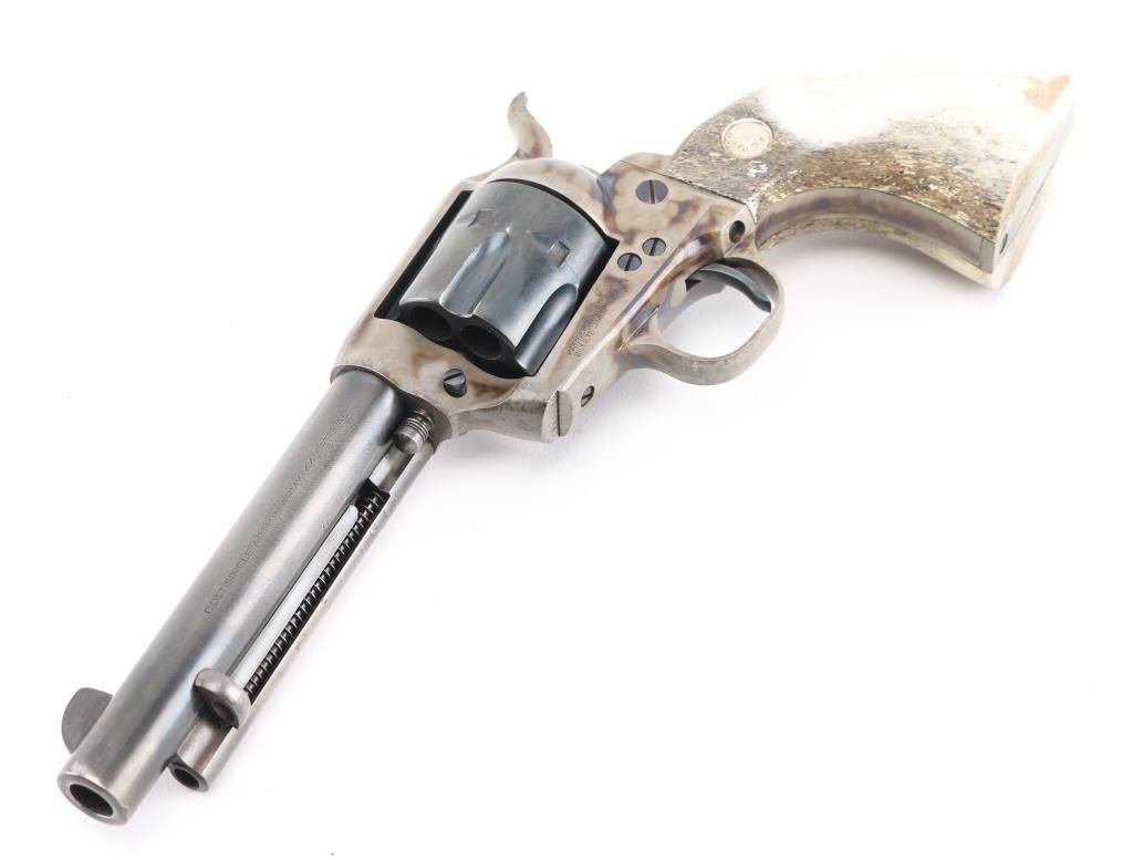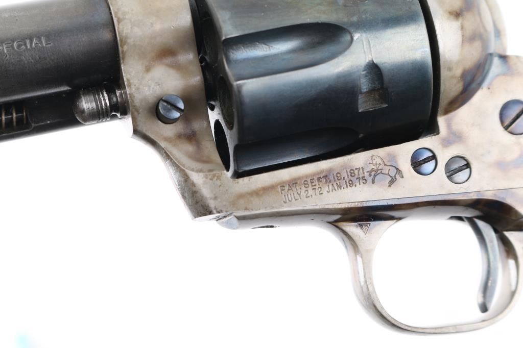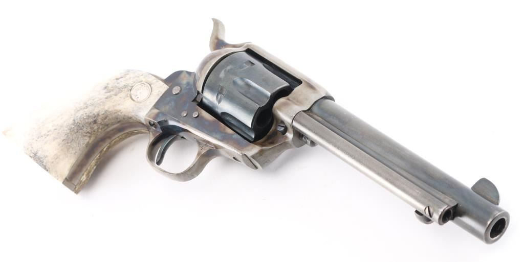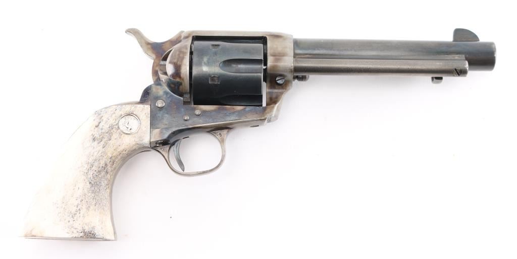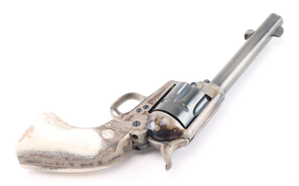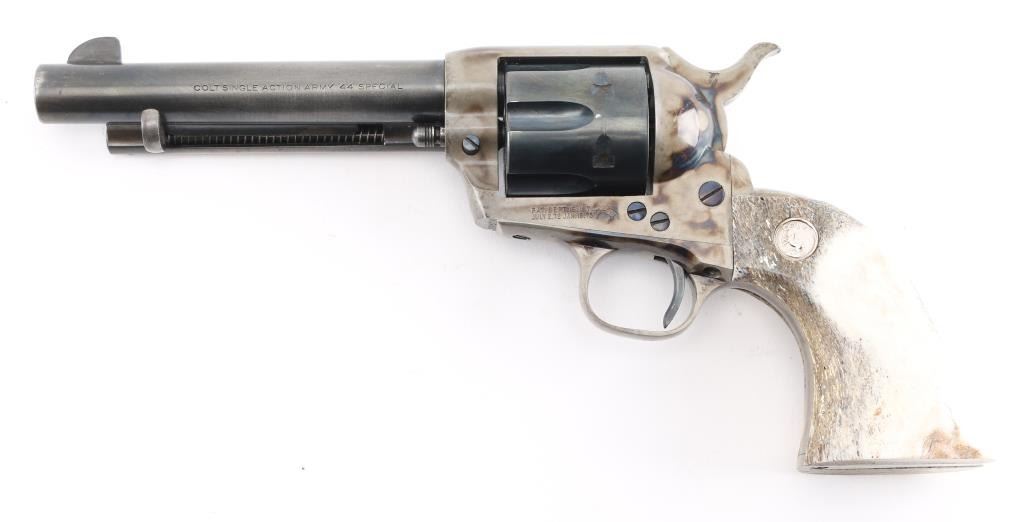 Professionally restored 2nd Generation Colt SAA. 5 1/2" barrel. Manufactured 1957. Tuned action. Blue refinish, case hardened frame & triggerguard, oversize stag grips with 'Rampant' Colt medallions. Serial numbers on frame. Assembly number "703" on loading gate. One line Colt address on top of barrel, "Colt Single Action Army .44 Special" on left side. Bore is excellent/bright, action is crisp/tight,. Blue is about 70% with handling wear to the barrel & extractor housing. Grips are very good. Case hardened frame & triggerguard are very good, all markings are crisp/clear. NRA Condition-Very Good as restored. C&R Firearm.