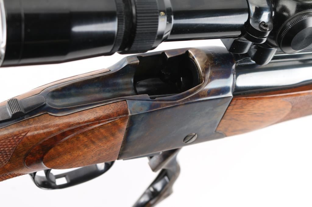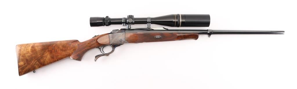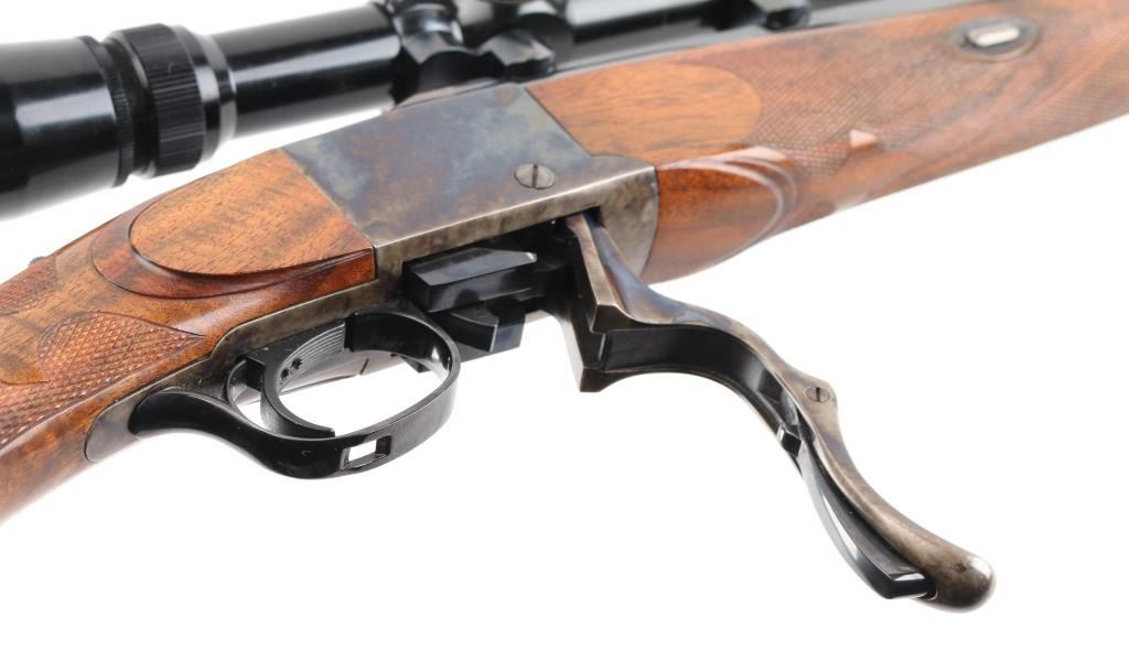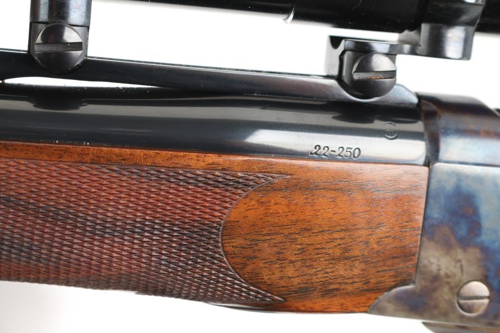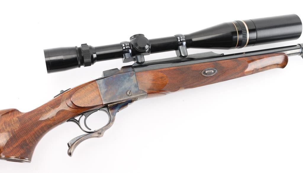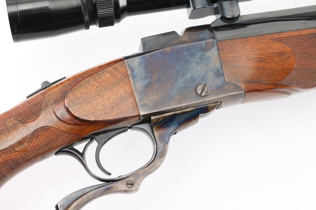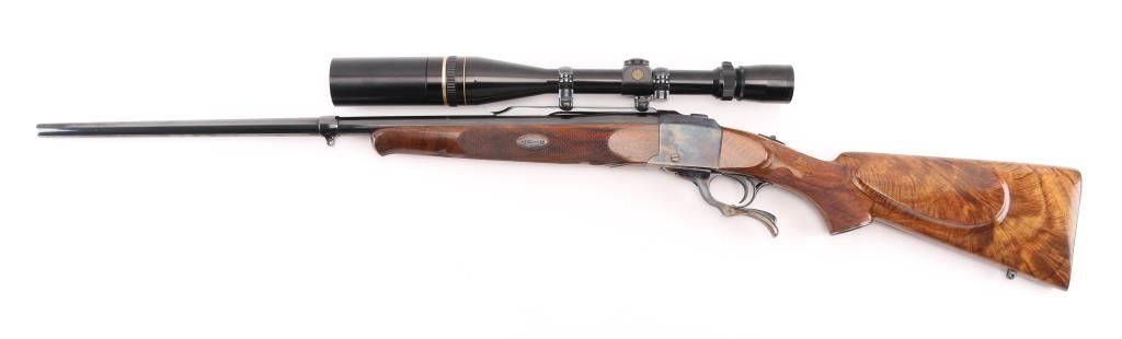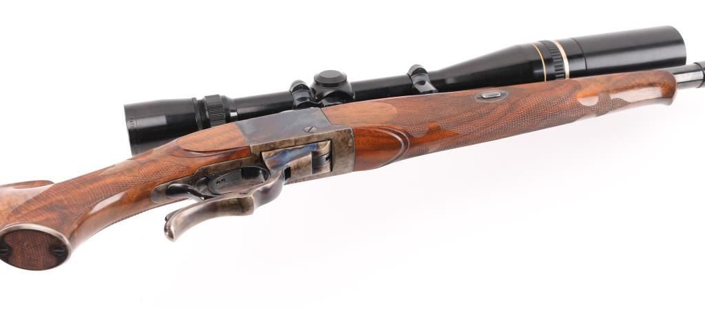Single shot falling block rifle manufactured circa 1983, customized by Lon Paul. Features high polish blued finish, case hardened receiver, loading lever, and butt plate, 25 3/4" barrel with quarter rib for scope mounting, beautiful high figured stock high point checkering on sides of forend & wrist with Fleur Di Lis drop points, skeletonized butt plate and grip cap. A bracket and pin add to the forearm, schnabel tipl Sliding tang safety, rear sling stud, banded front sling stud. Mounted with a Leupold Vari-X-III 6.5x20 scope, excellent condition. Bore is excellent/bright. Metal finish is excellent, falling block action is smooth, locks up tight. Comes with approx. 50 rounds of reloads. NRA Condition-Excellent. Modern Firearm