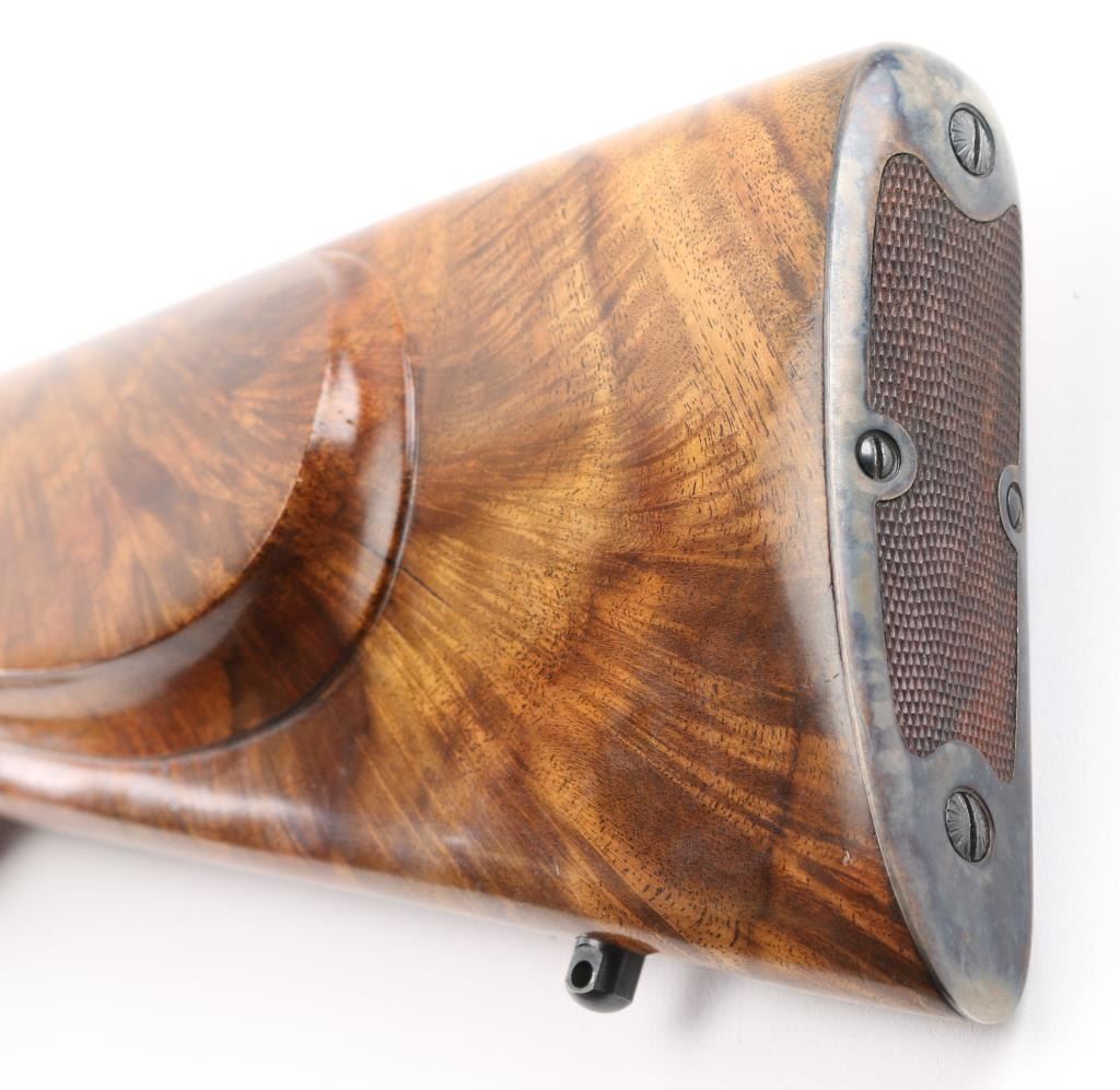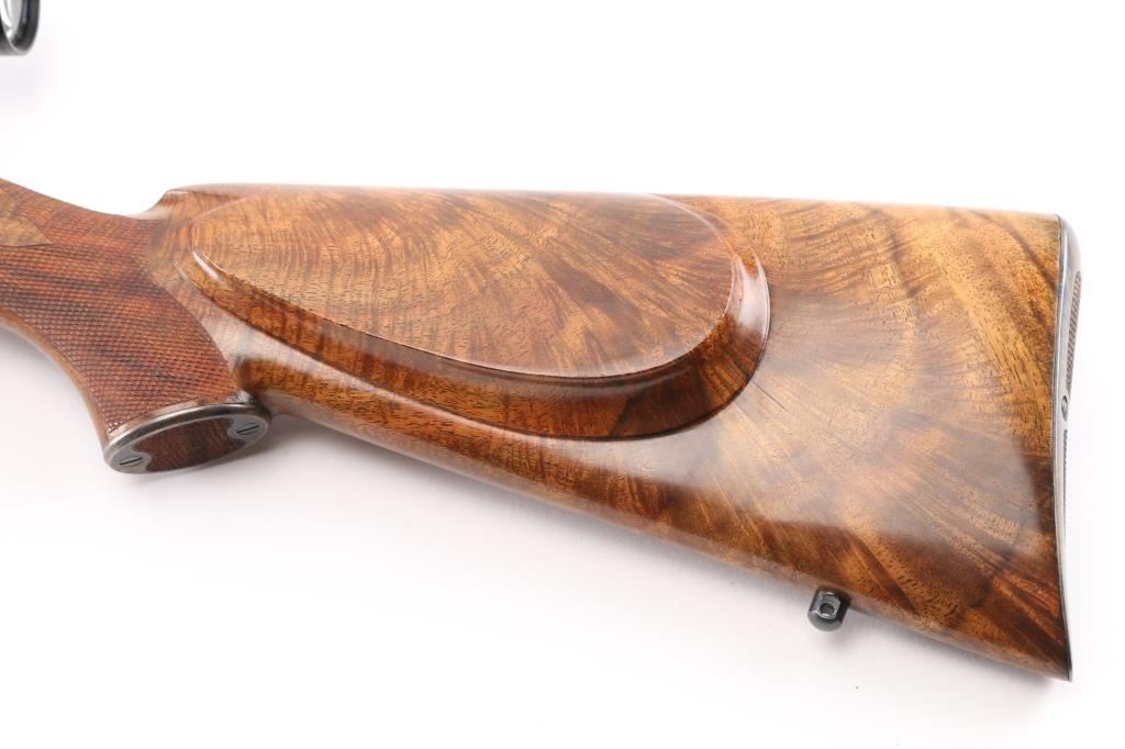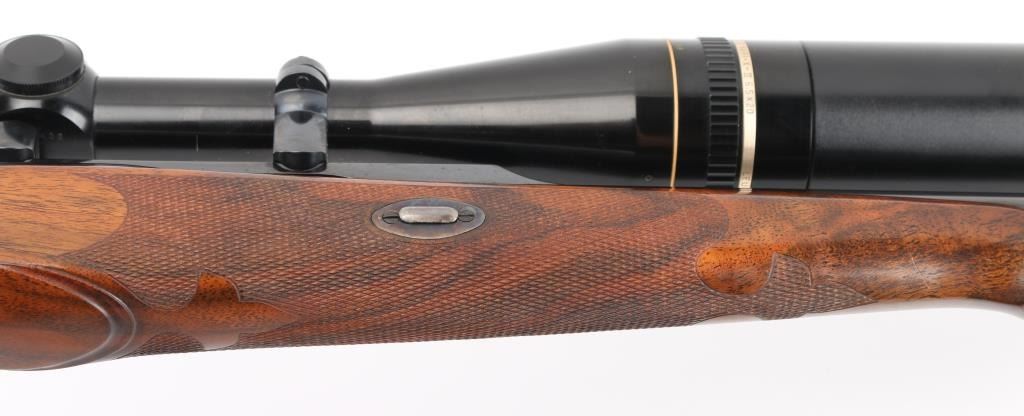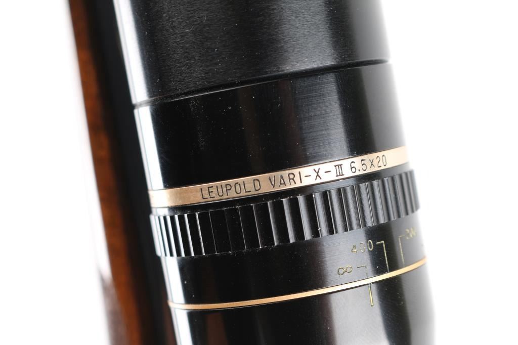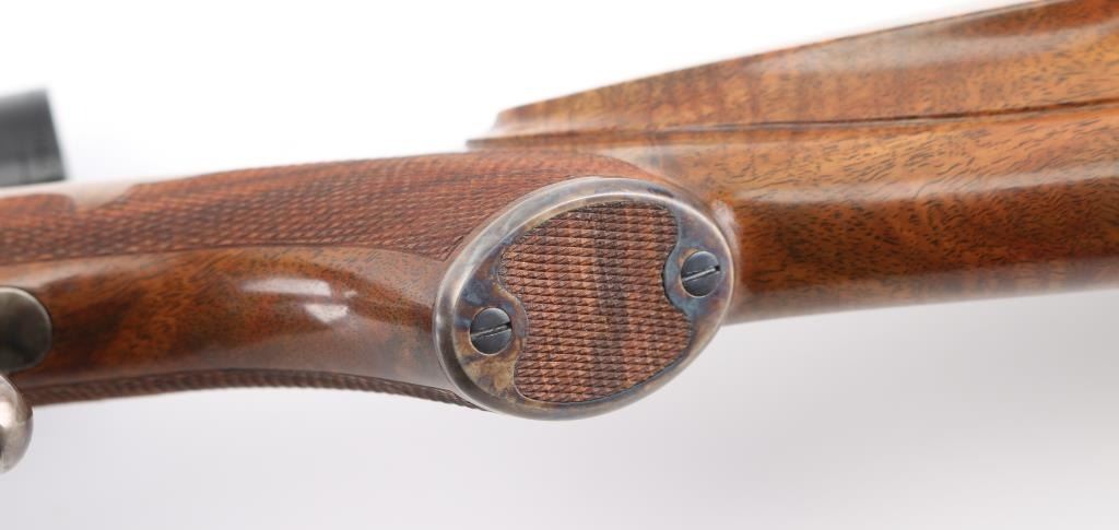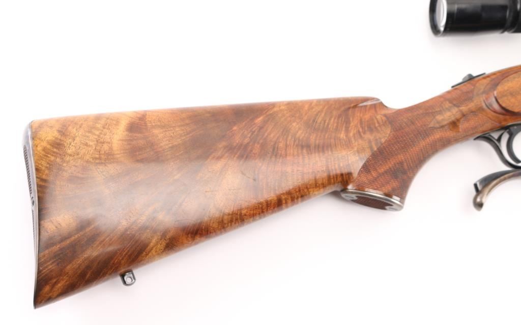 Single shot falling block rifle manufactured circa 1983, customized by Lon Paul. Features high polish blued finish, case hardened receiver, loading lever, and butt plate, 25 3/4" barrel with quarter rib for scope mounting, beautiful high figured stock high point checkering on sides of forend & wrist with Fleur Di Lis drop points, skeletonized butt plate and grip cap. A bracket and pin add to the forearm, schnabel tipl Sliding tang safety, rear sling stud, banded front sling stud. Mounted with a Leupold Vari-X-III 6.5x20 scope, excellent condition. Bore is excellent/bright. Metal finish is excellent, falling block action is smooth, locks up tight. Comes with approx. 50 rounds of reloads. NRA Condition-Excellent. Modern Firearm
