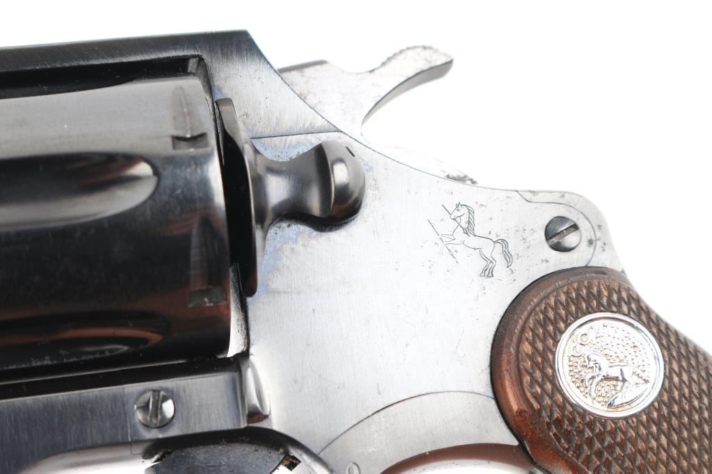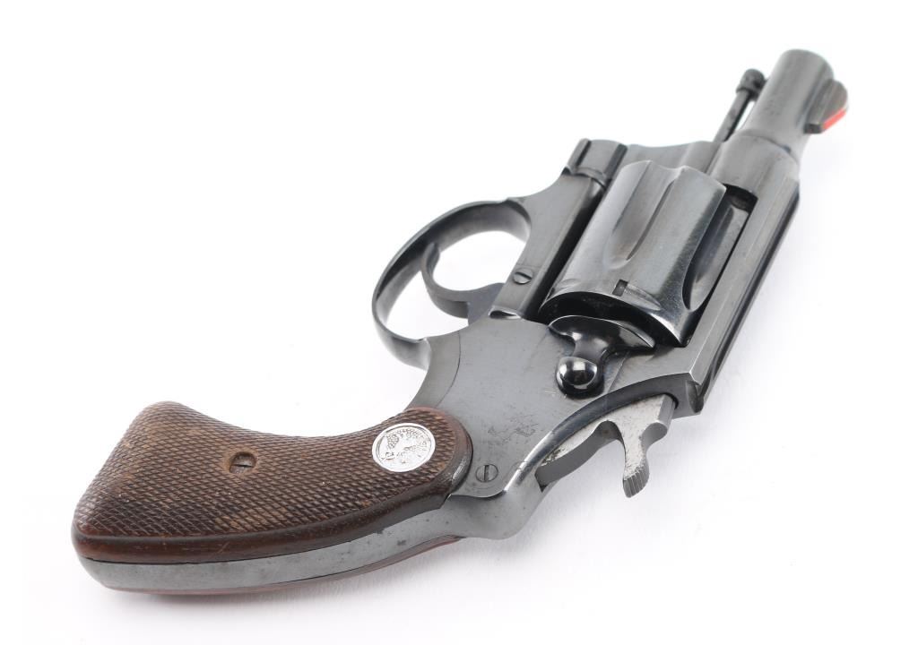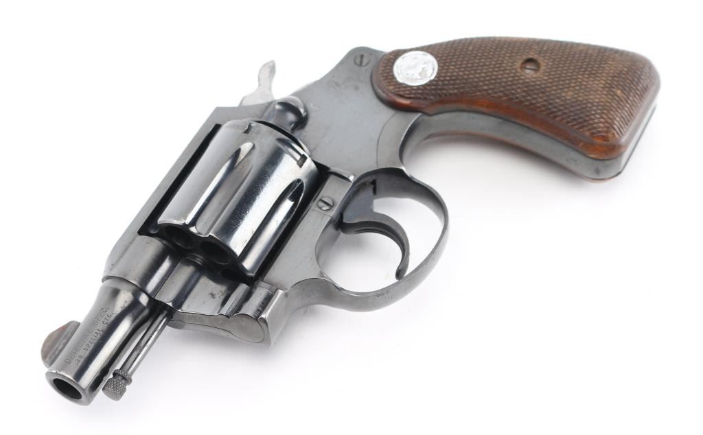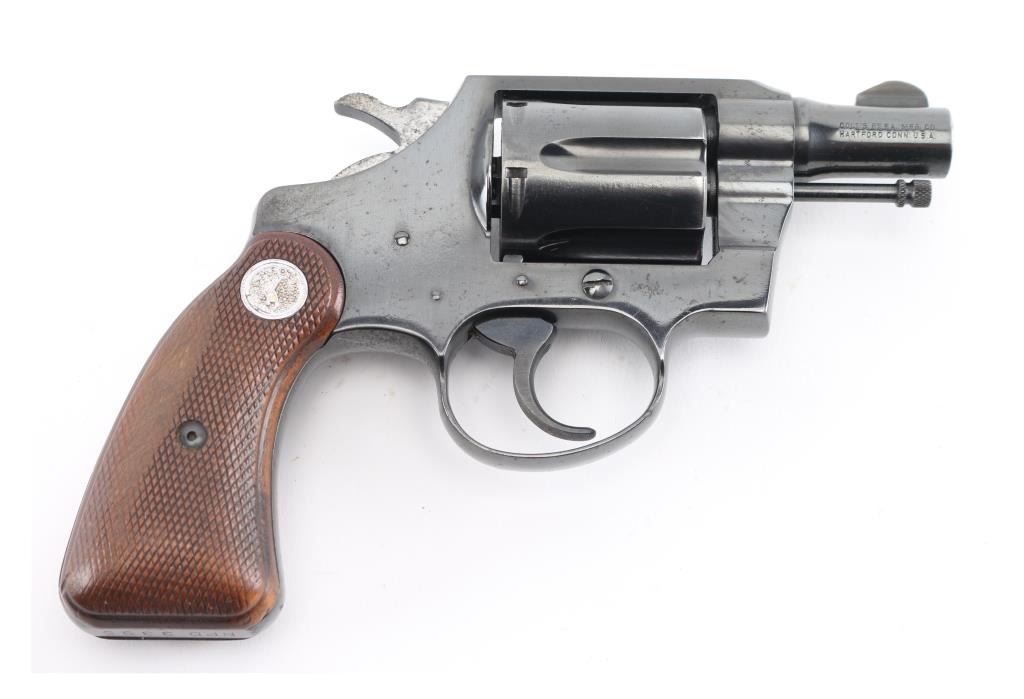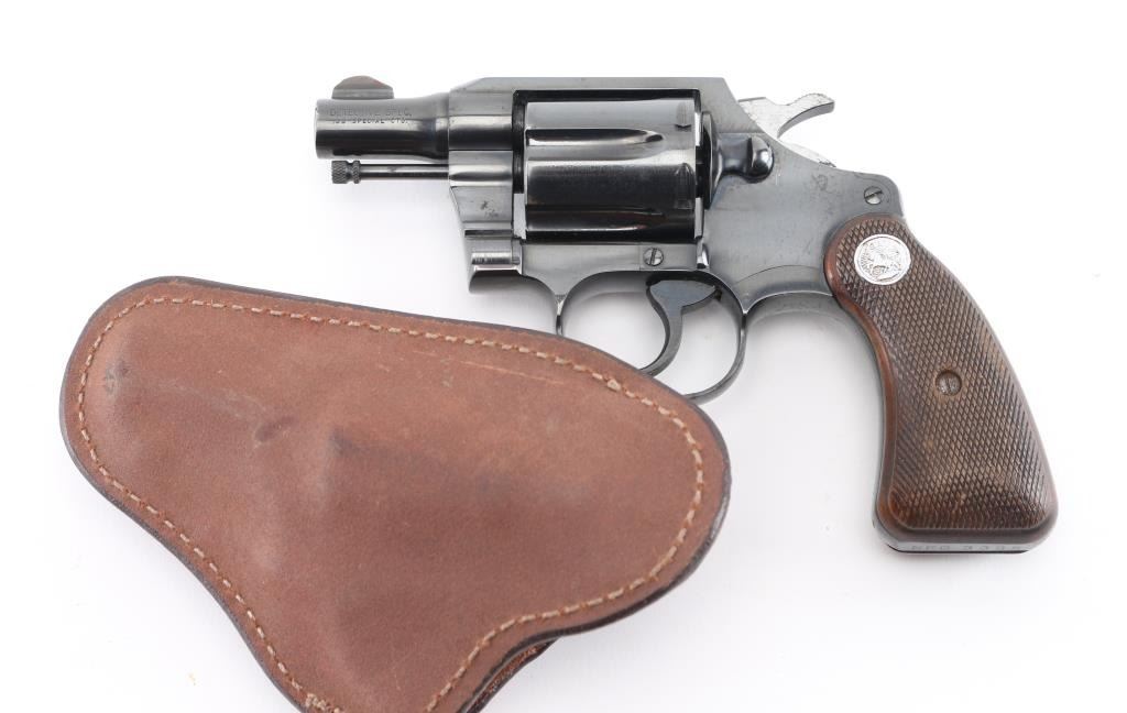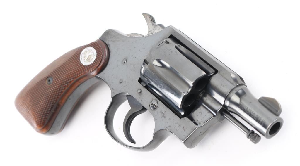 Vintage small frame double-action snub-nosed revolver chambered in .38 Special, manufactured circa 1961. Features all steel construction, a blued finish, 2" barrel, serrated blade front sight with red accent, square notched rear sight, serrated trigger, exposed hammer with polished flats & serrated spur, fluted six-shot cylinder, non-shrouded ejector rod, and two-piece checkered walnut grips with inlayed silver Colt medallions. "NPD 3395" stamped on bottom of grip. Bore is excellent condition. Revolver retains approximately 90% of its original blued finish showing minor edge wear and minor pitting on right side of frame. Action is smooth with solid lock up and the wood grips are good with some worn checkering on the back right grip panel. Comes with molded leather holster. Condition is NRA Very Good. *** C&R Firearm ***