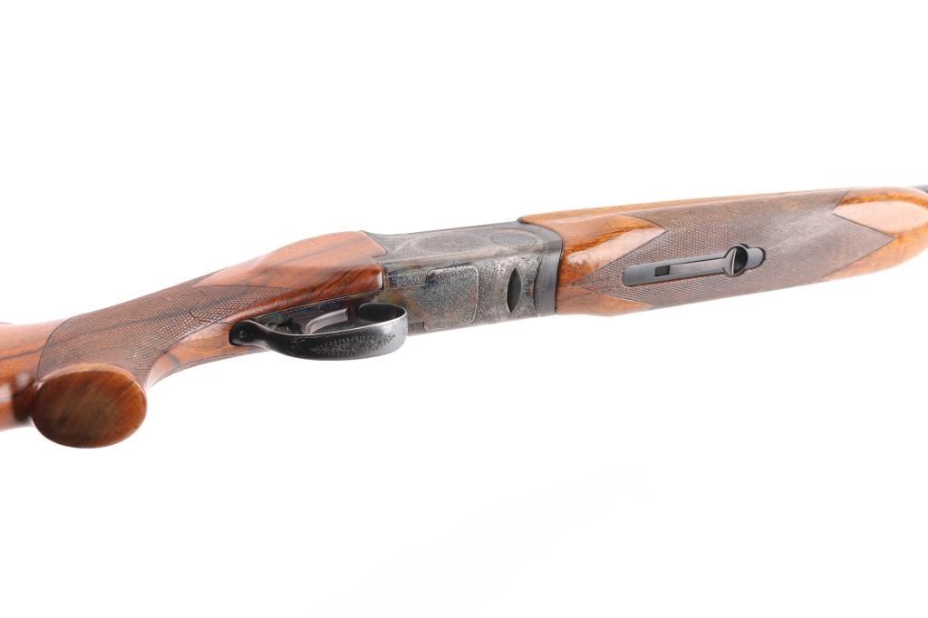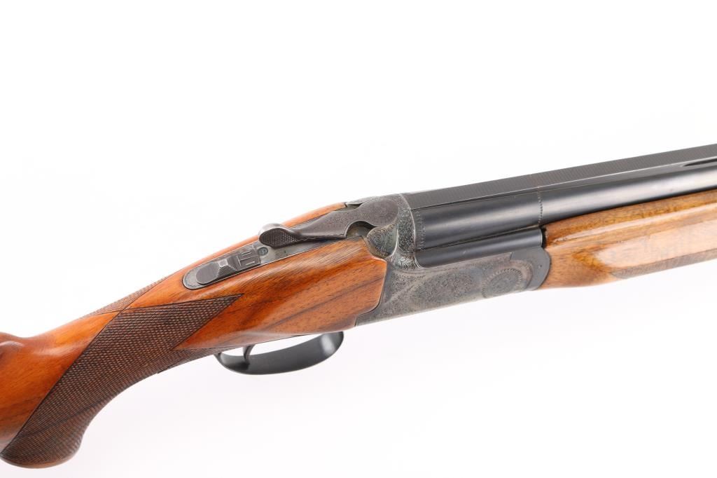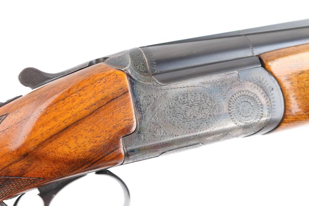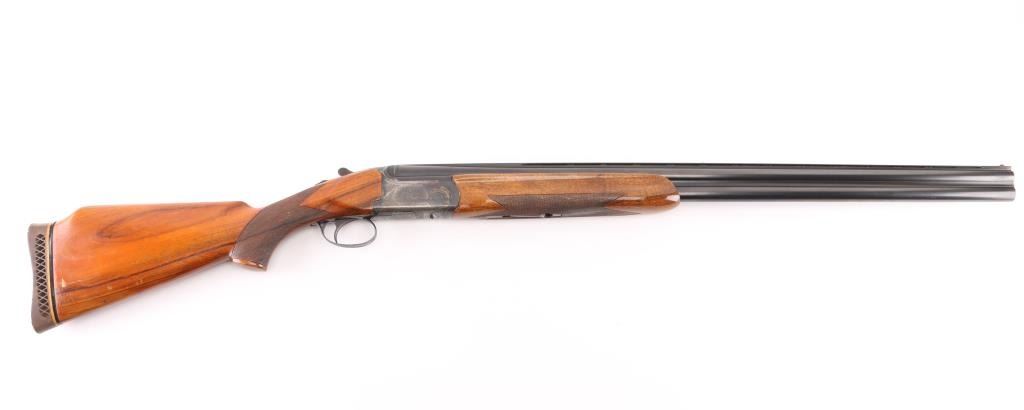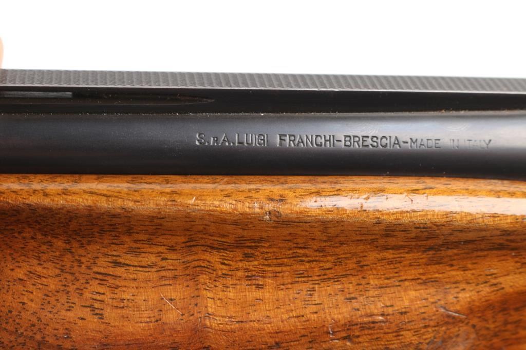 Franchi 12 gauge, top lever, over under game gun. Date coded 1966. 30" blued high chrome barrels with white sighting bead, & small mid bead on flat vent rib. Left barrel marked "S.P.A Luigi Franchi-Brescia-Made in Italy" Underside of barrels marked "Accaio Cogne KMO Supercromatio" Matching serial numbers, no import marks, single triggers, double extractors, safety/barrel selector on tang. The receiver is case finished and fully engraved in a rose and scroll pattern similar to Purdey's. The chokes are fixed choked at Full & CYL Checkered wood forearm & pistol grip shoulder stock with vent rubber recoil pad. Bores are excellent/bright. action locks up tight, blue is about 98% with slight muzzle wear, case colors are very good with some minor handling wear. Forend shows repaired crack full length across bottom thru latch area. Small losses to wood stock, with small cracks in right side of wrist. NRA Condition-Excellent. C&R Firearm.