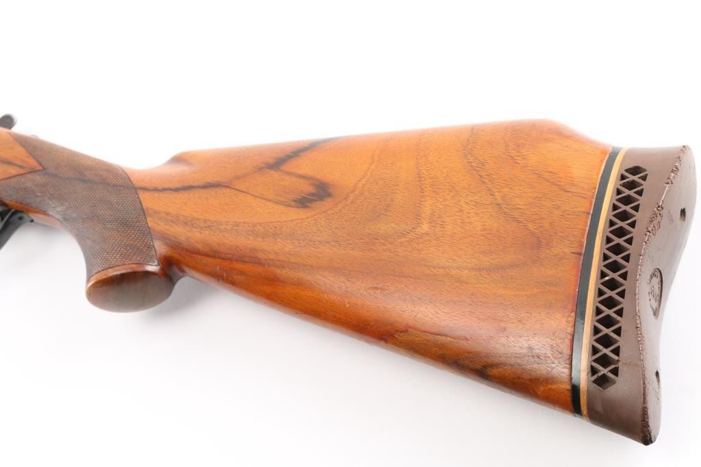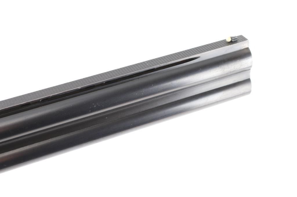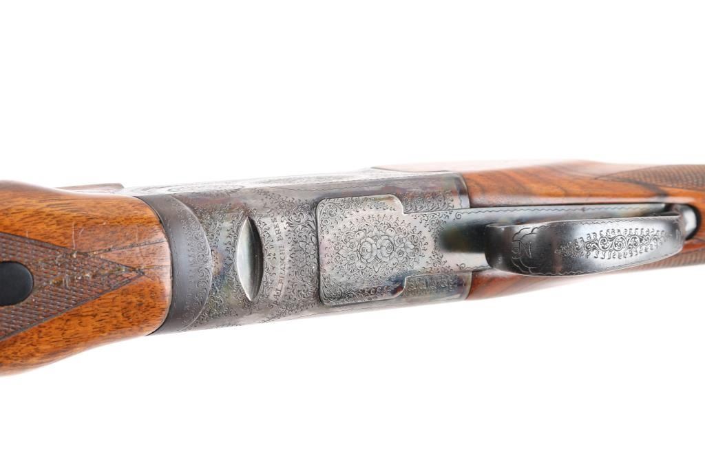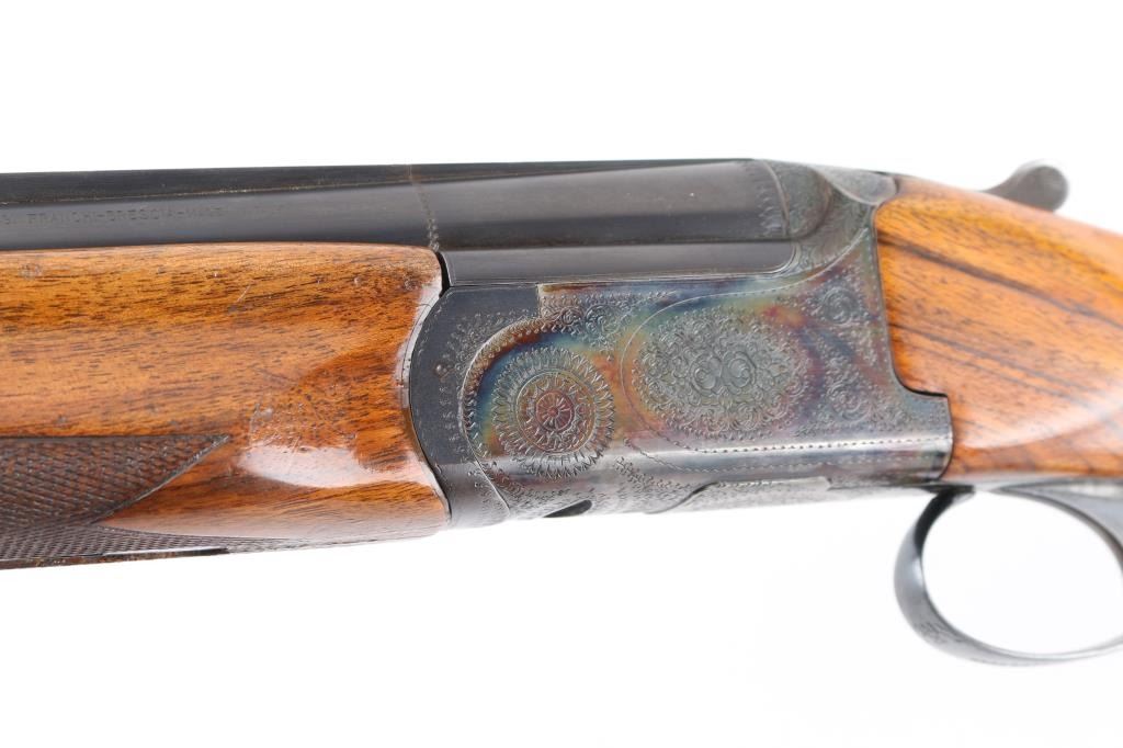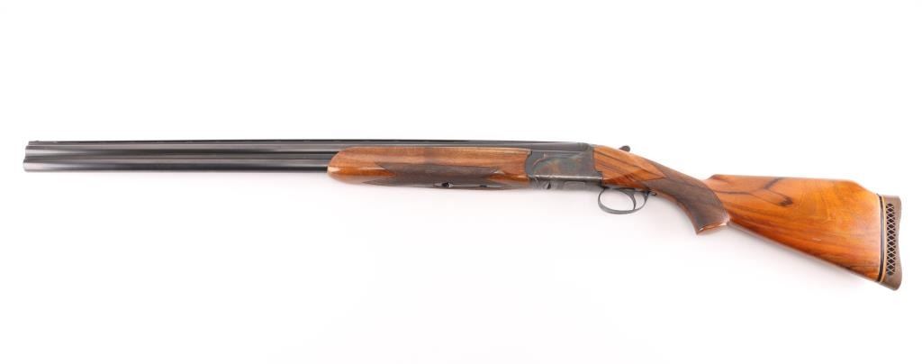 Franchi 12 gauge, top lever, over under game gun. Date coded 1966. 30" blued high chrome barrels with white sighting bead, & small mid bead on flat vent rib. Left barrel marked "S.P.A Luigi Franchi-Brescia-Made in Italy" Underside of barrels marked "Accaio Cogne KMO Supercromatio" Matching serial numbers, no import marks, single triggers, double extractors, safety/barrel selector on tang. The receiver is case finished and fully engraved in a rose and scroll pattern similar to Purdey's. The chokes are fixed choked at Full & CYL Checkered wood forearm & pistol grip shoulder stock with vent rubber recoil pad. Bores are excellent/bright. action locks up tight, blue is about 98% with slight muzzle wear, case colors are very good with some minor handling wear. Forend shows repaired crack full length across bottom thru latch area. Small losses to wood stock, with small cracks in right side of wrist. NRA Condition-Excellent. C&R Firearm.