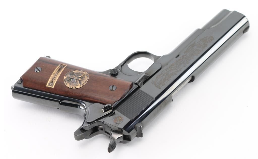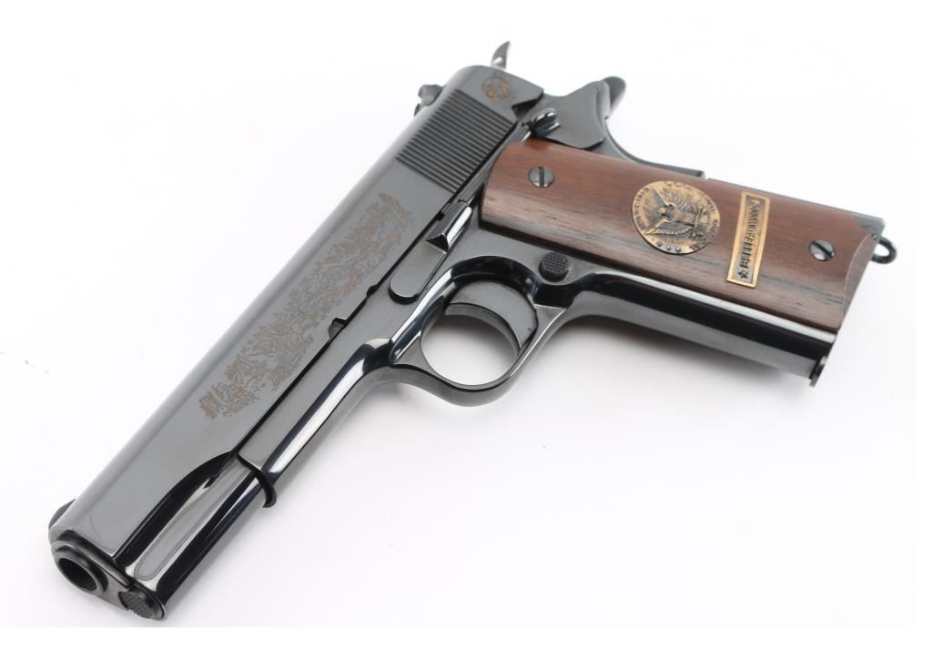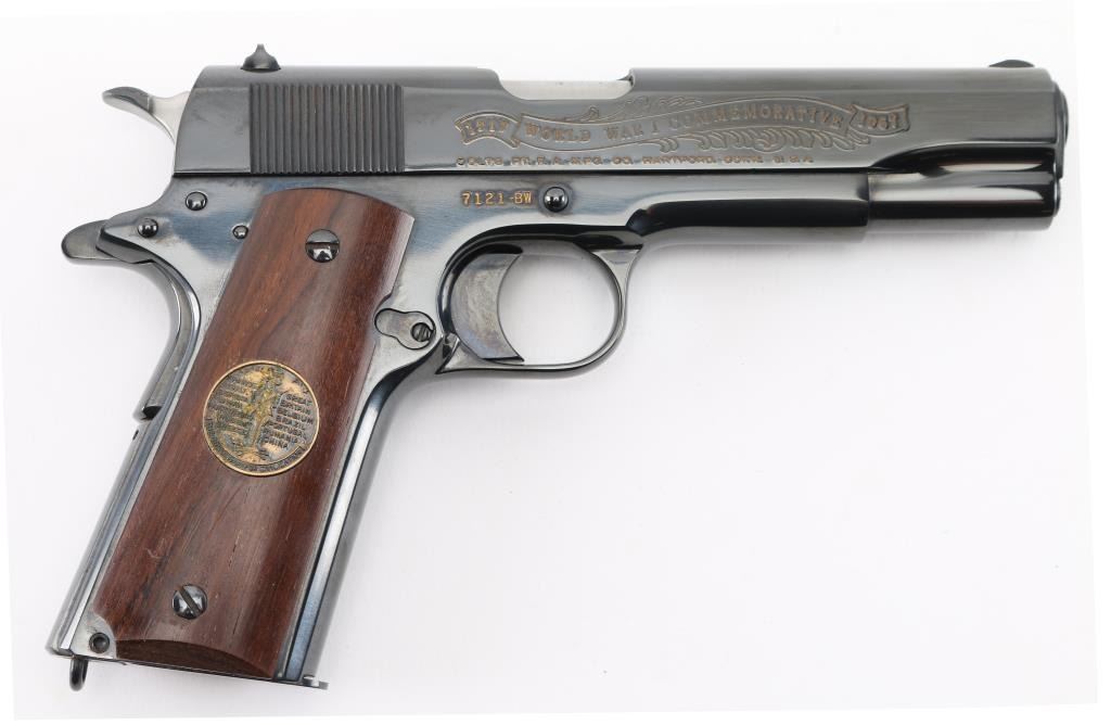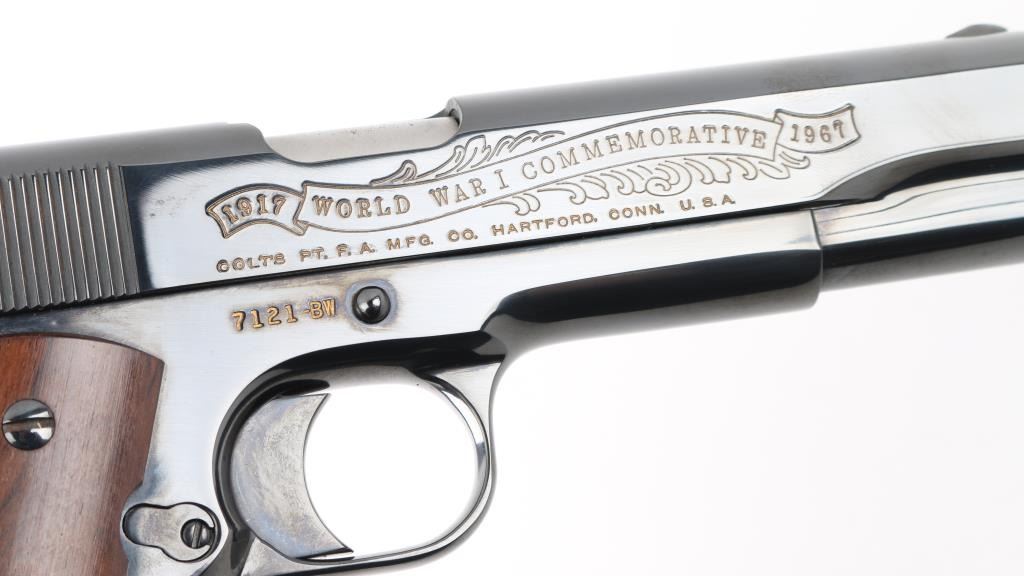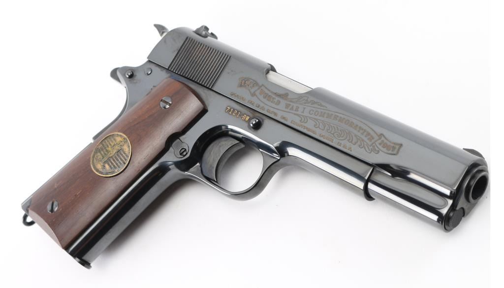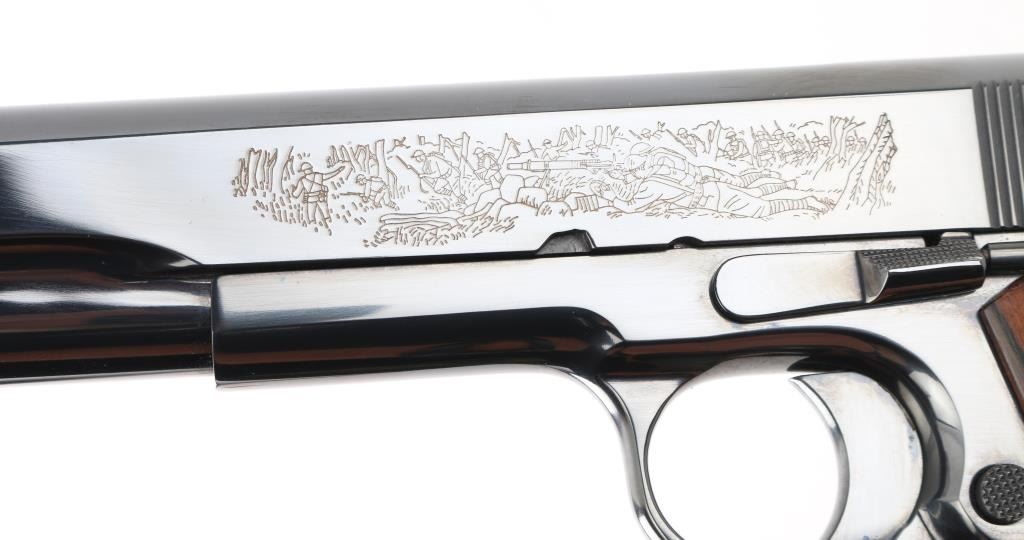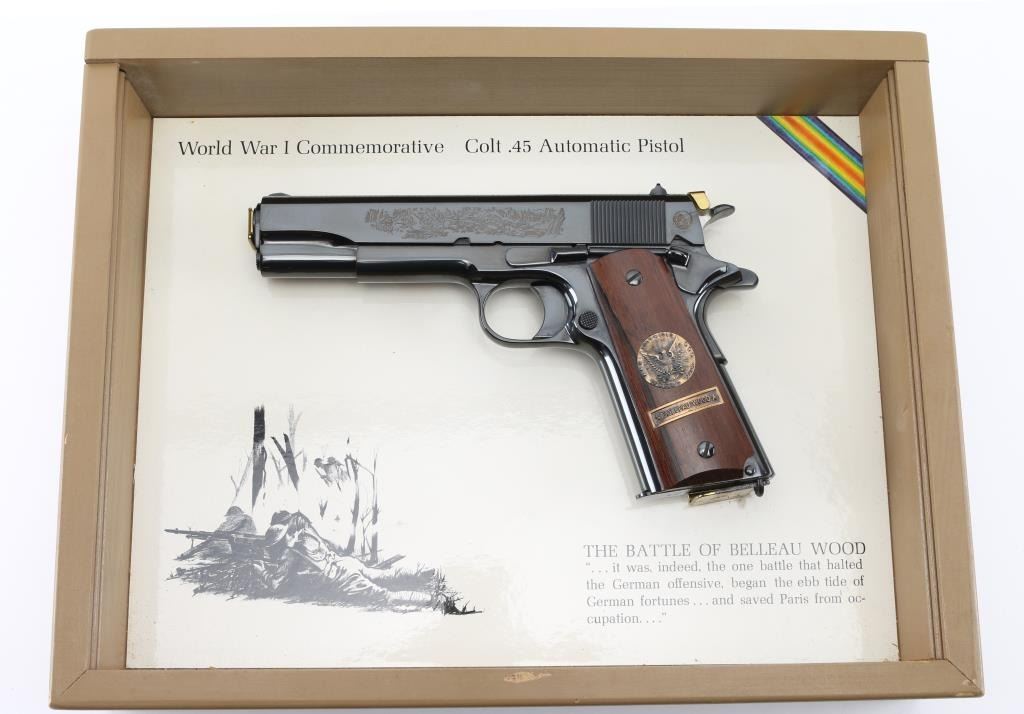 SN: 7121-BW Pistol. Semi-Automatic. 7+1 capacity. In 1968 Colt wanted to commemorate WW1 by producing a Model 1911 in remembrance of the 4 most noted battles of WW1. This pistol is for the battle of Belleau Wood. Production for each model was 7400. All were Pre-series model 70's with flat mainspring housings, long triggers, checkered slide stop and safety. Checkered wide hammer spur, and type 2 beveled proper rear sight. High polish blue finish with smooth walnut Grips. The left slide has a roll engraved battle scene, and the right has the WW! banner with "1917-1967, the 50th anniversary of entering the war. All gold toned. Left grip has Eagle medallion with "1917 1918, World War" with "Belleau Wood" under it. Right grip was Doughboy medallion listed the Countries that fought in WW1. Lanyard ring in place. Bore is excellent/bright. Slide action is smooth/tight. Blued finish is close to perfect. Grips are very good with the right panel showing minor finish loss due the tape used in the shadow box.. Comes with original Colt marked magazine, and factory display case with battle scenes, and history of the battle. Note* There are the three other battle .45's in this auction with the same serial number with the different initials of the battle. Would make a great set. NRA Condition-Excellent. C&R Firearm