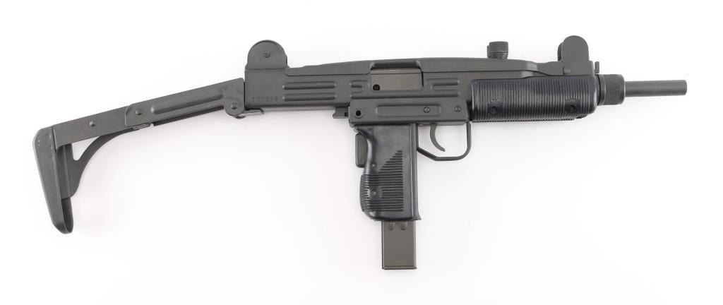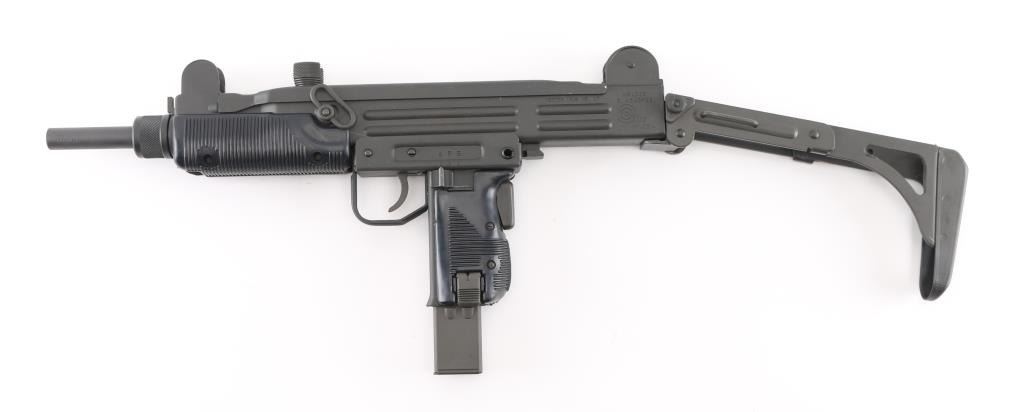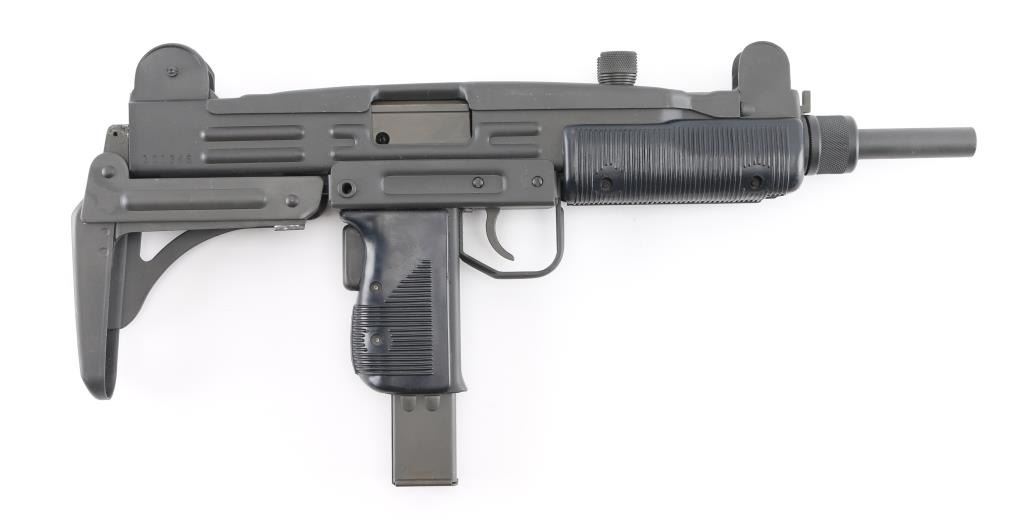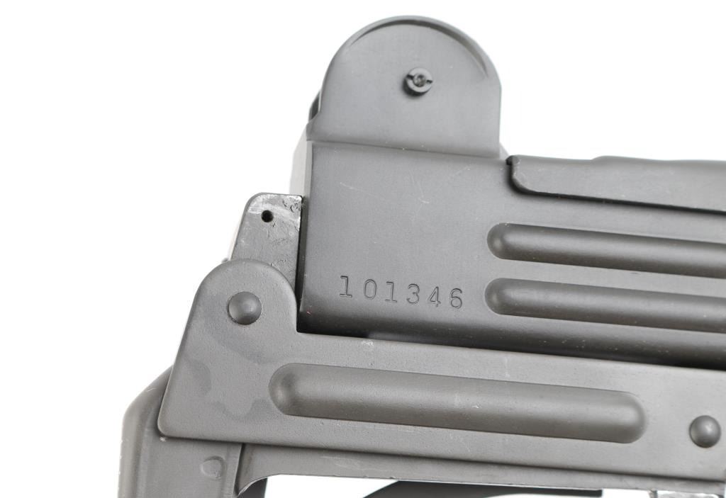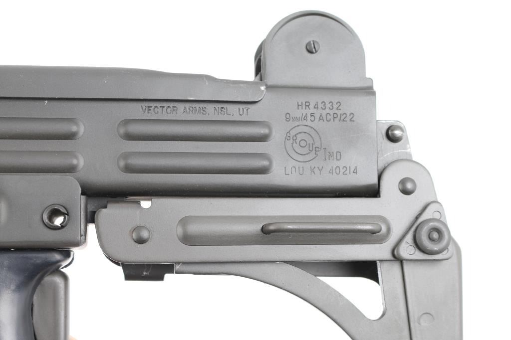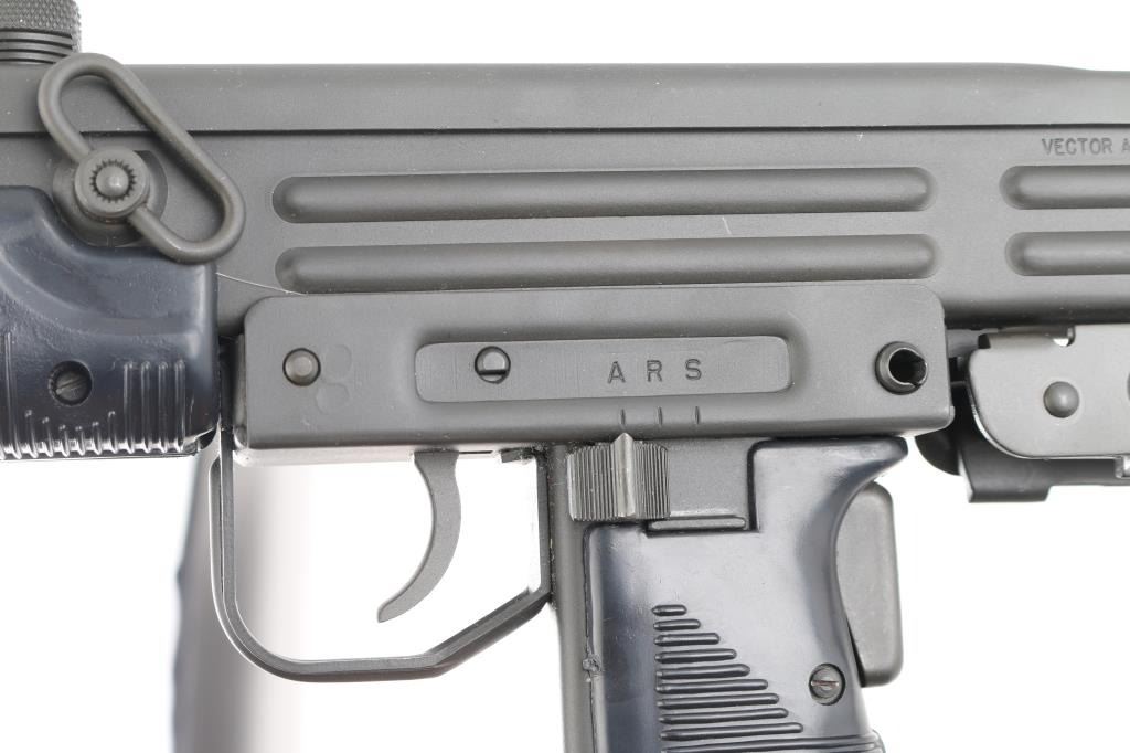 Fully transferable select fire 9x19mm machinegun. US made copy of Uzi submachinegun, using Vector Arms receiver. This and two others are consecutive numbered, see other lots in this auction. Fires from open bolt in full and semi. Features 10.2" barrel, dark gray parkerized finish on all metal, black polymer grip and forend panels, bayonet lug, grip safety, forward sling swivel, rear sling bar, elevation adjustable protected post front sight, windage adjustable protected peep rear sight (two selectable ranges), manual safety/selector on left side at top of grip, folding metal stock. Machine gun is in excellent condition overall, with bright bore and few signs of handling or firing. Few minor edge losses, little loss of finish where stock rubs when opening, visible thinning where top cover slides on receiver. Includes one excellent condition steel 25 rd magazine. Condition is NRA Excellent ***NFA Firearm*** ***Fully Transferable***