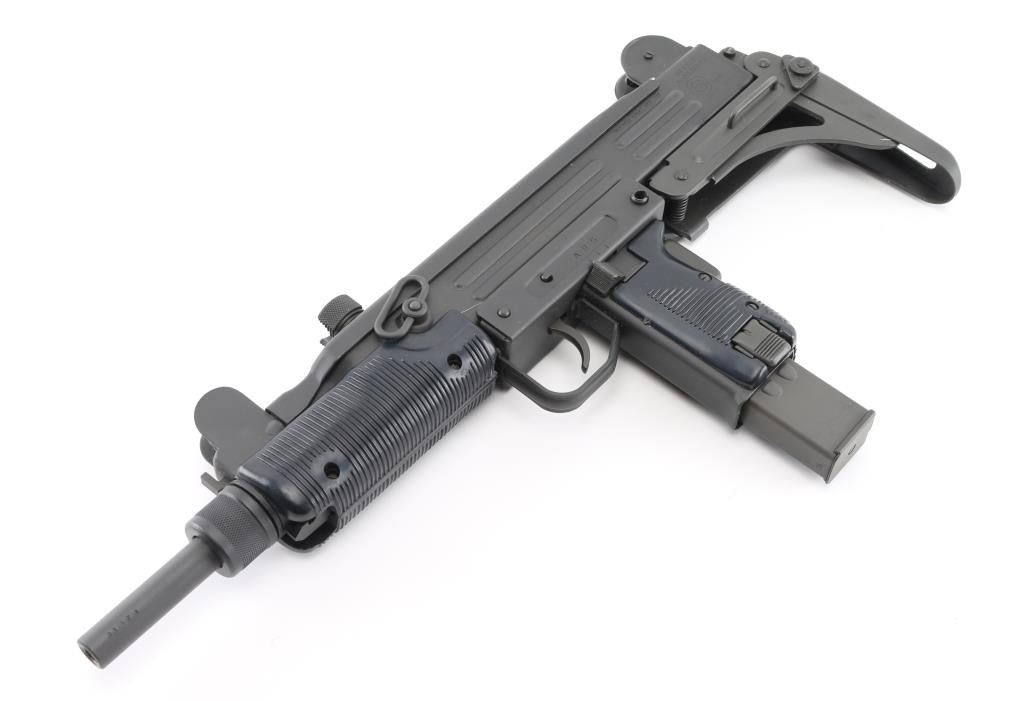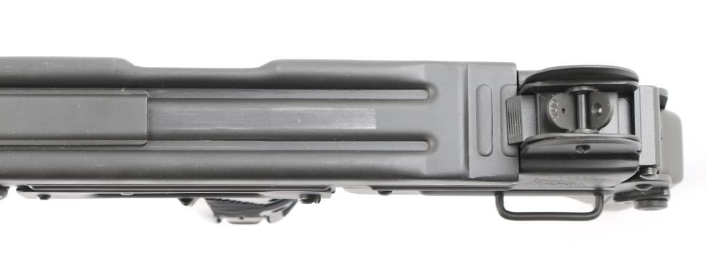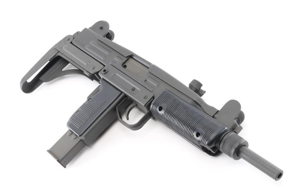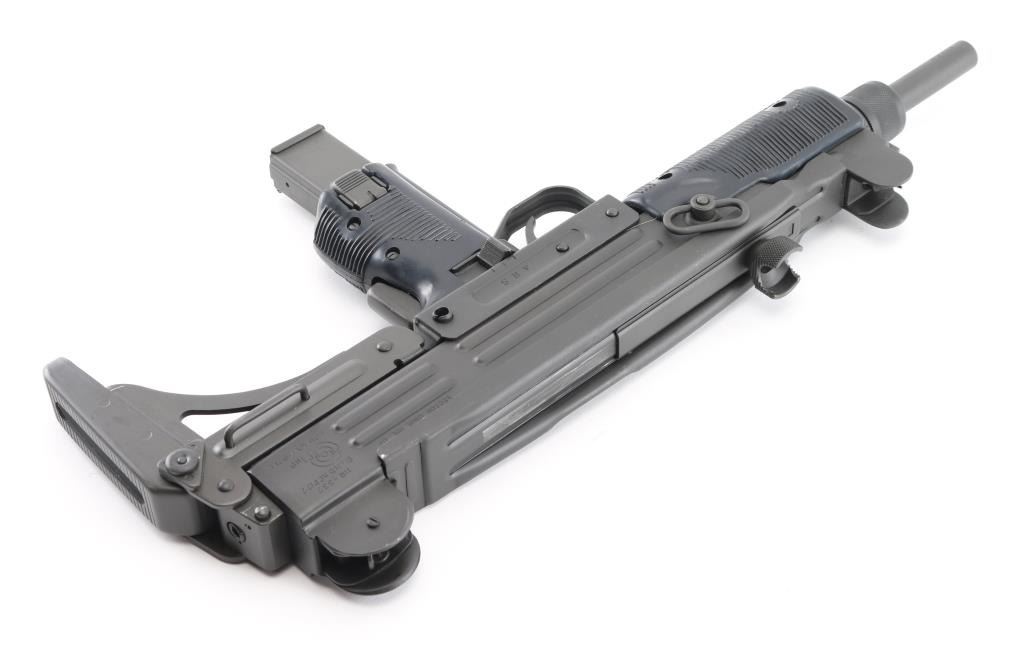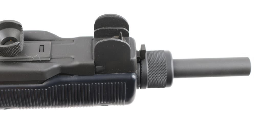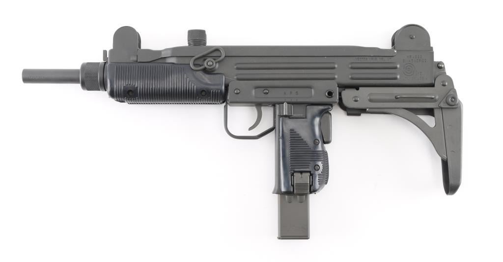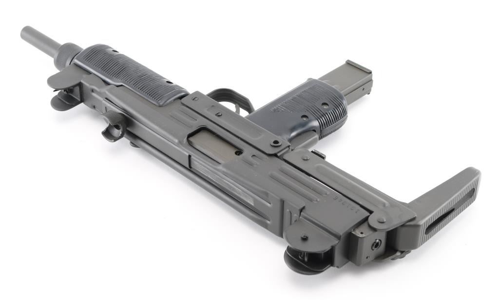 Fully transferable select fire 9x19mm machinegun. US made copy of Uzi submachinegun, using Vector Arms receiver. This and two others are consecutive numbered, see other lots in this auction. Fires from open bolt in full and semi. Features 10.2" barrel, dark gray parkerized finish on all metal, black polymer grip and forend panels, bayonet lug, grip safety, forward sling swivel, rear sling bar, elevation adjustable protected post front sight, windage adjustable protected peep rear sight (two selectable ranges), manual safety/selector on left side at top of grip, folding metal stock. Machine gun is in excellent condition overall, with bright bore and few signs of handling or firing. Few minor edge losses, little loss of finish where stock rubs when opening, visible thinning where top cover slides on receiver. Includes one excellent condition steel 25 rd magazine. Condition is NRA Excellent ***NFA Firearm*** ***Fully Transferable***