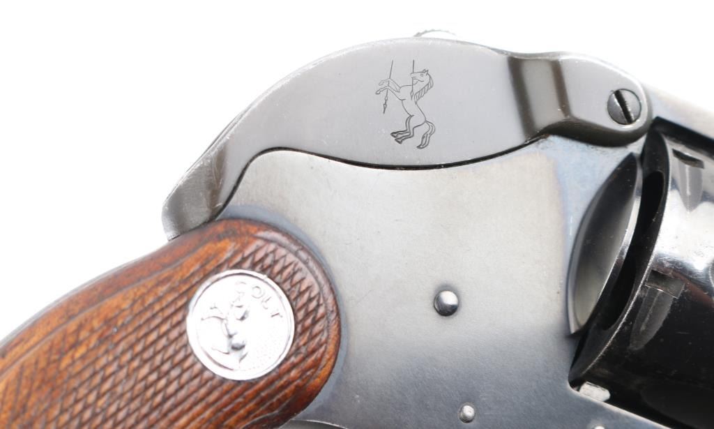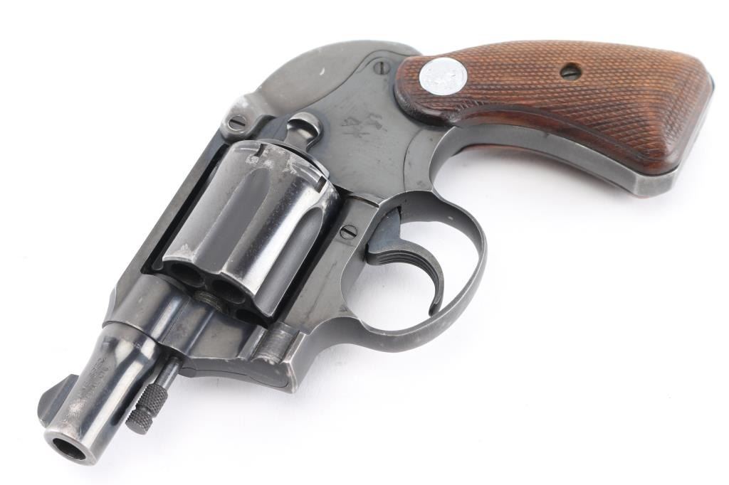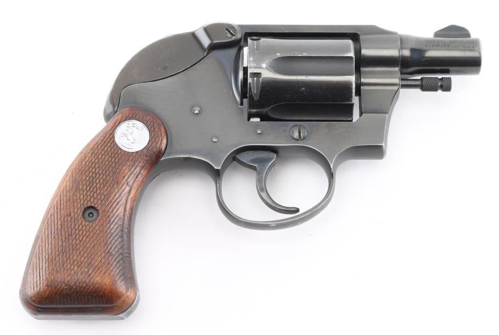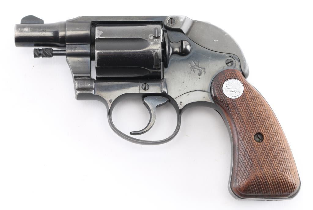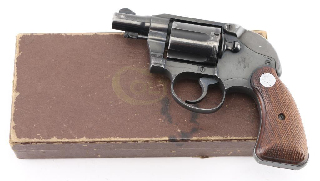 2nd Issue snub nose double action revolver chambered in .38 Special, manufactured circa 1951. Has the rare Colt factory hammer shroud marked with the 'Rampant Colt'. Features a blued finish, 2" barrel, serrated ramp front sight, square notch rear sight, long fluted six-shot cylinder, non-shrouded ejector rod, serrated trigger, serrated hammer spur, steel frame with two-piece checkered walnut grips with silver Colt medallions. Revolver retains approximately 85% of its original blued finish showing holster wear, handling marks and some finish loss on the cylinder. Action is smooth with solid lock up, the bore appears excellent and the wood grips are very good. Comes with the original brown cardboard Colt factory box with label, manual. There is some repaired damage to the lid. Condition is NRA Very Good. C&R Firearm.