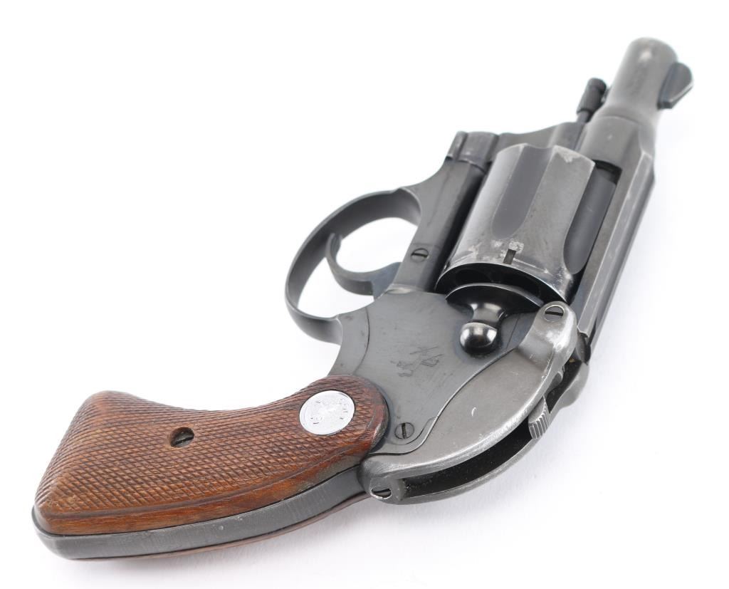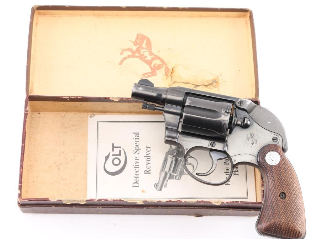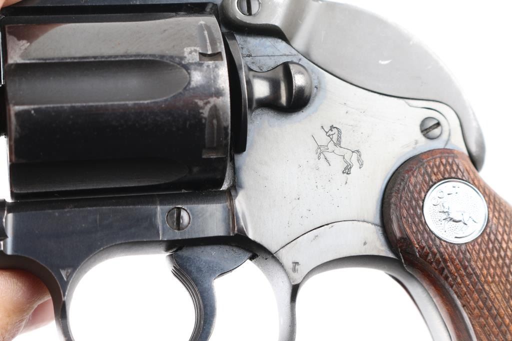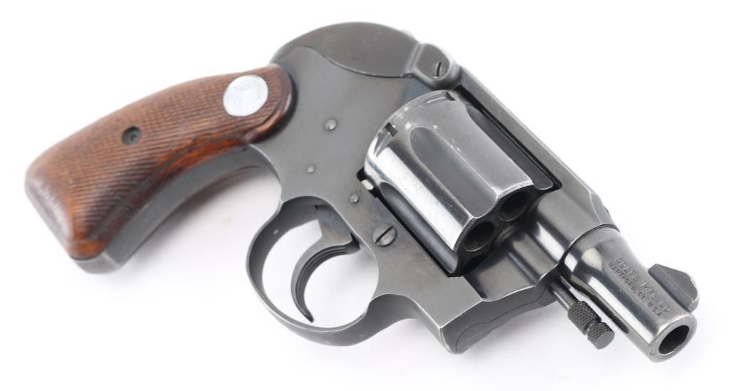 2nd Issue snub nose double action revolver chambered in .38 Special, manufactured circa 1951. Has the rare Colt factory hammer shroud marked with the 'Rampant Colt'. Features a blued finish, 2" barrel, serrated ramp front sight, square notch rear sight, long fluted six-shot cylinder, non-shrouded ejector rod, serrated trigger, serrated hammer spur, steel frame with two-piece checkered walnut grips with silver Colt medallions. Revolver retains approximately 85% of its original blued finish showing holster wear, handling marks and some finish loss on the cylinder. Action is smooth with solid lock up, the bore appears excellent and the wood grips are very good. Comes with the original brown cardboard Colt factory box with label, manual. There is some repaired damage to the lid. Condition is NRA Very Good. C&R Firearm.