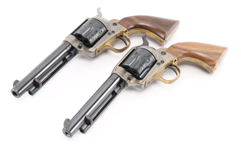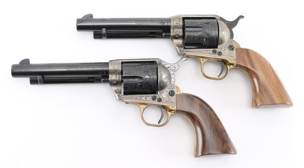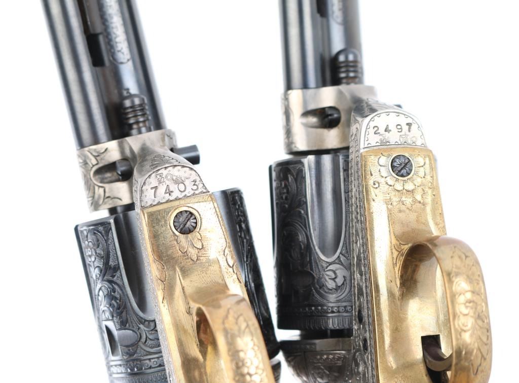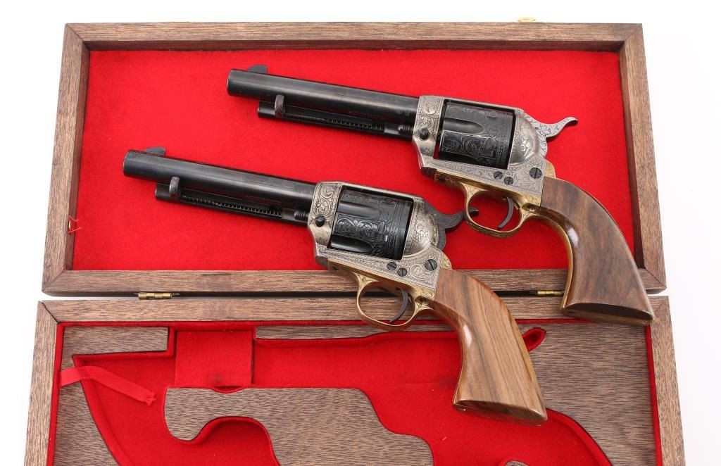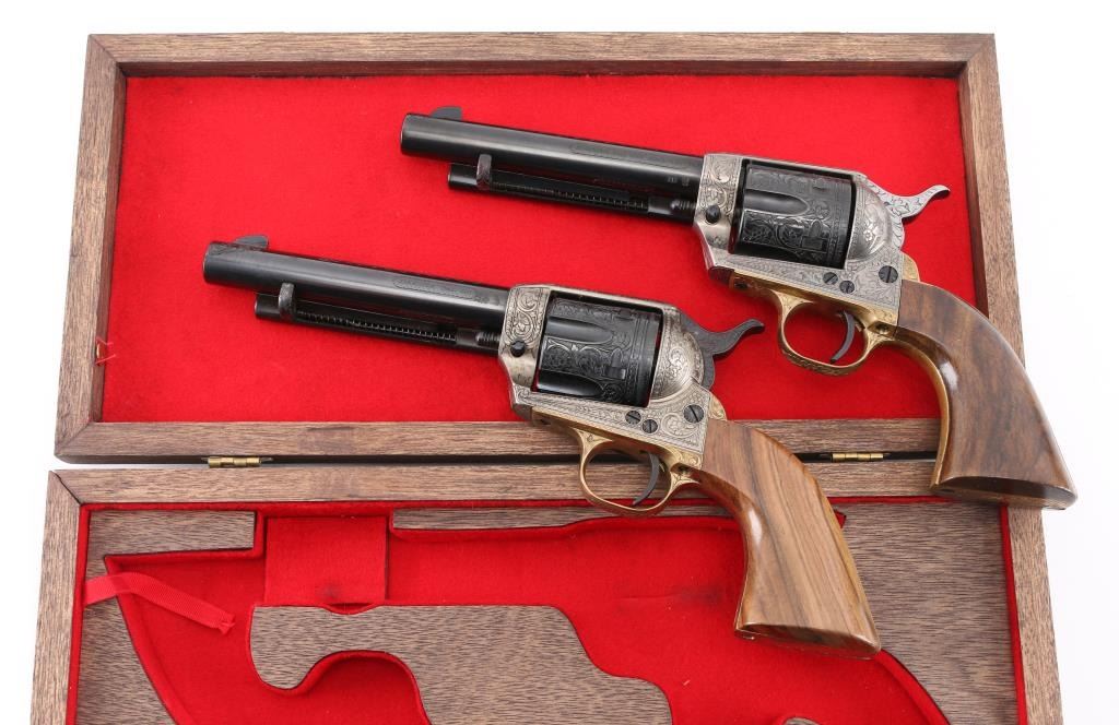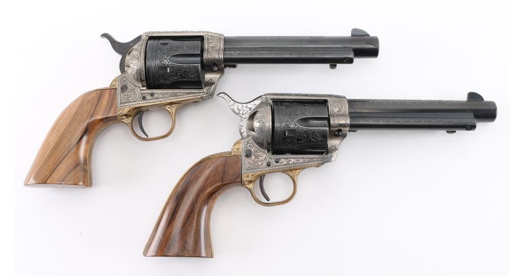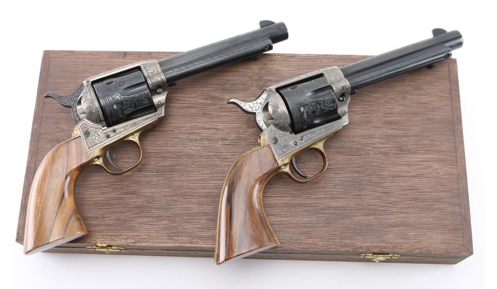 SNs: 2497 & 7403 Engraved, Italian single action revolvers imported by Inter Continental Arms Inc, manufactured circa 1965. Styled after the Colt Single Action Army, these revolvers feature blued finish, silver colored receiver and loading gate, brass back strap, wood grips, fixed sights, 5.5" barrels. Engraving is floral scroll style, and fills the majority of visible space on metal parts, with a blank oval on back strap, and lesser coverage at barrel sides. The 22LR revolver is a full size complement to the 357. Wood grips have nice figure and contrasting grain colors. The included walnut presentation case has brass fittings, red felt lining, and is similar to French fit with revolver shapes inlet into a close fitting walnut insert. Overall condition of revolvers is excellent with no obvious sign of handling or use, some accumulated dust. Condition is NRA Perfect - Like New ***C&R Firearms*** [From the Jim Wilkinson Rifle Ranch Collection]