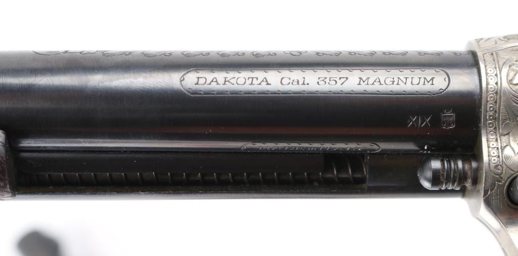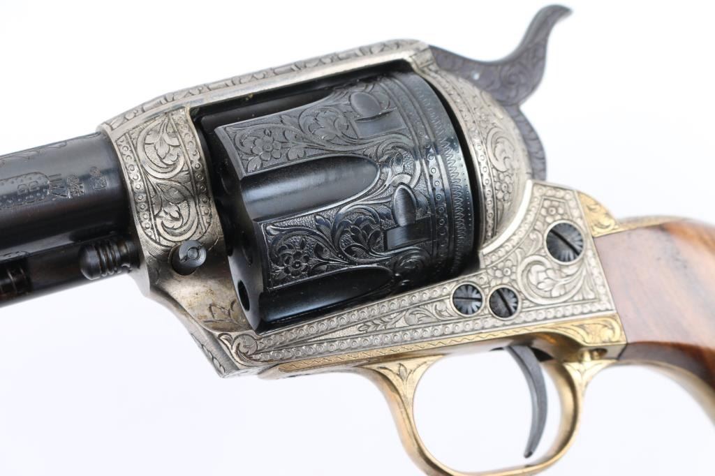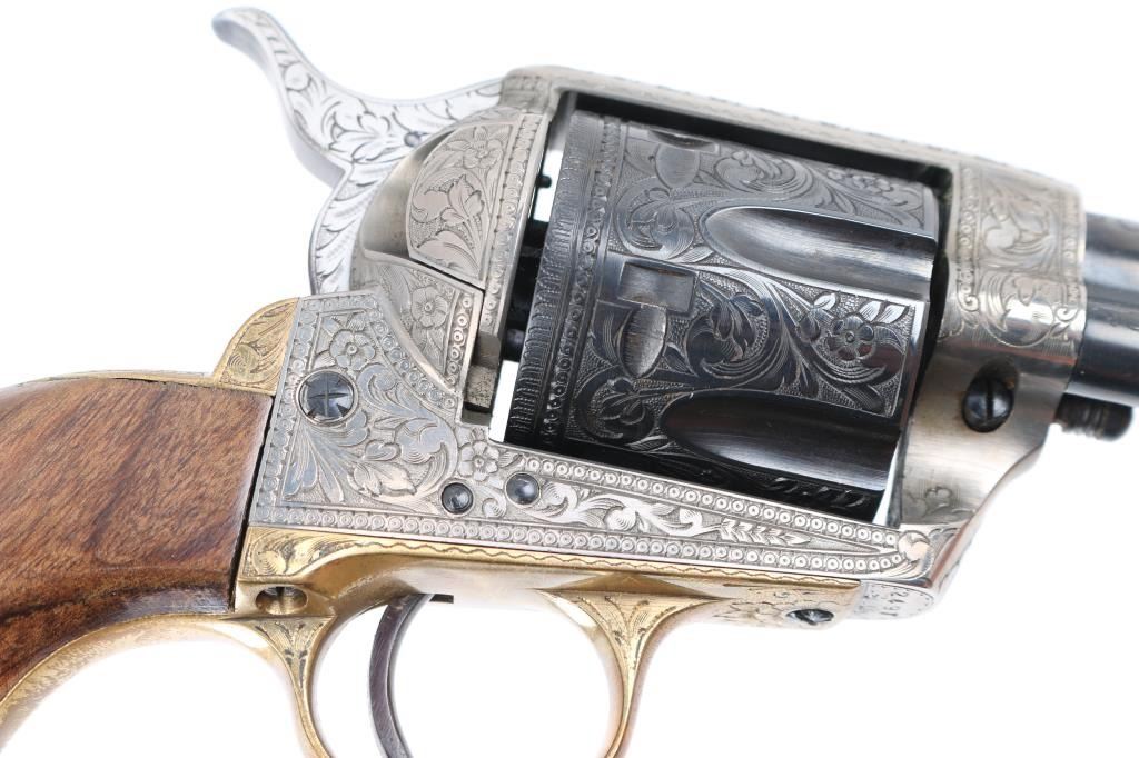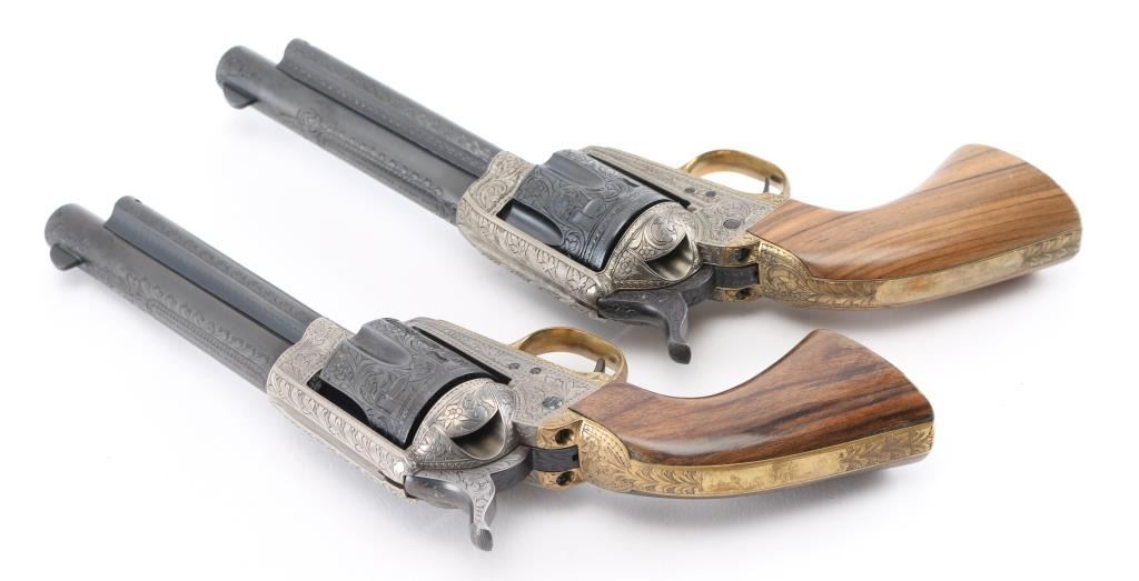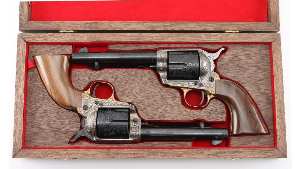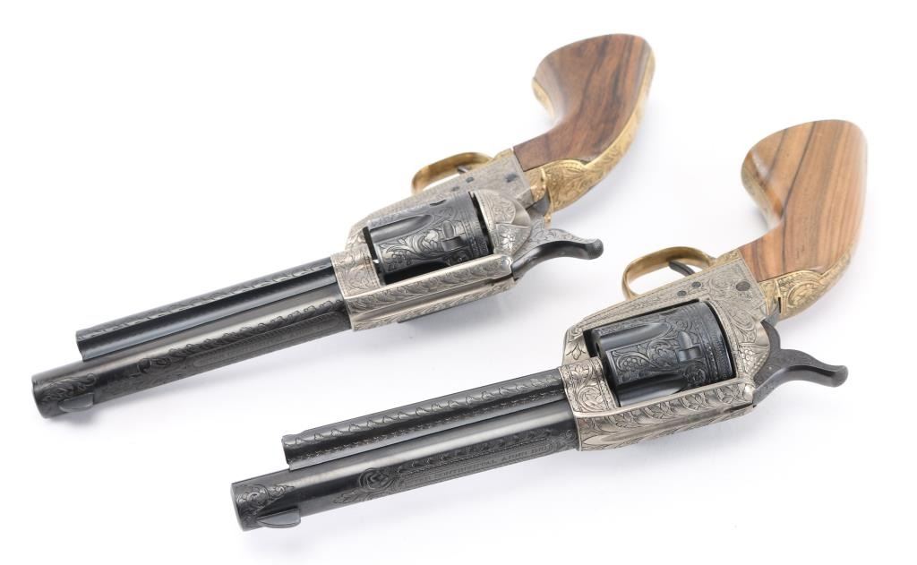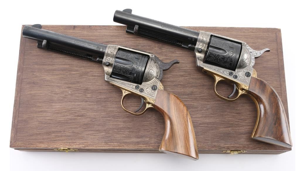 SNs: 2497 & 7403 Engraved, Italian single action revolvers imported by Inter Continental Arms Inc, manufactured circa 1965. Styled after the Colt Single Action Army, these revolvers feature blued finish, silver colored receiver and loading gate, brass back strap, wood grips, fixed sights, 5.5" barrels. Engraving is floral scroll style, and fills the majority of visible space on metal parts, with a blank oval on back strap, and lesser coverage at barrel sides. The 22LR revolver is a full size complement to the 357. Wood grips have nice figure and contrasting grain colors. The included walnut presentation case has brass fittings, red felt lining, and is similar to French fit with revolver shapes inlet into a close fitting walnut insert. Overall condition of revolvers is excellent with no obvious sign of handling or use, some accumulated dust. Condition is NRA Perfect - Like New ***C&R Firearms*** [From the Jim Wilkinson Rifle Ranch Collection]
