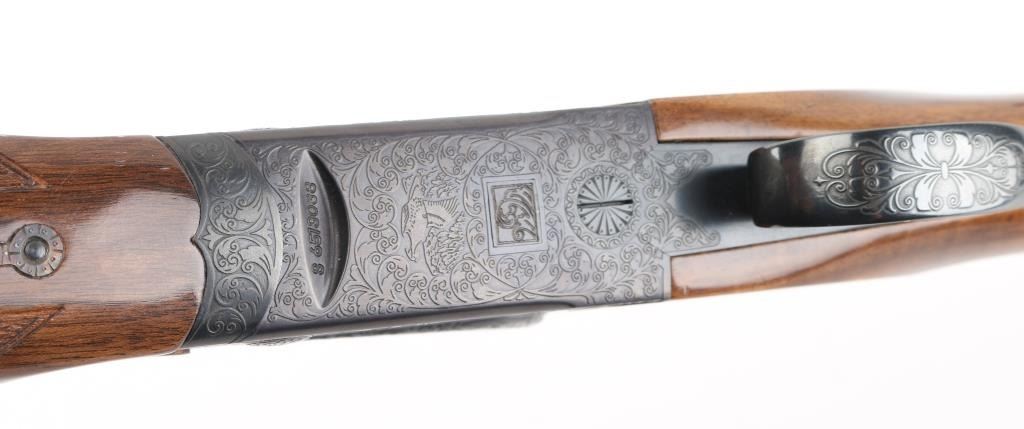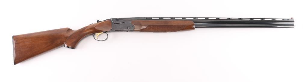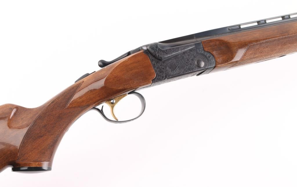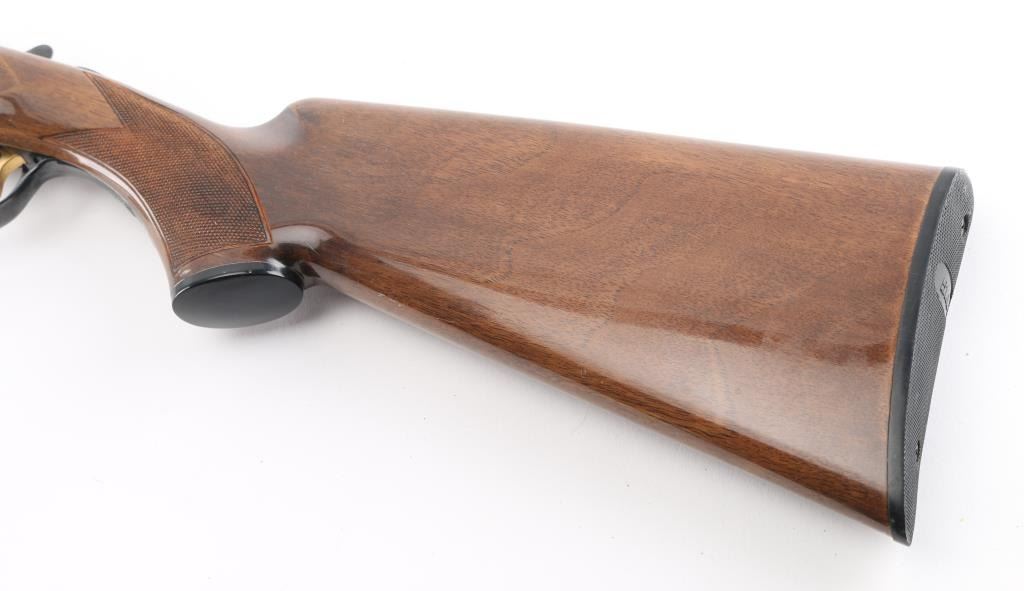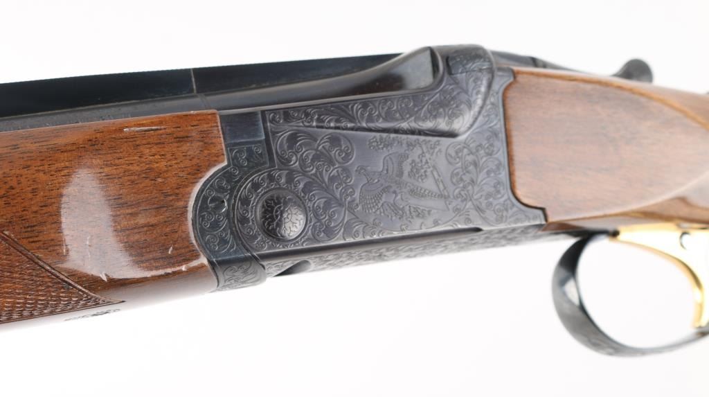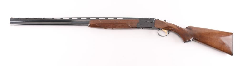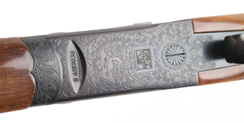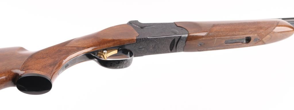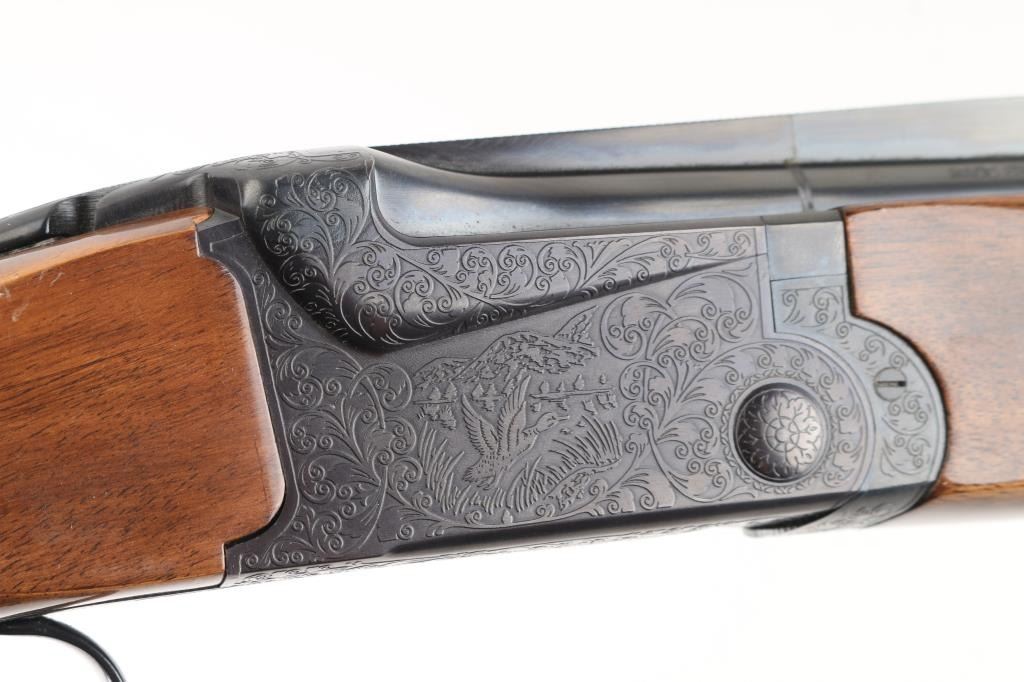 Made in Japan, over-under shotgun with 28" barrels; top barrel has a vent rib; bores are bright; metal finish is excellent; engraved side plates, bottom metal, tang and barrel release lever; checkered barrel release lever, serrated tang safety, smooth trigger, wood has a few scratches. LOP is 13 3/4". Fixed chokes, both measure between Mod & Full with drop-in gauge. **NRA Excellent** Modern Firearm