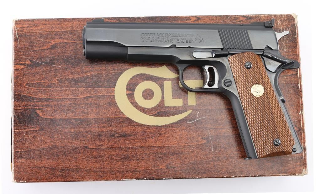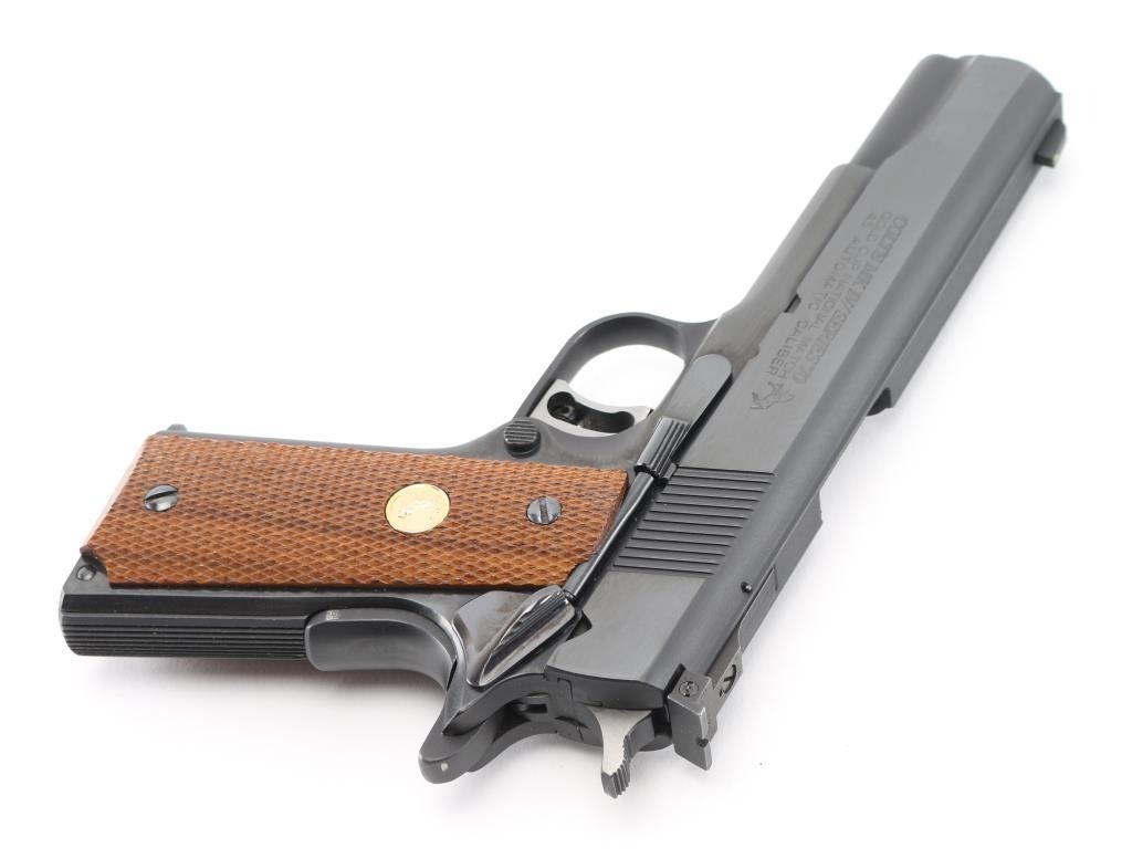 SN: 70N60402 'Mk IV Series 70' 1911A1 pattern single action semi-automatic target pistol manufactured circa 1978. Features matte blued finish with polished sides, 5" barrel, partridge front sight, Elliason adjustable rear sight, serrated adjustable trigger, serrated hammer spur, thumb safety on the left side of the frame, grip safety, push button magazine release, steel frame, flat arched mainspring housing, checkered wood grips with gold color Colt medallions. Bore is excellent condition. Retains 98% blue with minor handling marks. Grips are near perfect. Includes Colt styrofoam box with wood grain cardboard sleeve, manual, bushing wrench, (1) magazine. Condition is NRA Excellent - like new *** Modern Firearm *** [From the Jim Sigmon Collection]